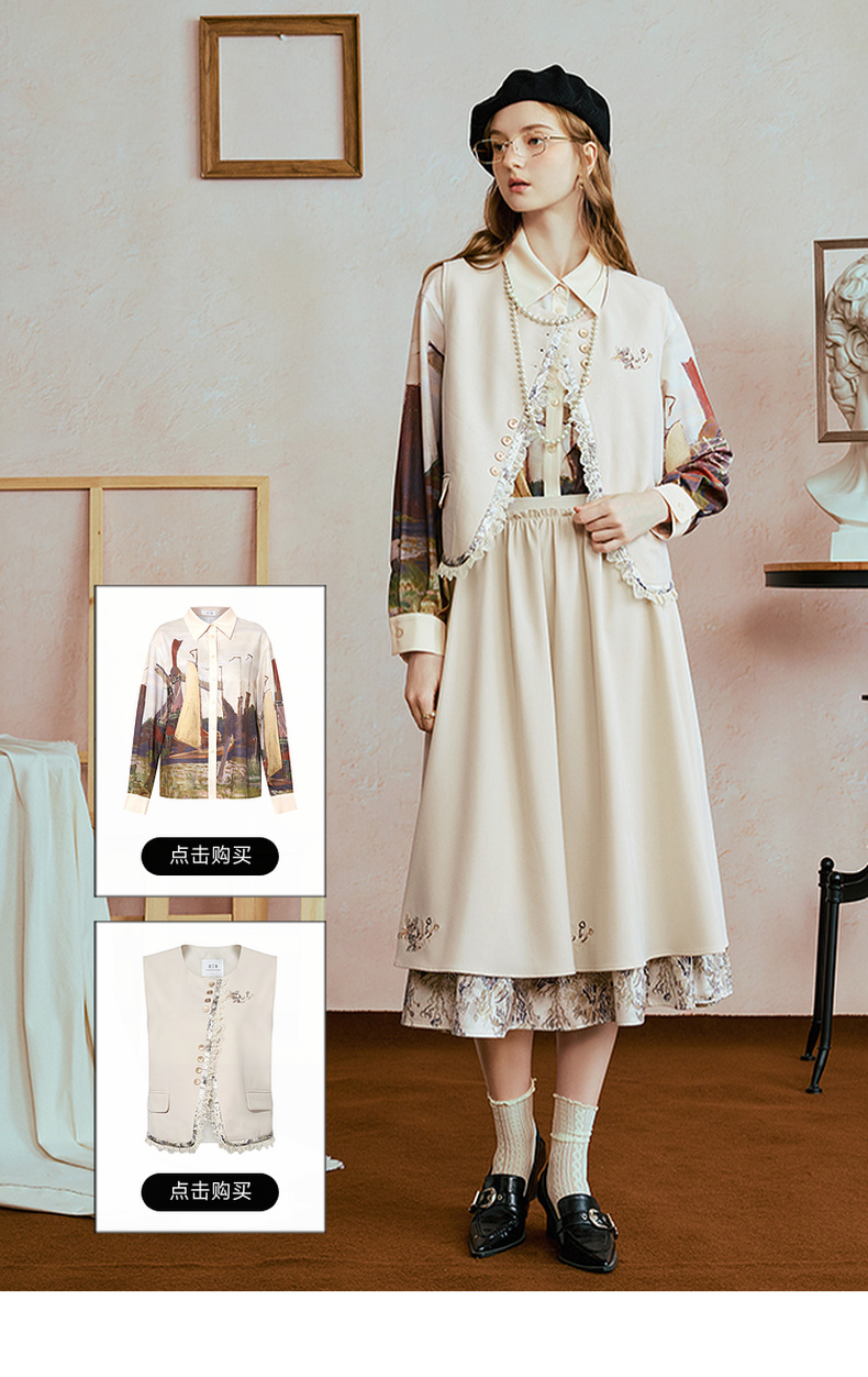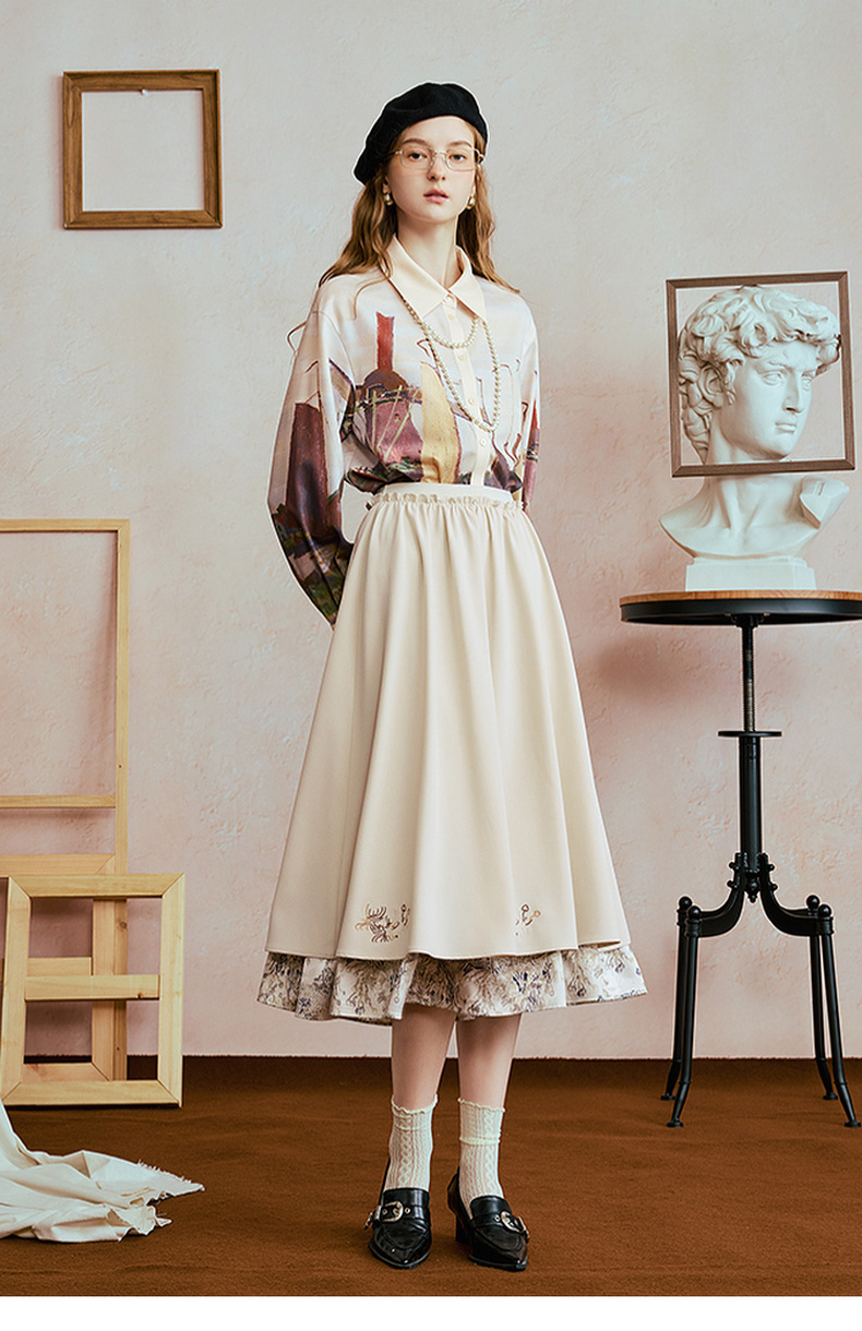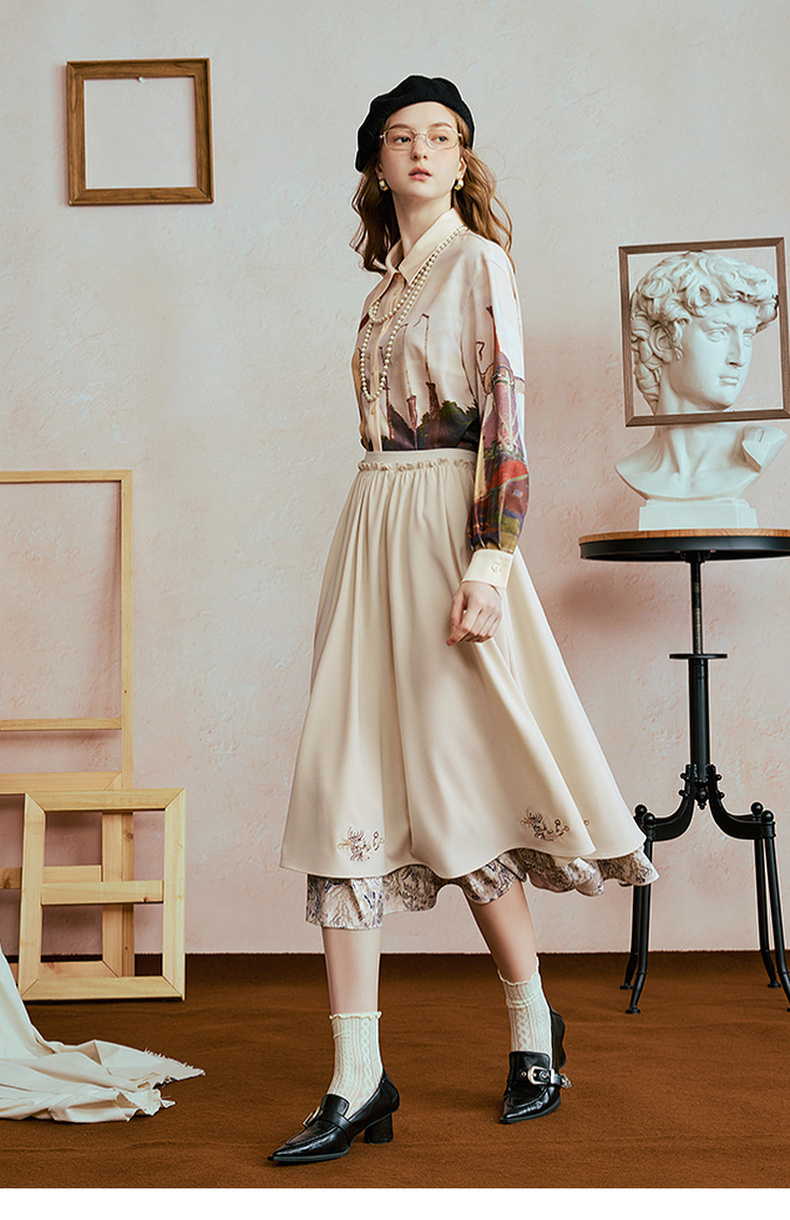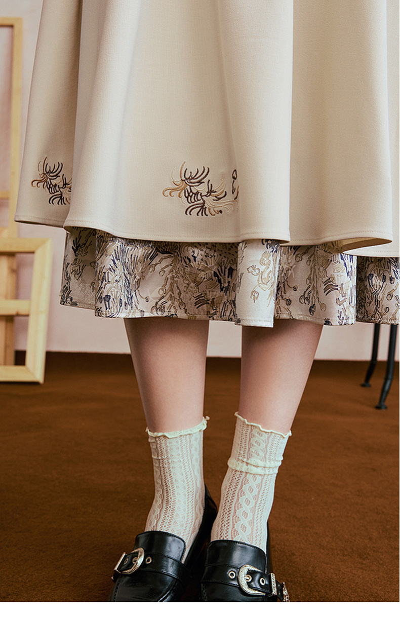 两三事梵高文艺栖光掠影2025秋季新款复古刺绣双层裙摆a字半身裙