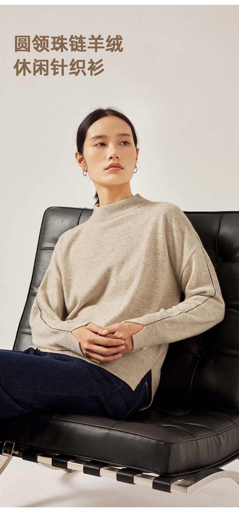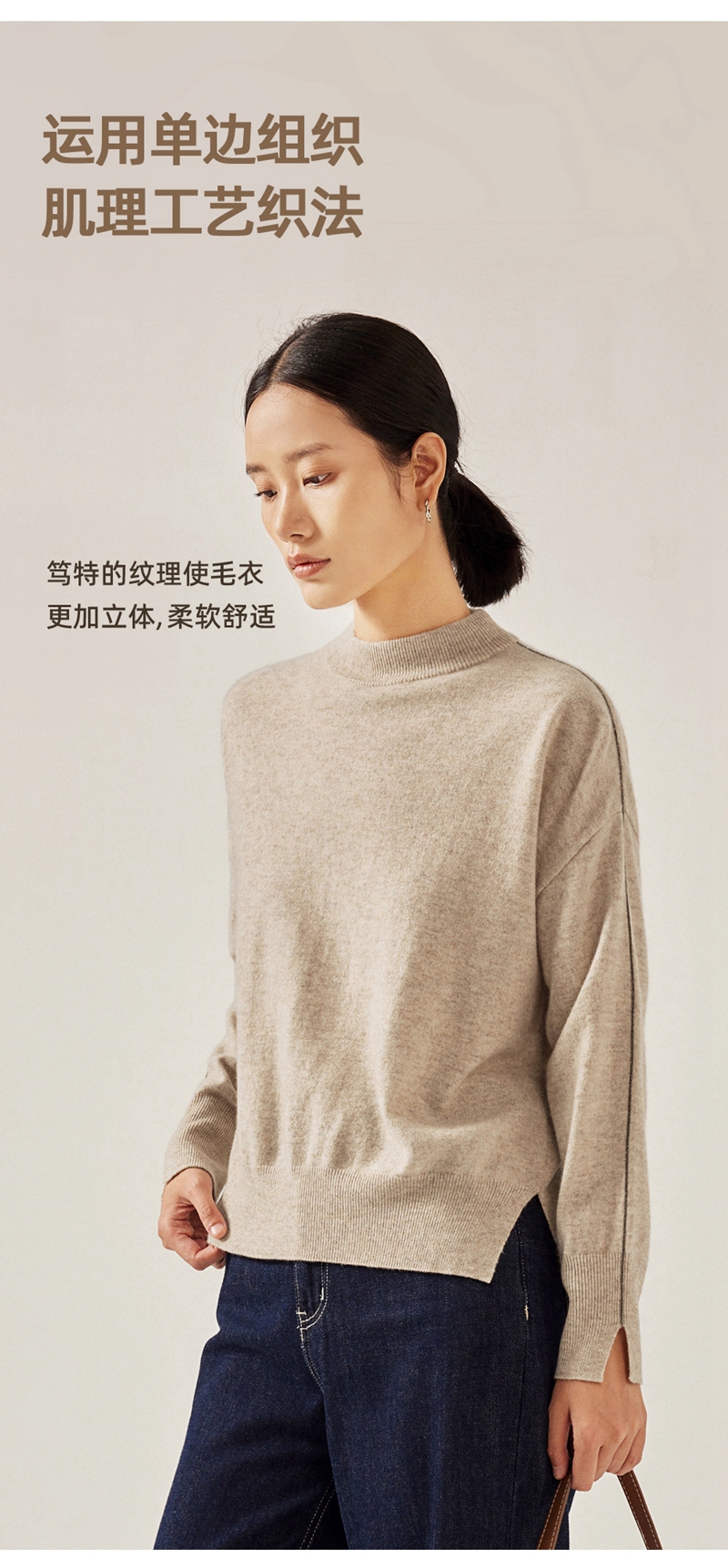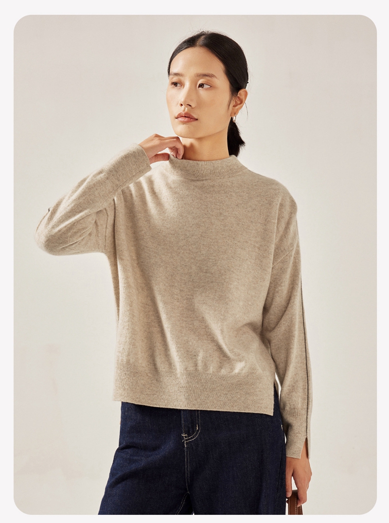 山羊绒圆领落肩长袖侧开叉套头毛衣