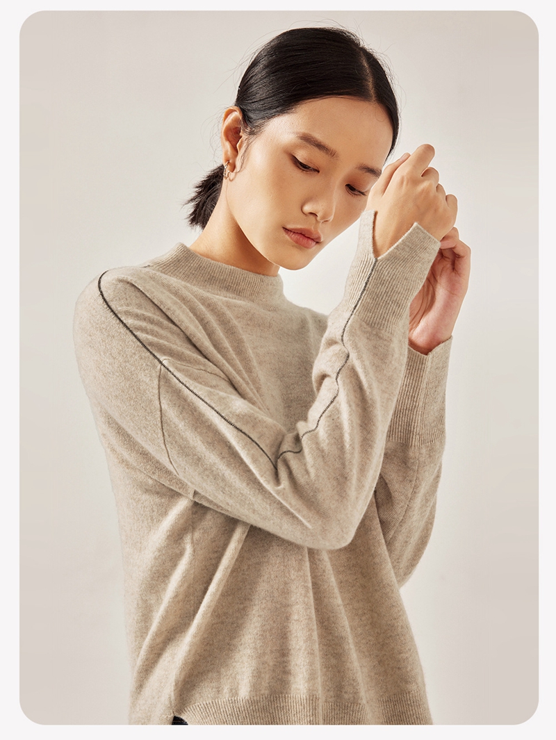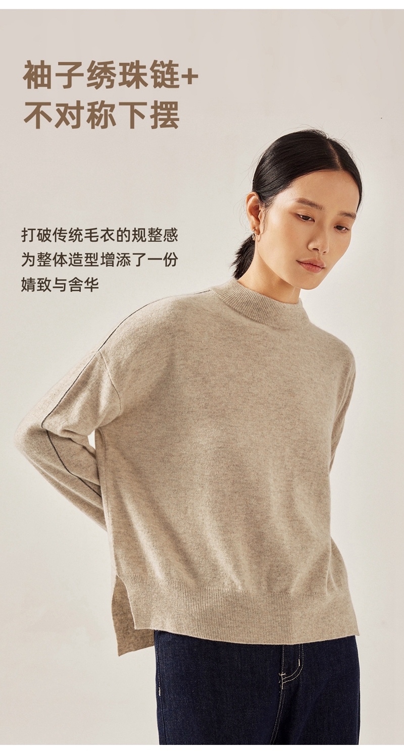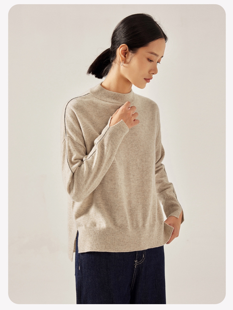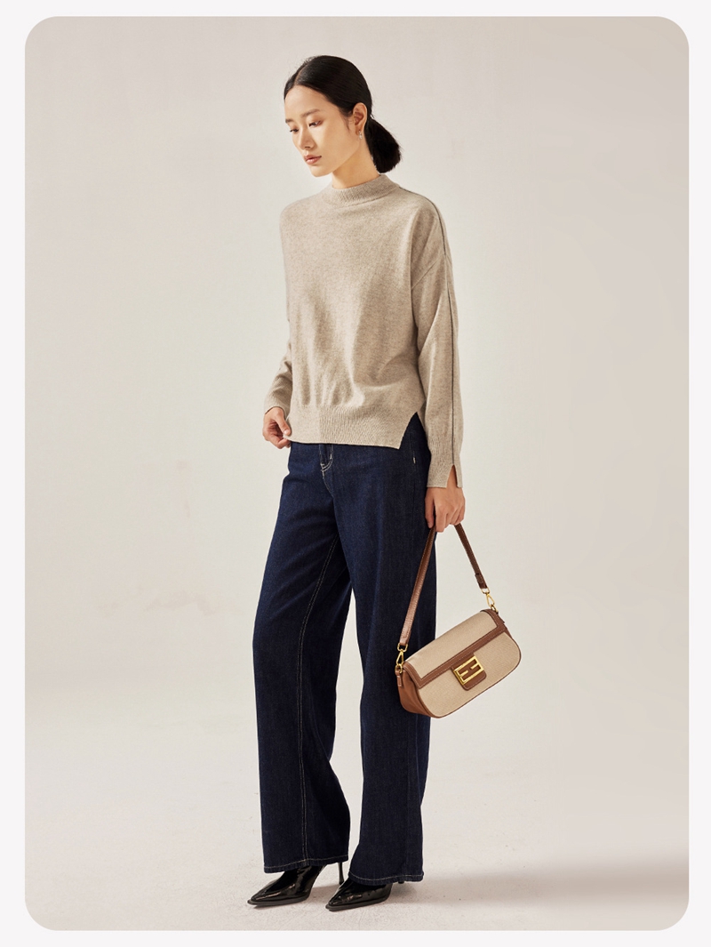 山羊绒圆领落肩长袖侧开叉套头毛衣