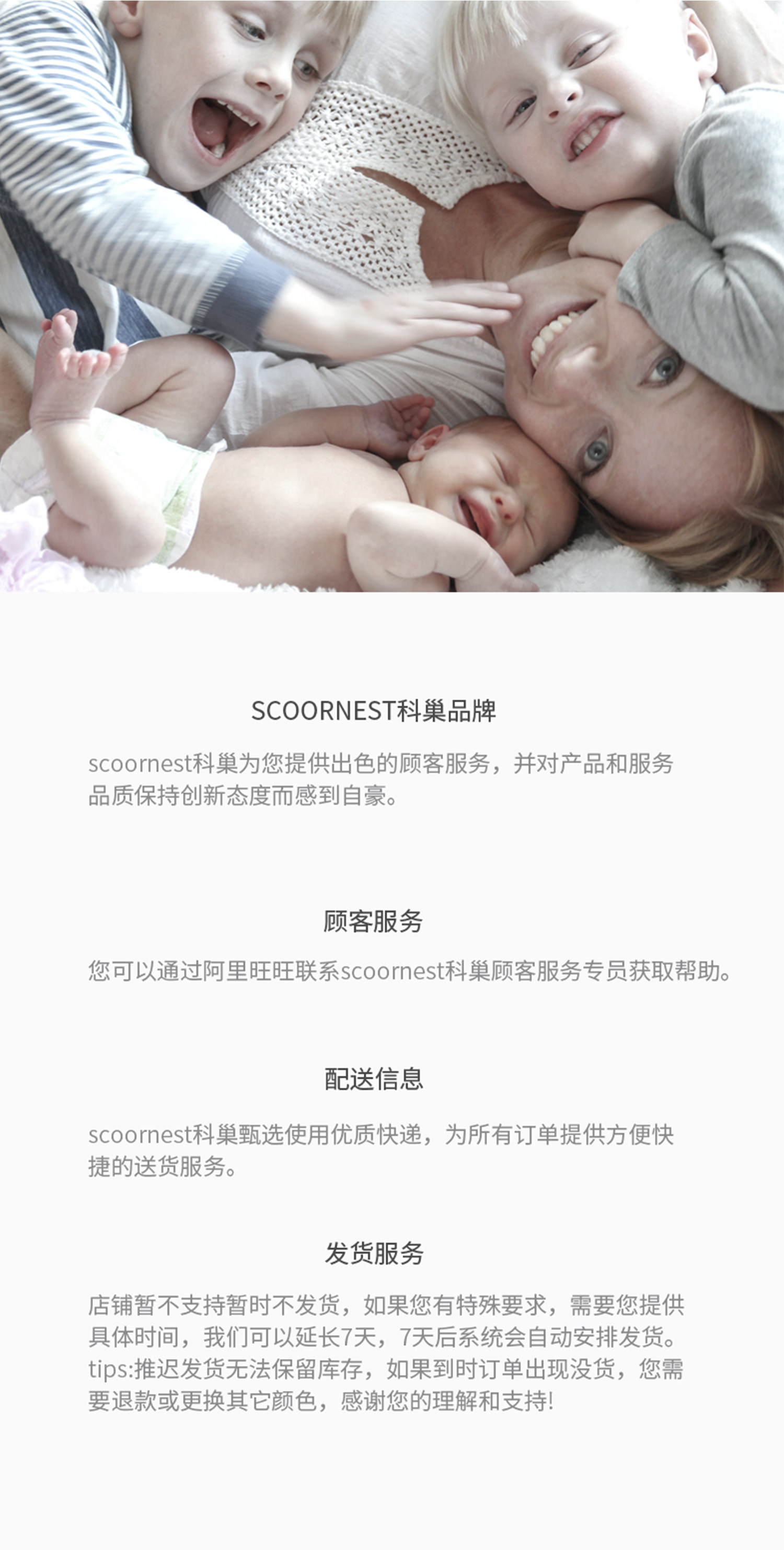 - Scoornest始终秉承给每一位宝宝送去科学的、关心的、创新的成长体验,通过提供商品和服务,使顾客形成守护、发展、巩固这种弥足珍贵的亲情的爱。