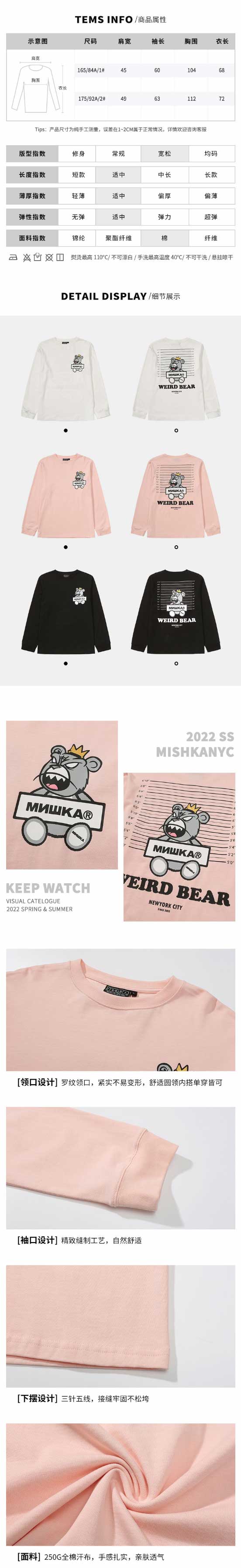 MISHKA2022春夏新品 KA爷熊系列印花长袖T恤男女同款M21100015M