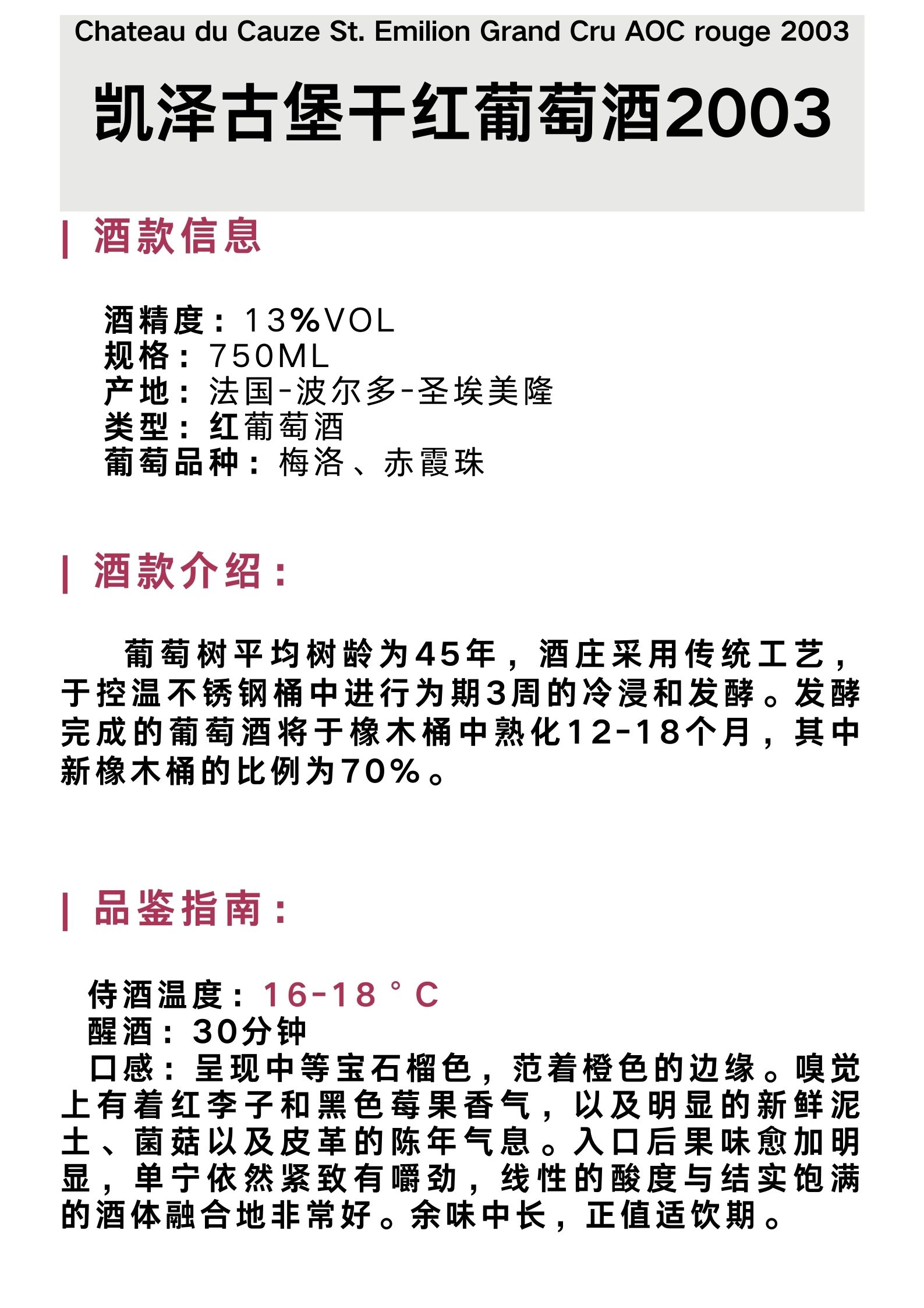 凯泽古堡干红葡萄酒2003 Chateau du Cauze St. Emilion Grand Cru AOC rouge 2003