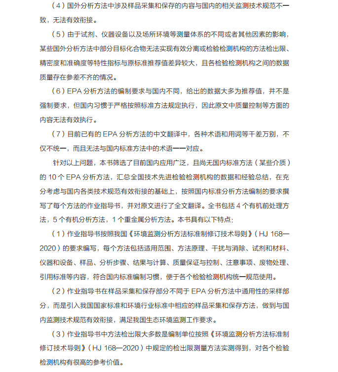 本书筛选了目前国内应用广泛,且尚无国内标准方法(某些介质)的10个EPA分析方法,以忠实原文为基本原则,汇总全国先进检验检测机构的数据和经验总结,在充分考虑与国内各类技术规范有效衔接的基础上,按照国内标准分析方法编制的要求撰写了每个方法的作业指导书,并对原文进行了全中文翻译。全书包括4个有机前处理方法,5个有机分析方法,1个重金属分析方法。