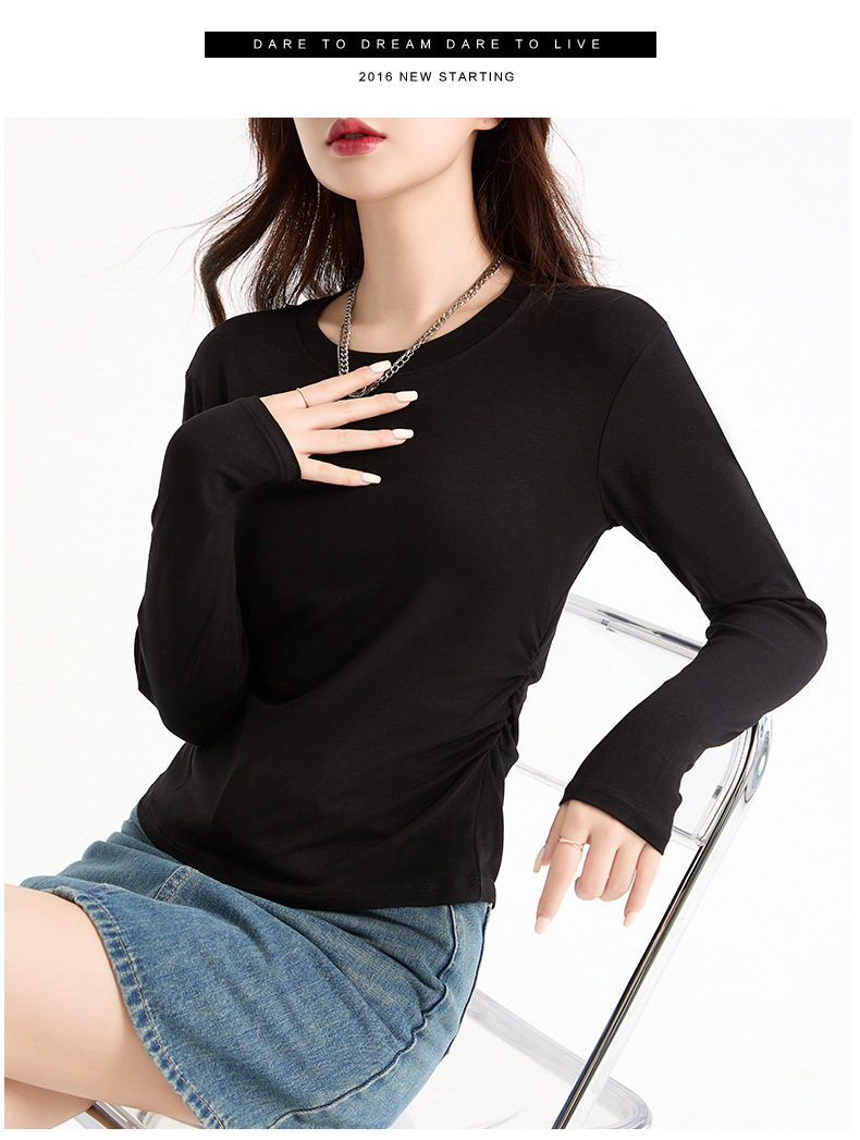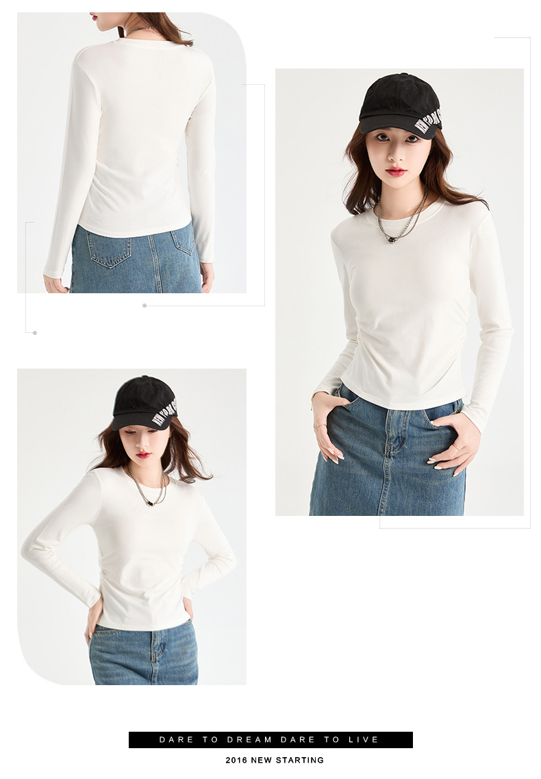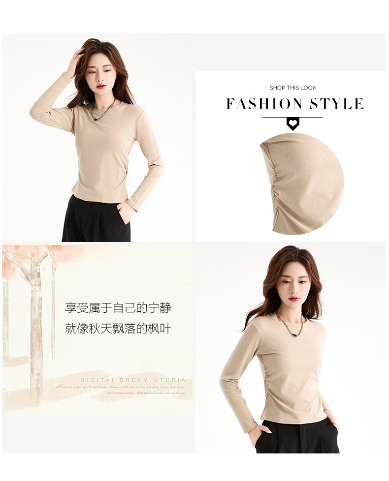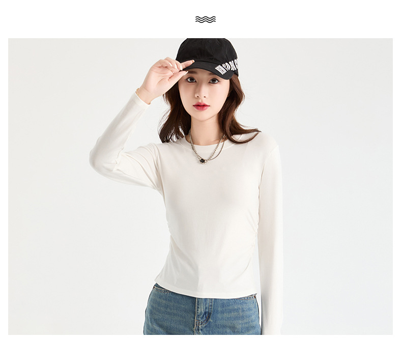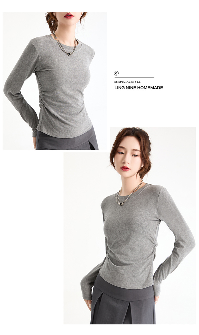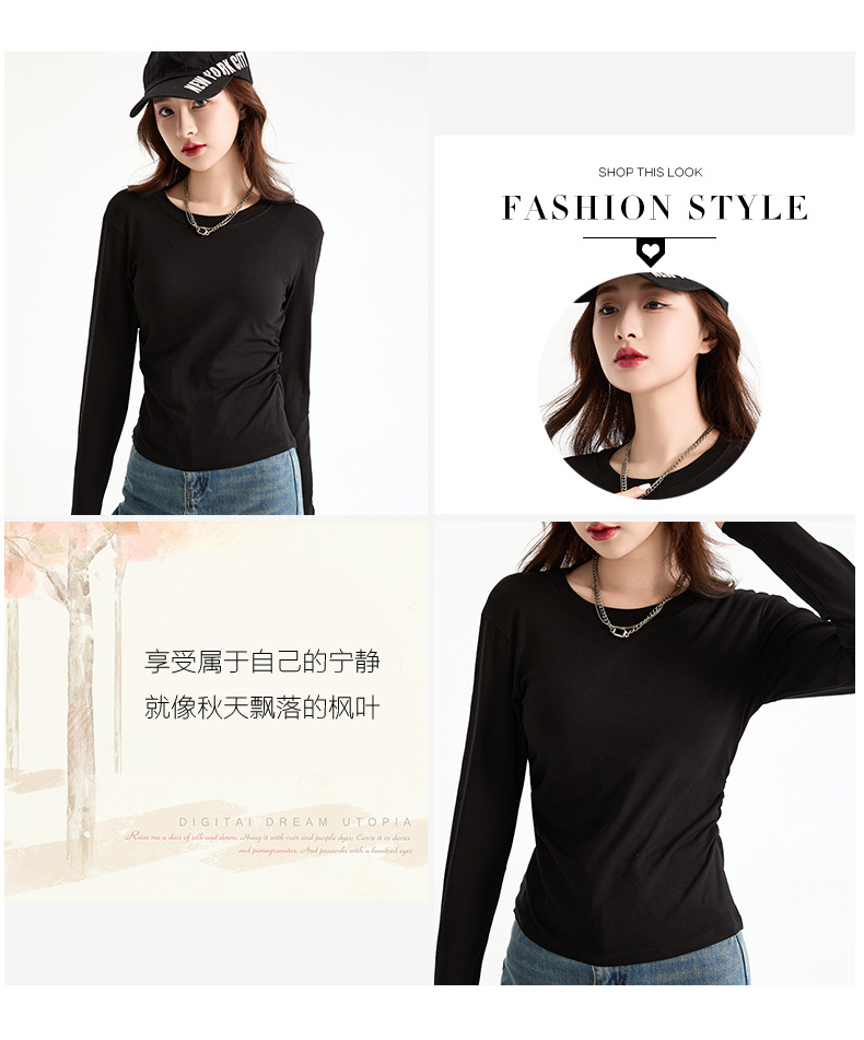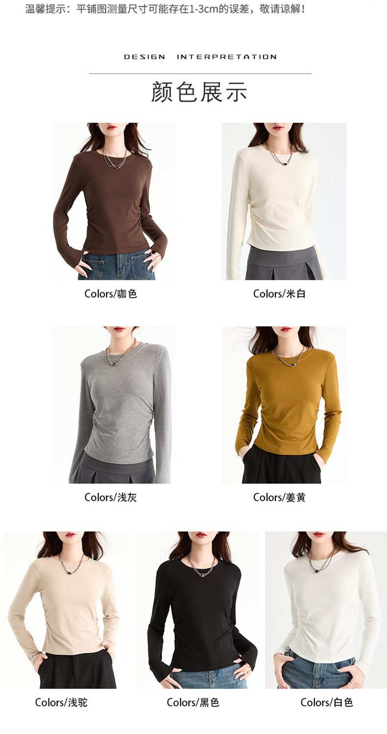 设计感褶皱圆领打底衫女秋季新款修身显瘦收腰不规则打底上衣长袖