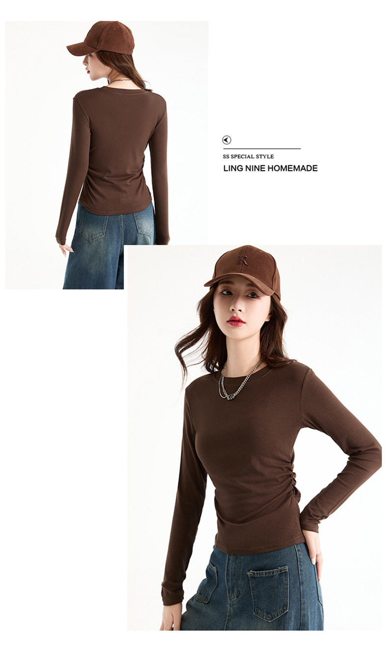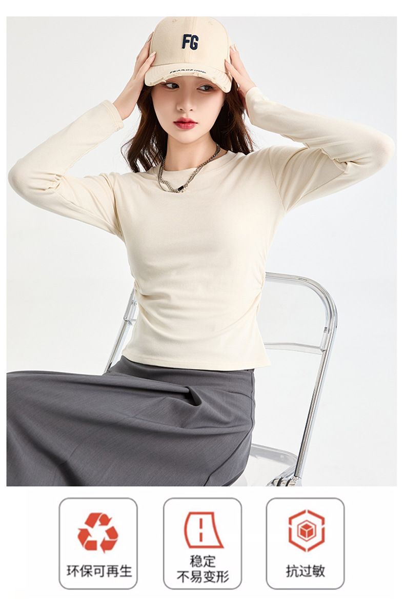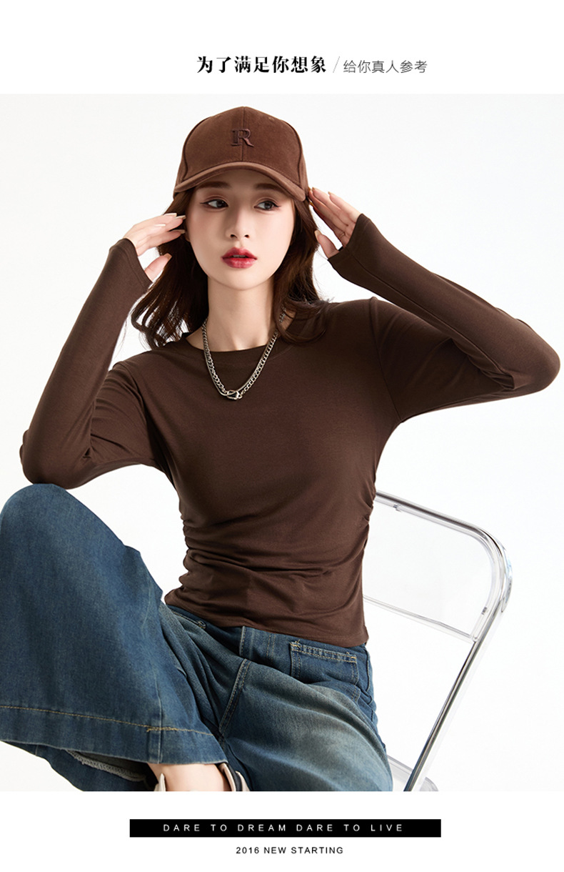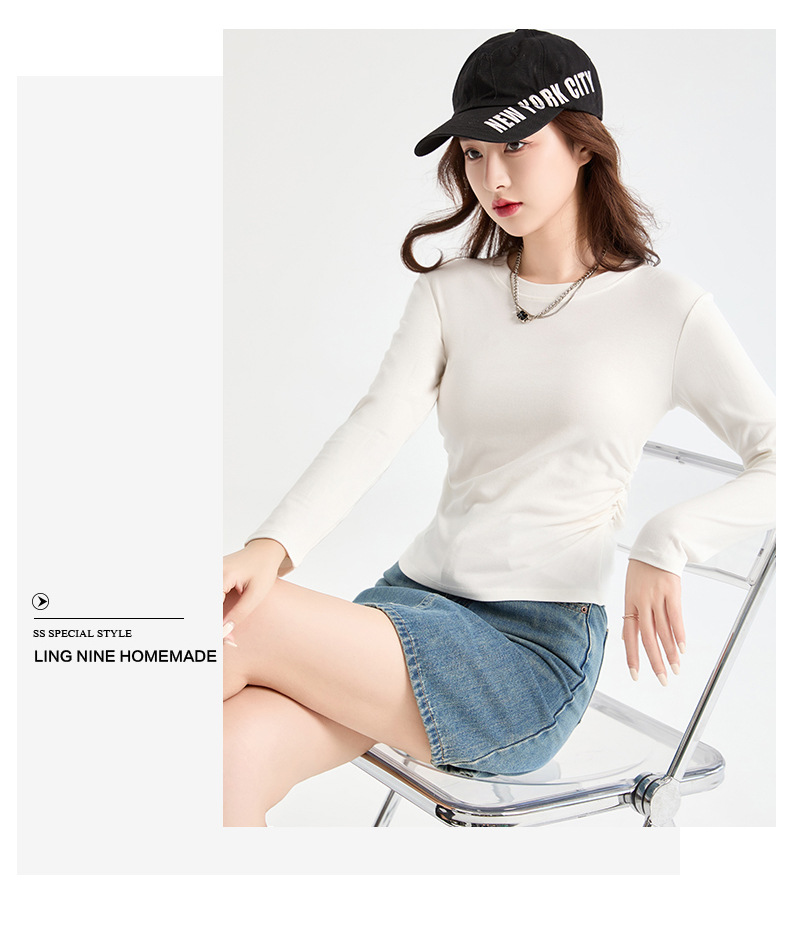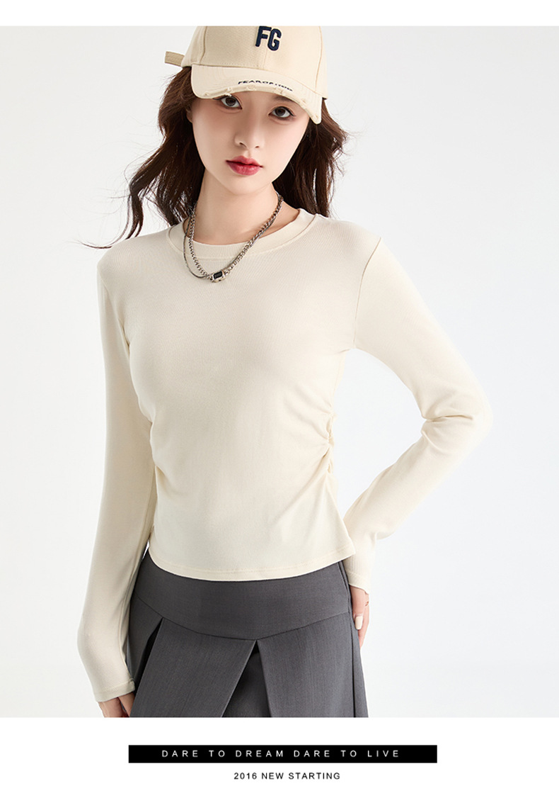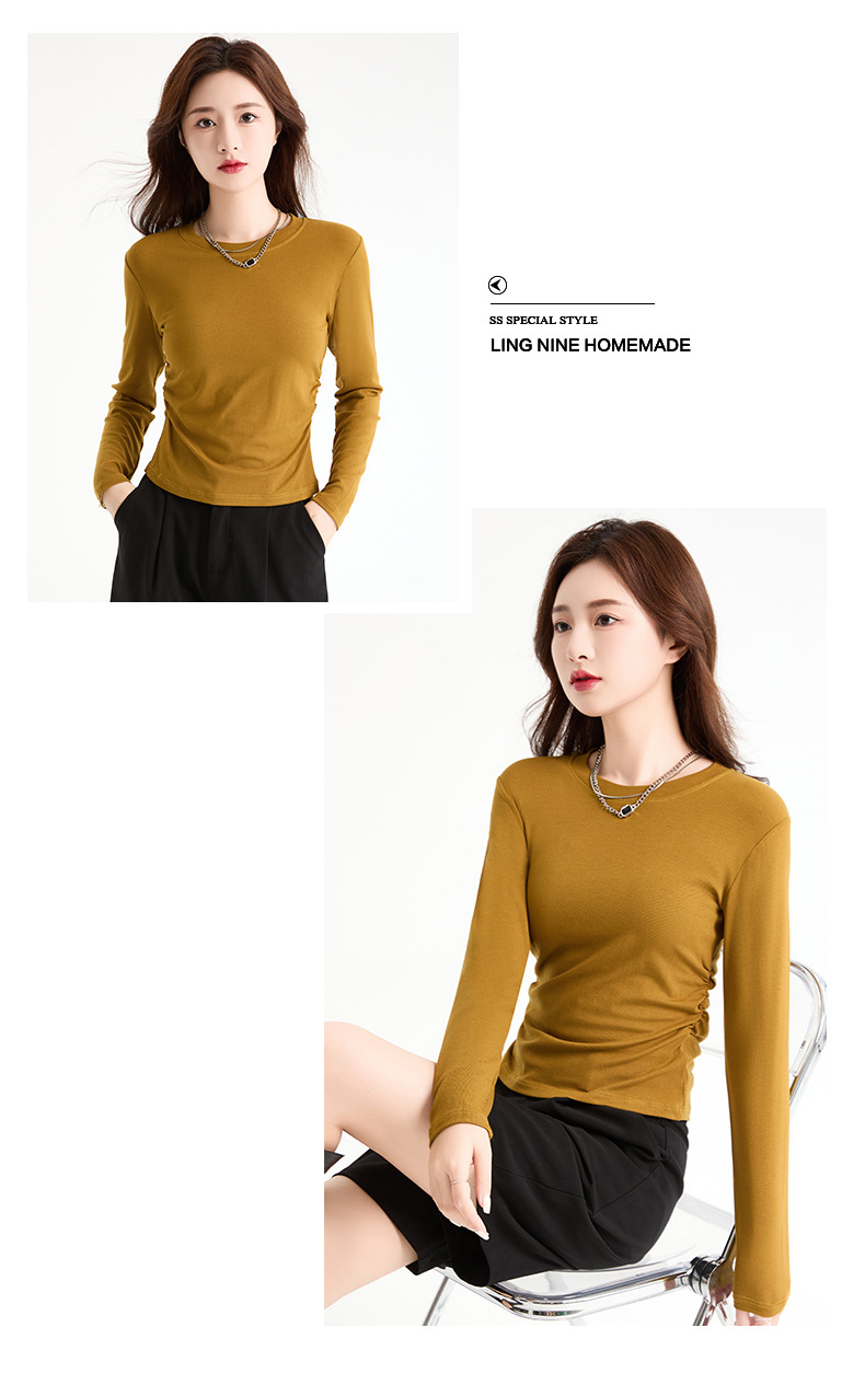 设计感褶皱圆领打底衫女秋季新款修身显瘦收腰不规则打底上衣长袖