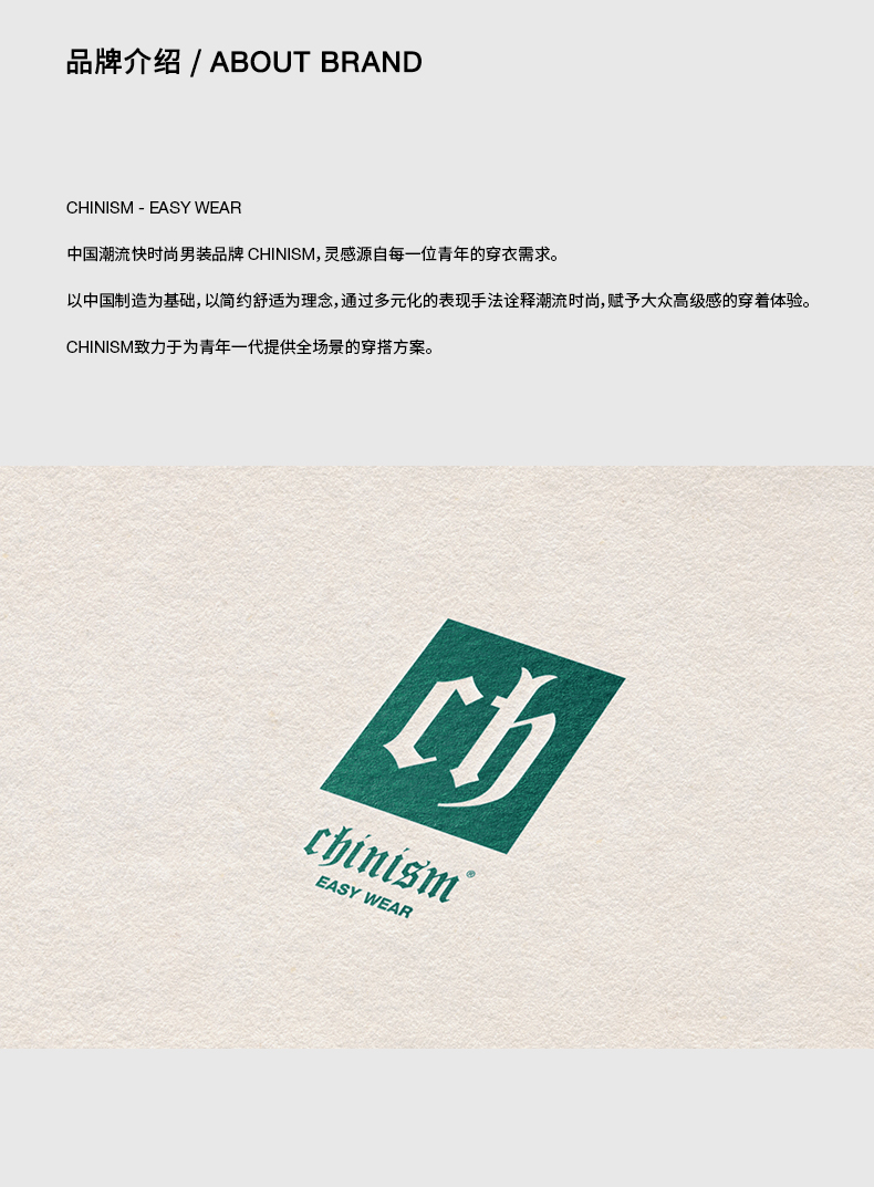 中国潮流快时尚男装品牌 CHINISM ,始创于2012年,正式成立于2014年。灵感源自每一位青年的穿衣需求。CHINISM - EASY WEAR