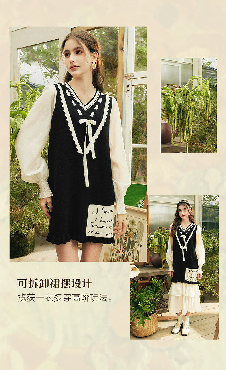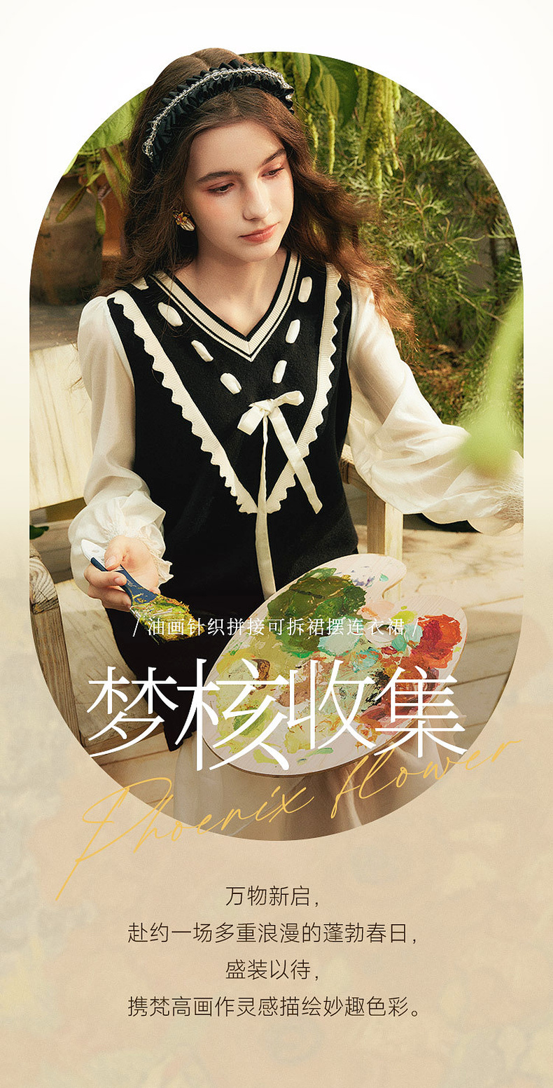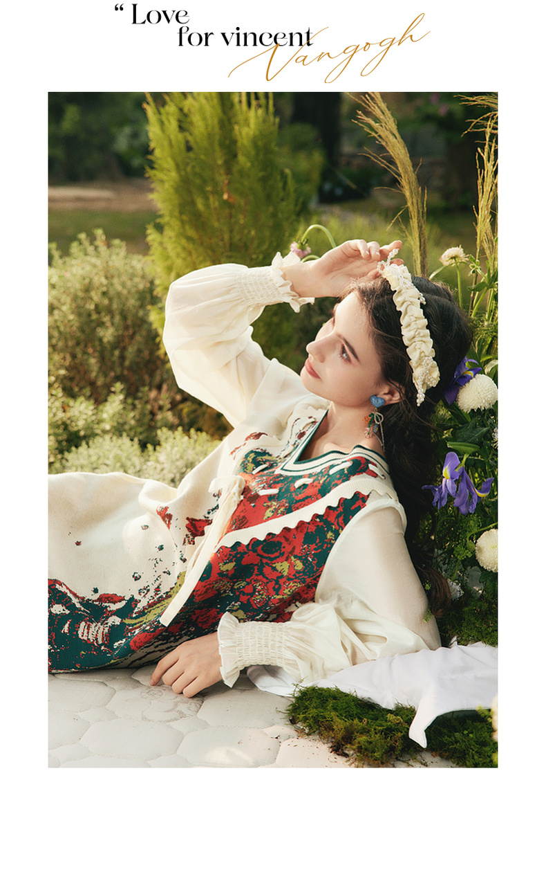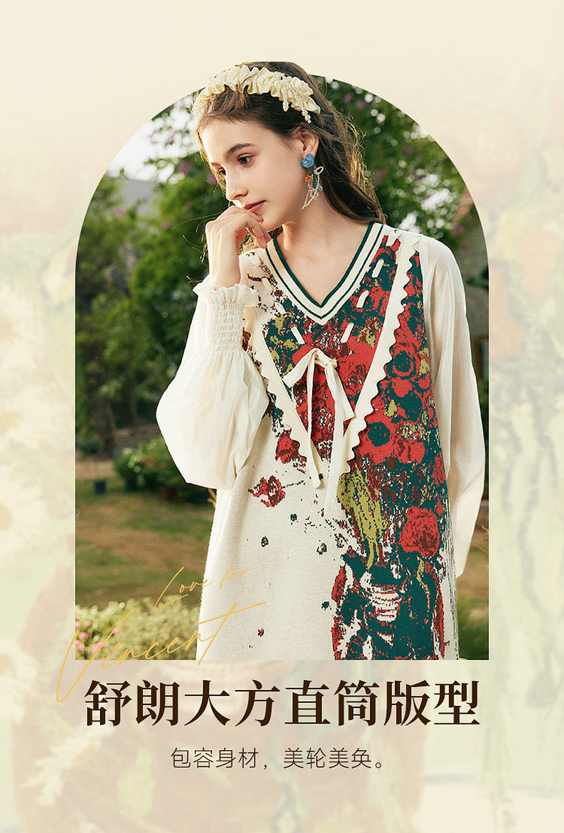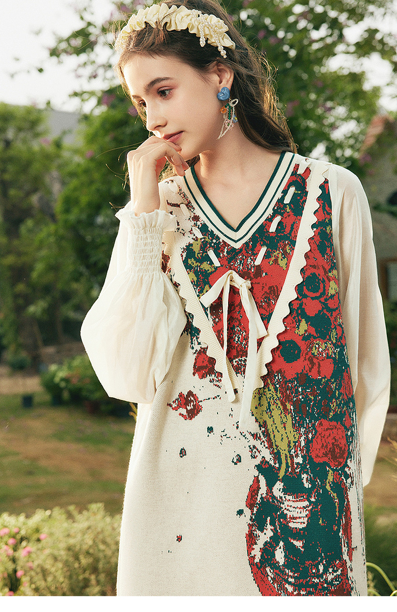 两三事梵高文艺梦核收集新款油画针织拼接可拆裙摆连衣裙