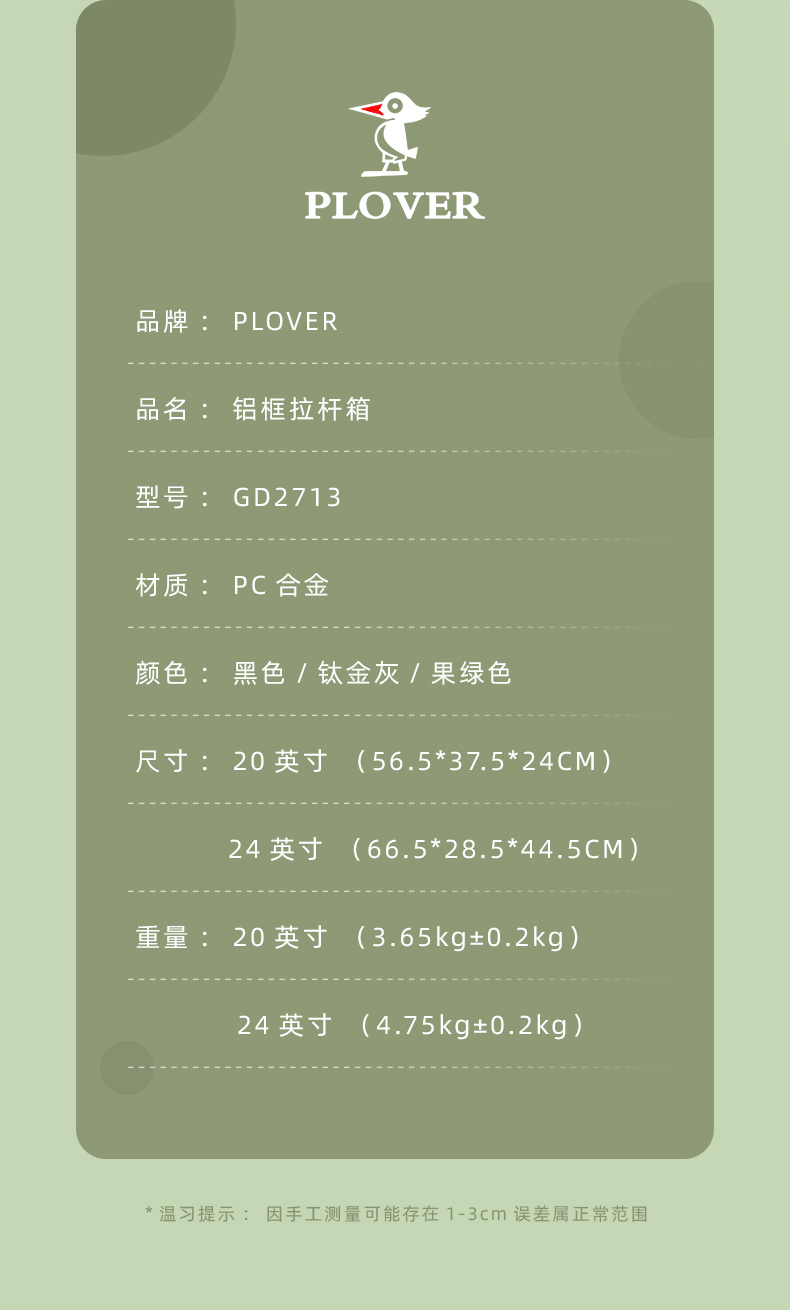【自营】PLOVER香港啄木鸟 20英寸铝框拉杆箱 登机箱男女大学生时尚出行