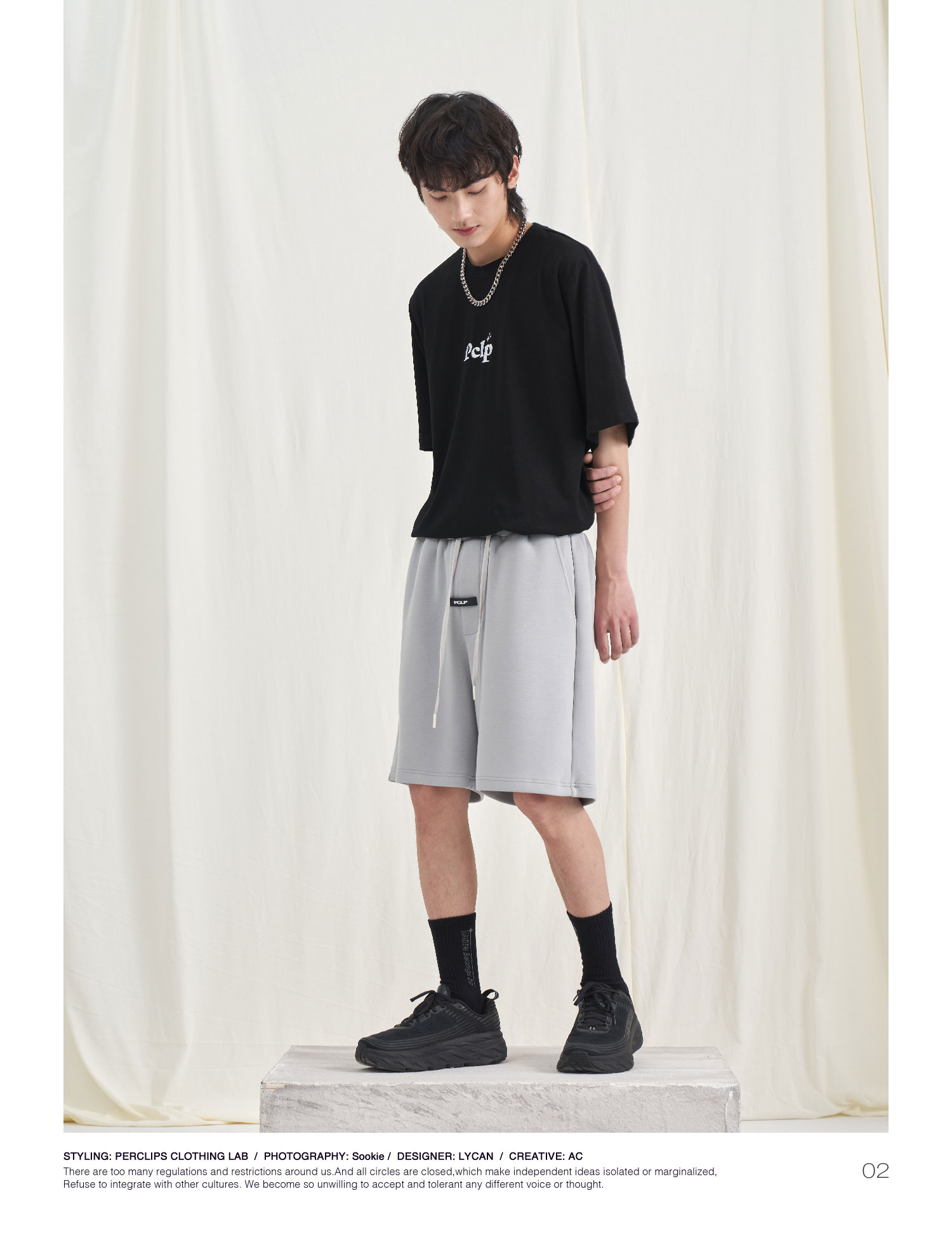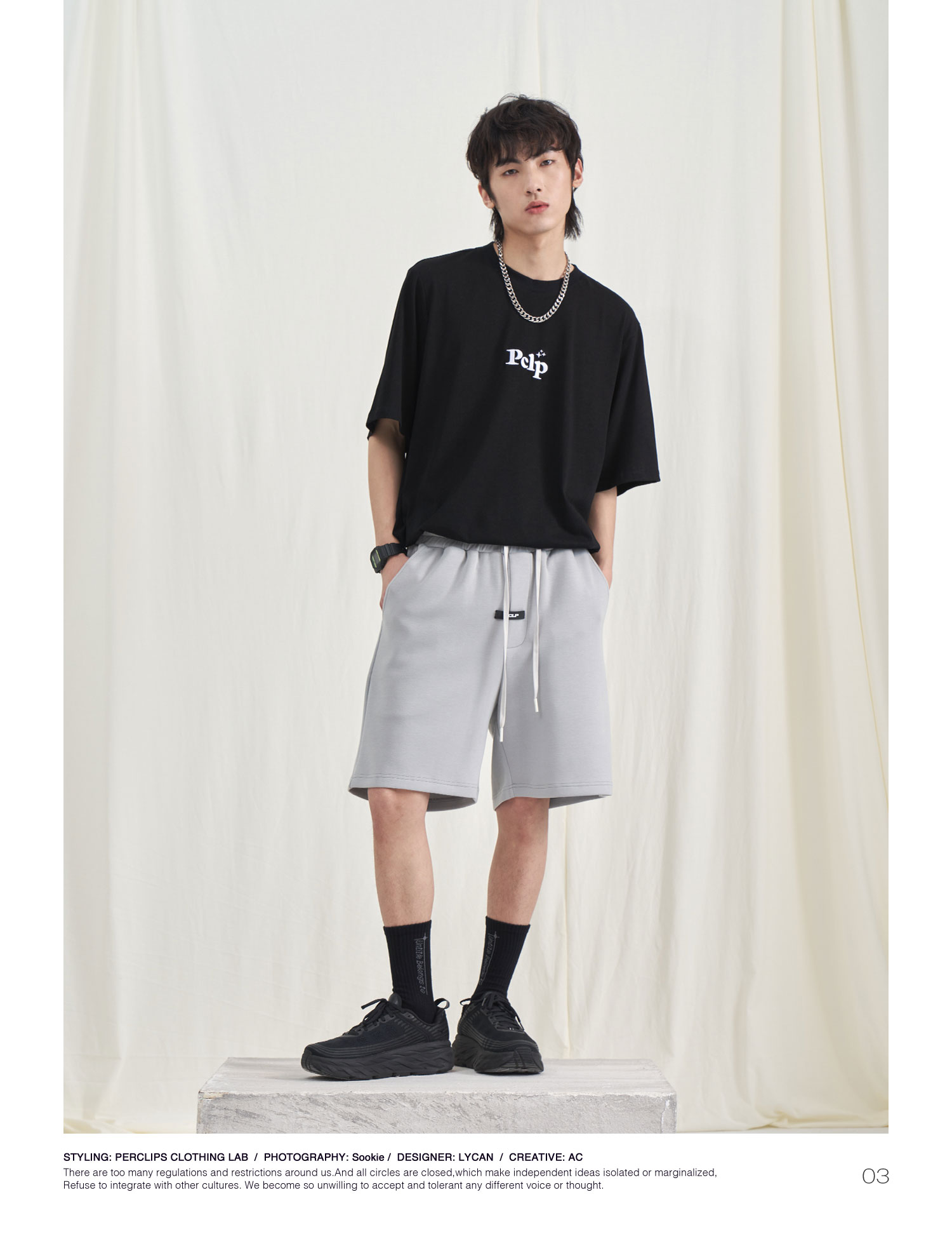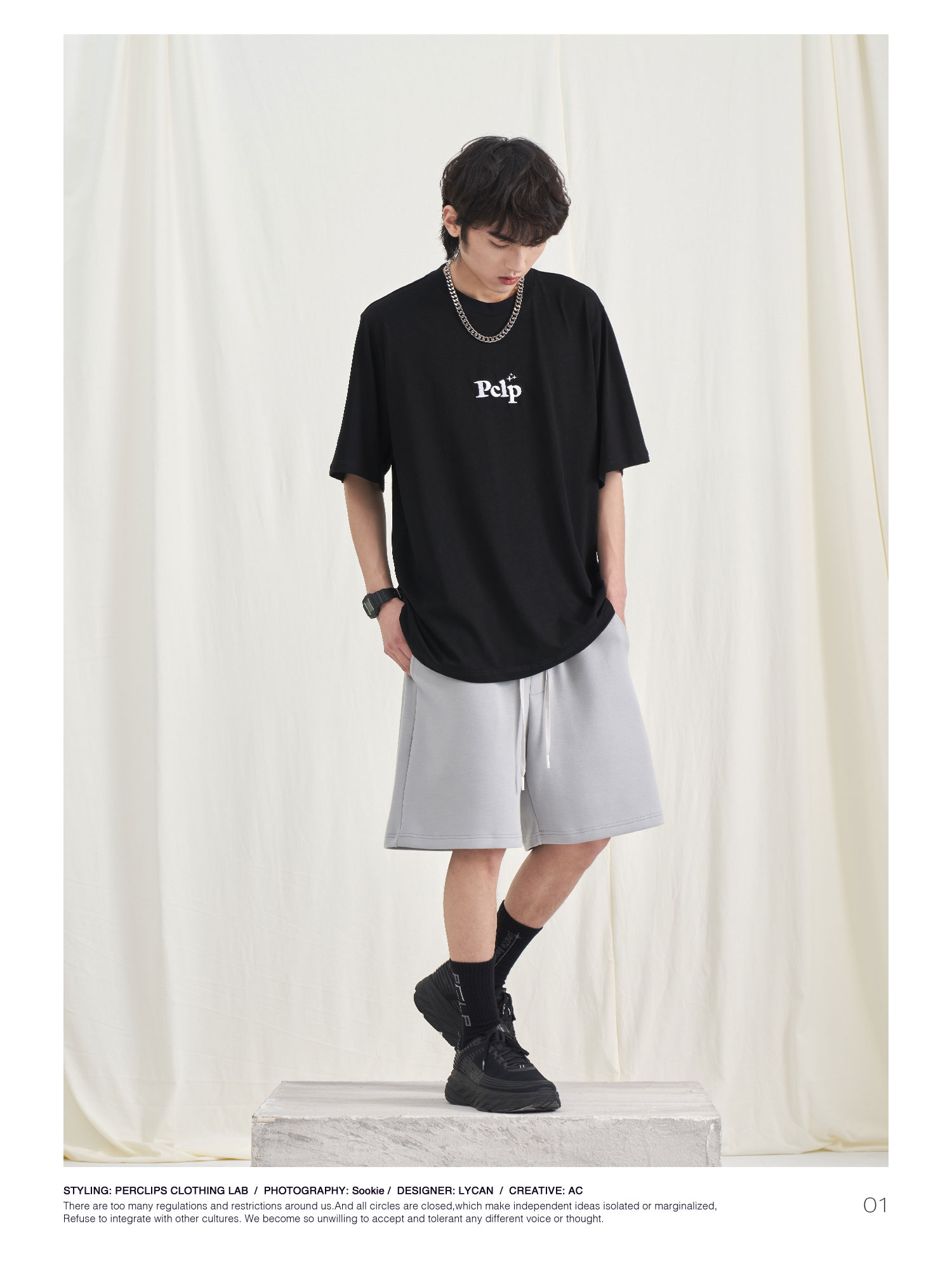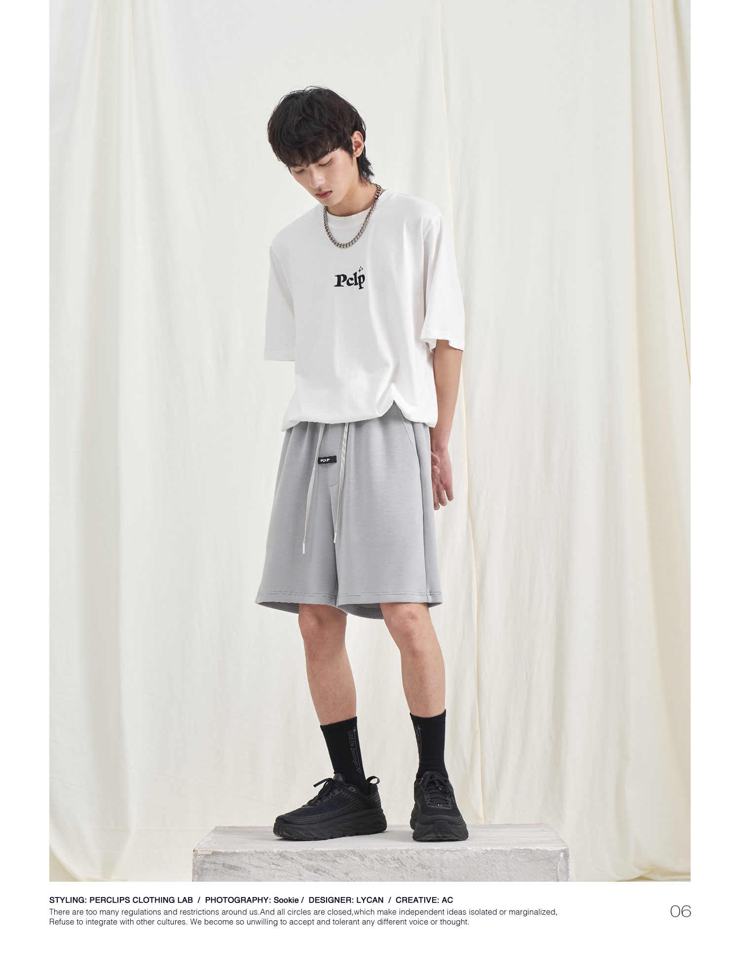 PCLP(PERCLIPS) 胶牌抽绳短裤 国潮牌潮流夏季宽松休闲运动五分裤