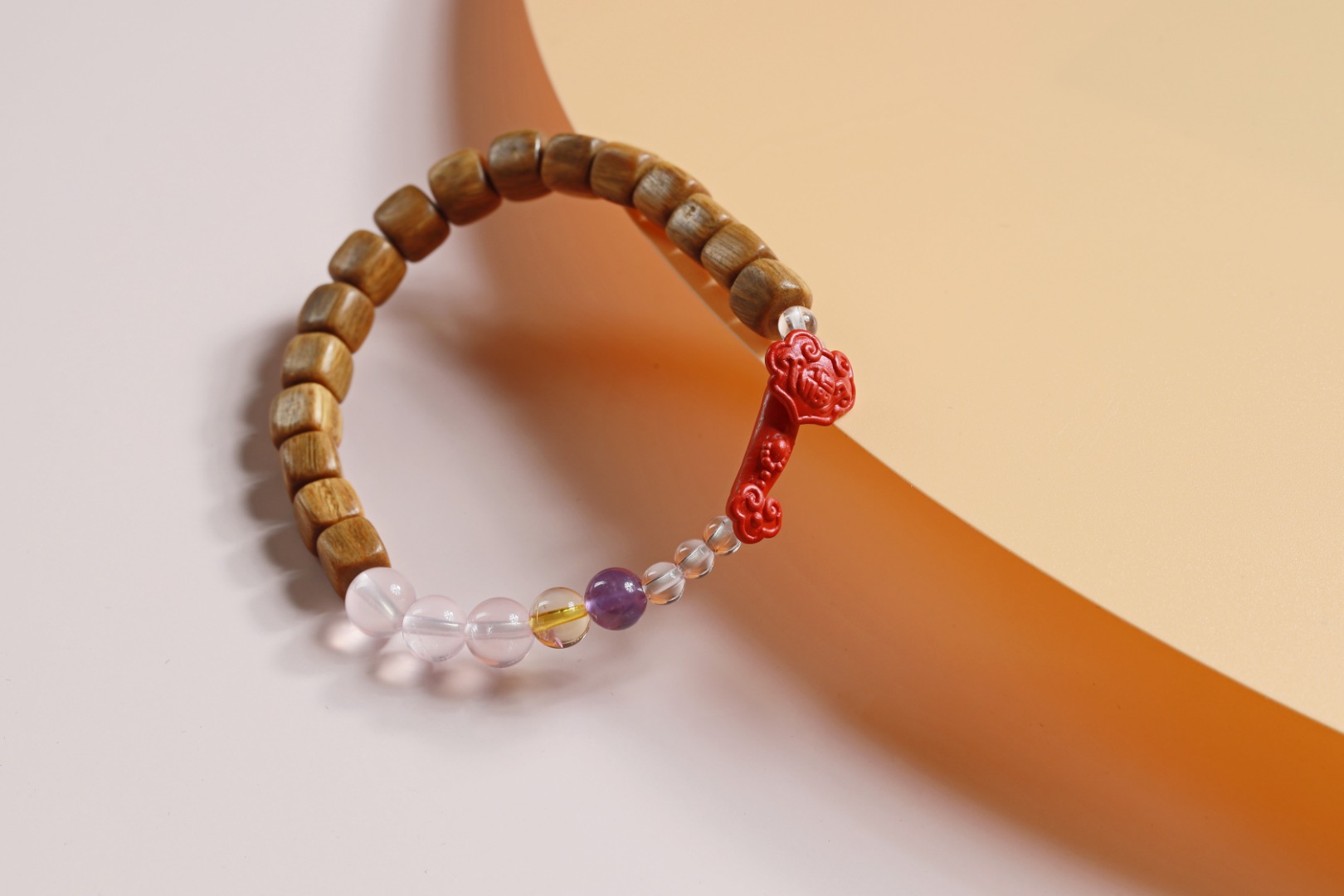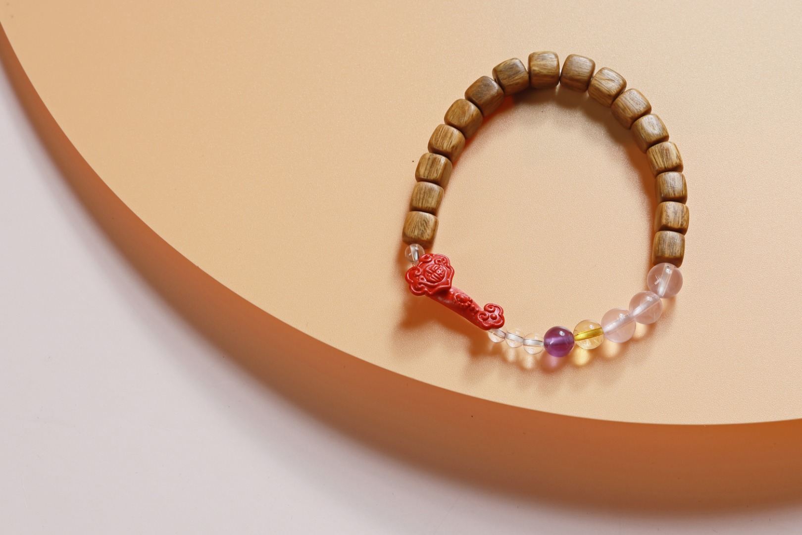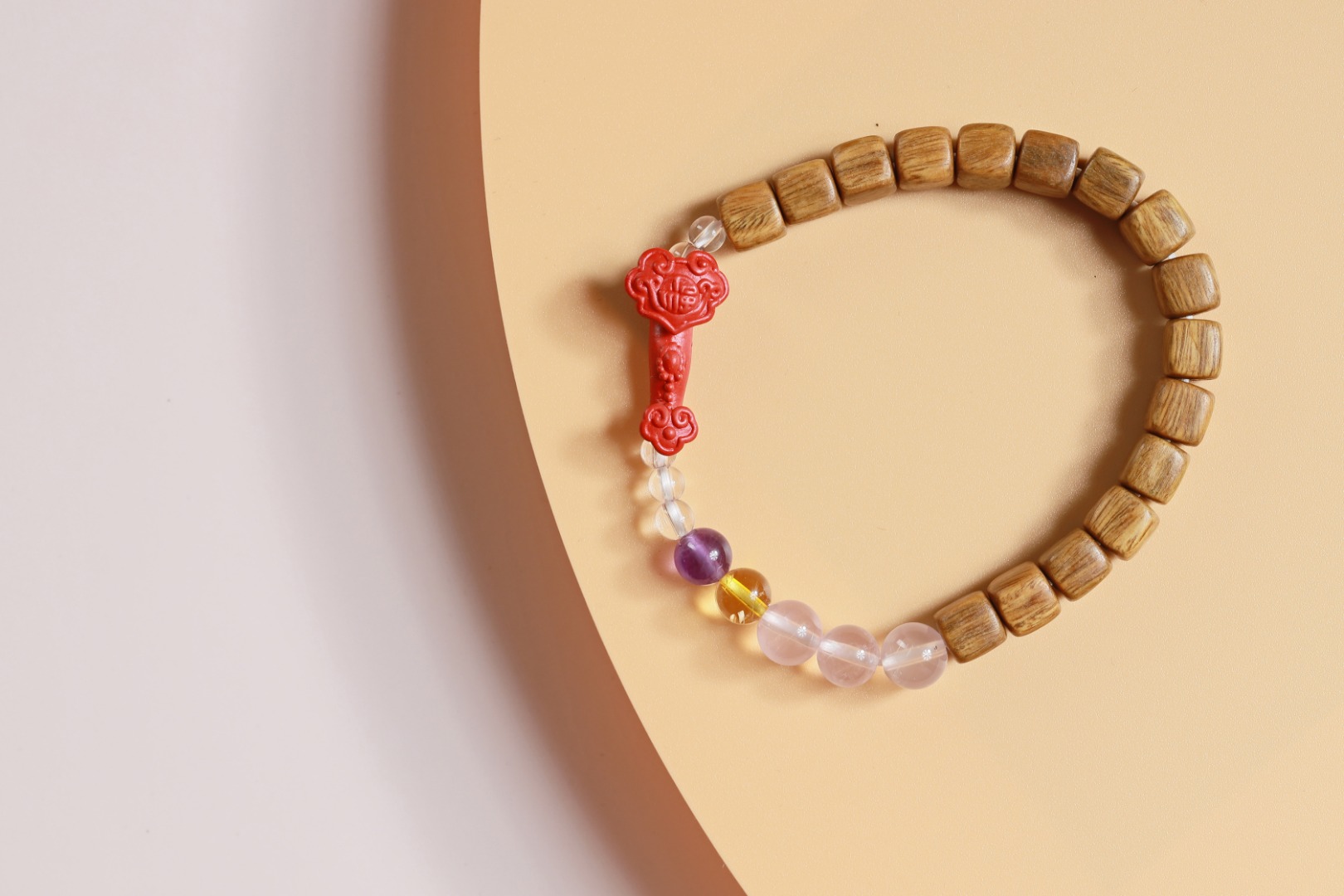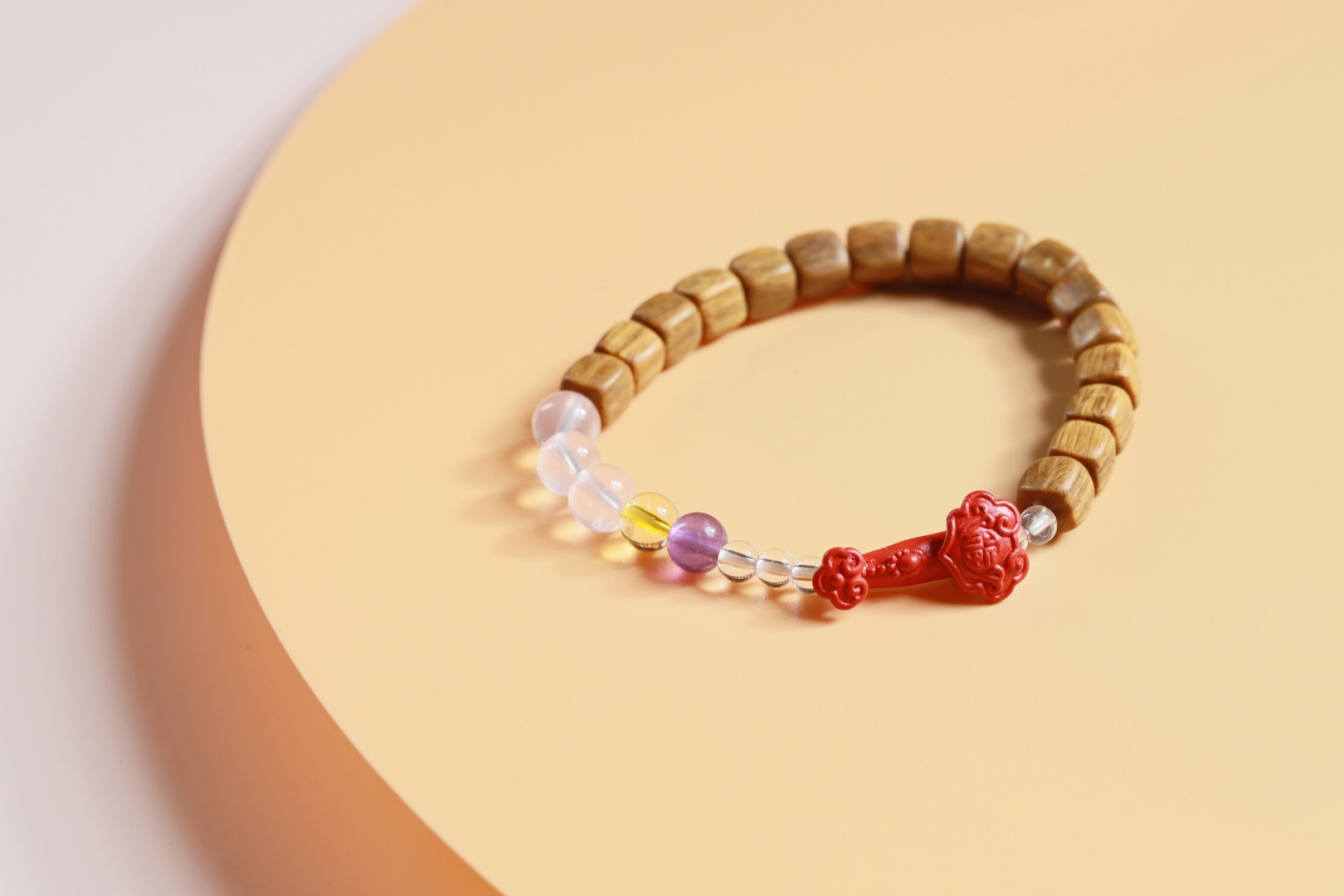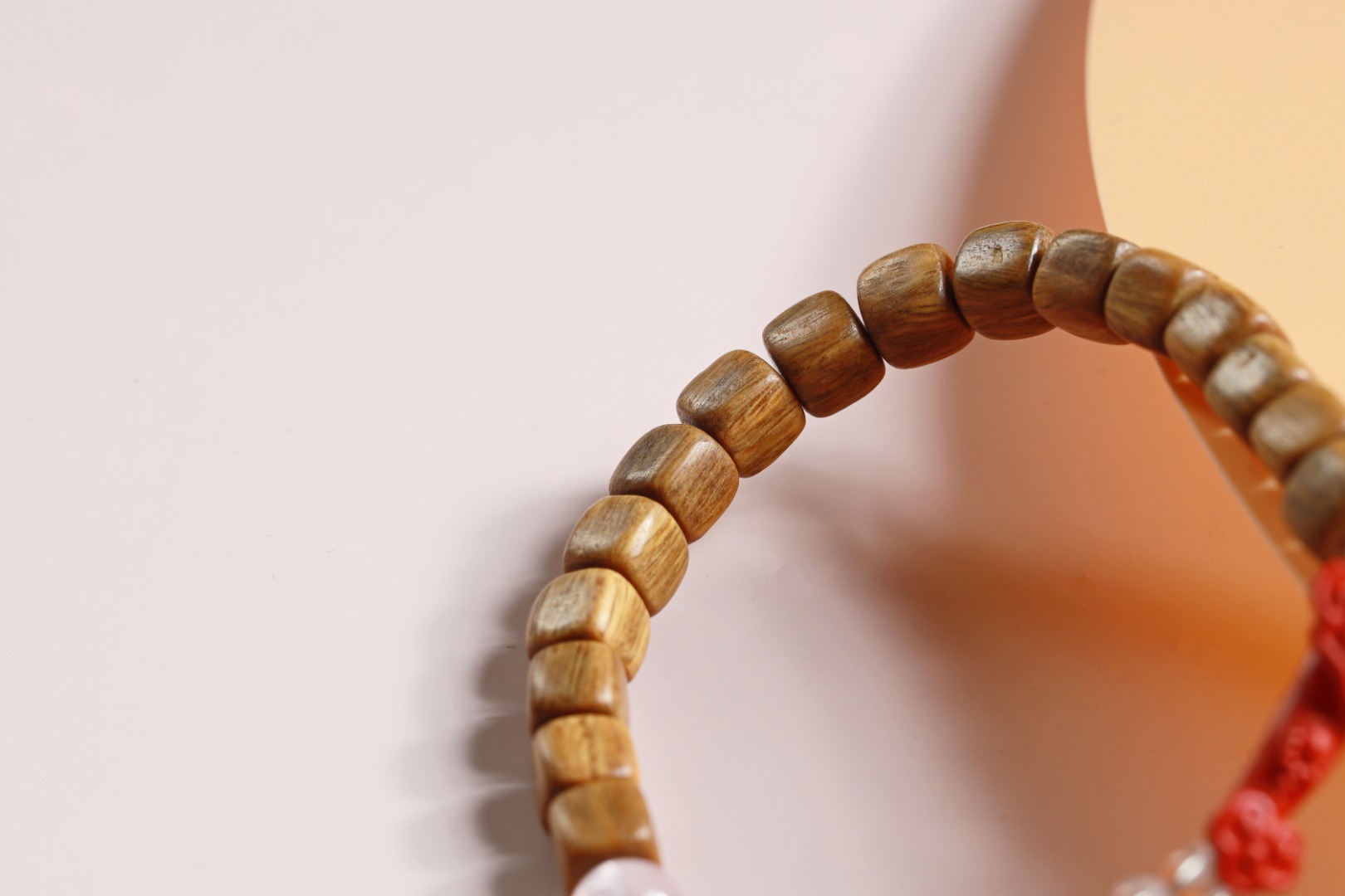 用珠串画一副宋韵春色,一条温柔优雅的混搭檀木手链,檀木小冰糖的造型,这四四方方寓意四方来财,搭配多宝水晶,清新淡雅又带着独有魅力,多宝水晶寓意转好运,结良缘,吉祥顺遂,中间搭配朱砂福字如意,更有“事事如意”的美好寓意。