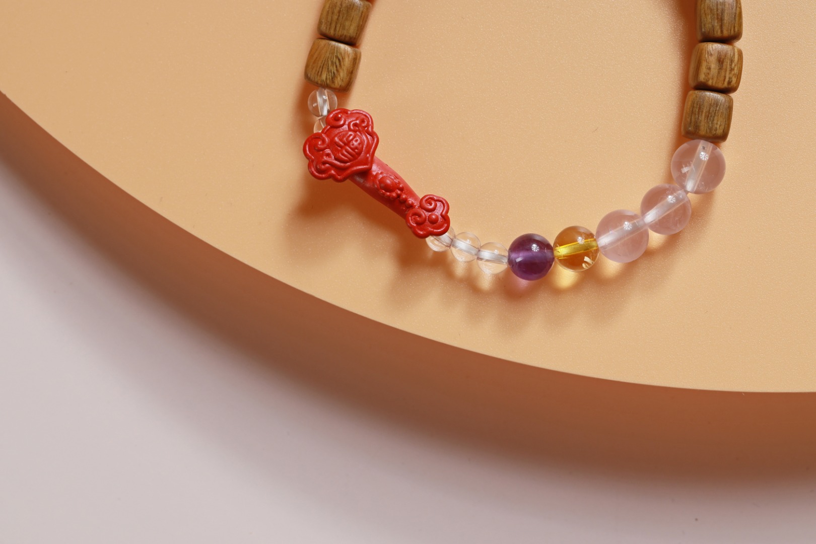 绿檀四方来财珠+白水晶、紫水晶、黄水晶、粉水晶、朱砂福字如意