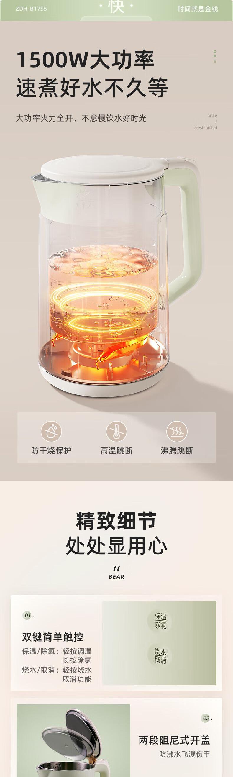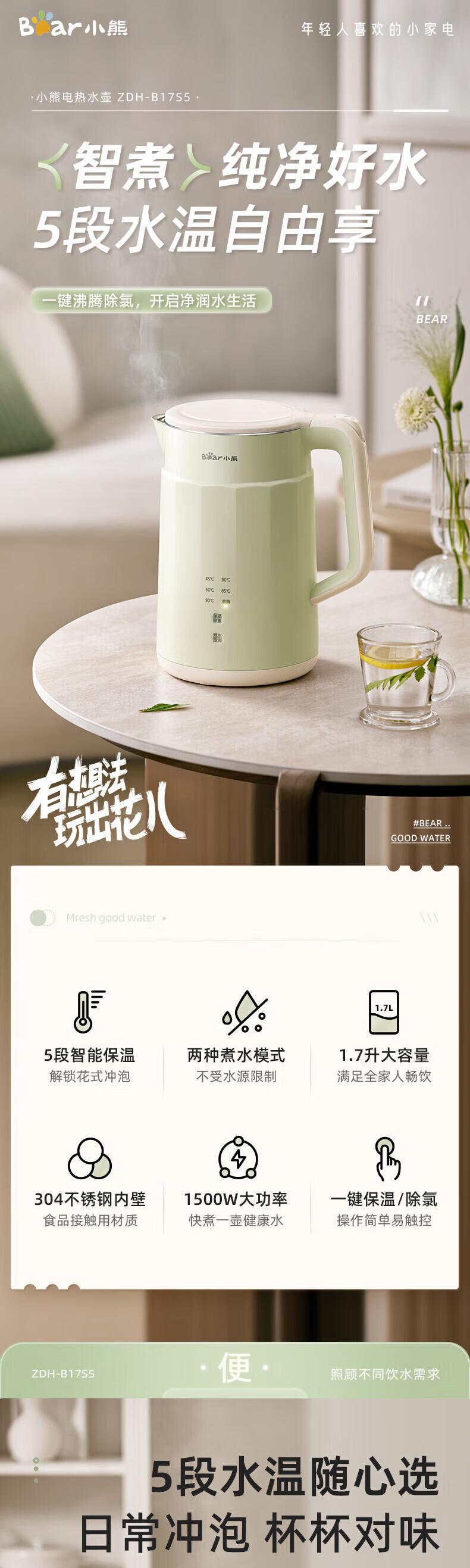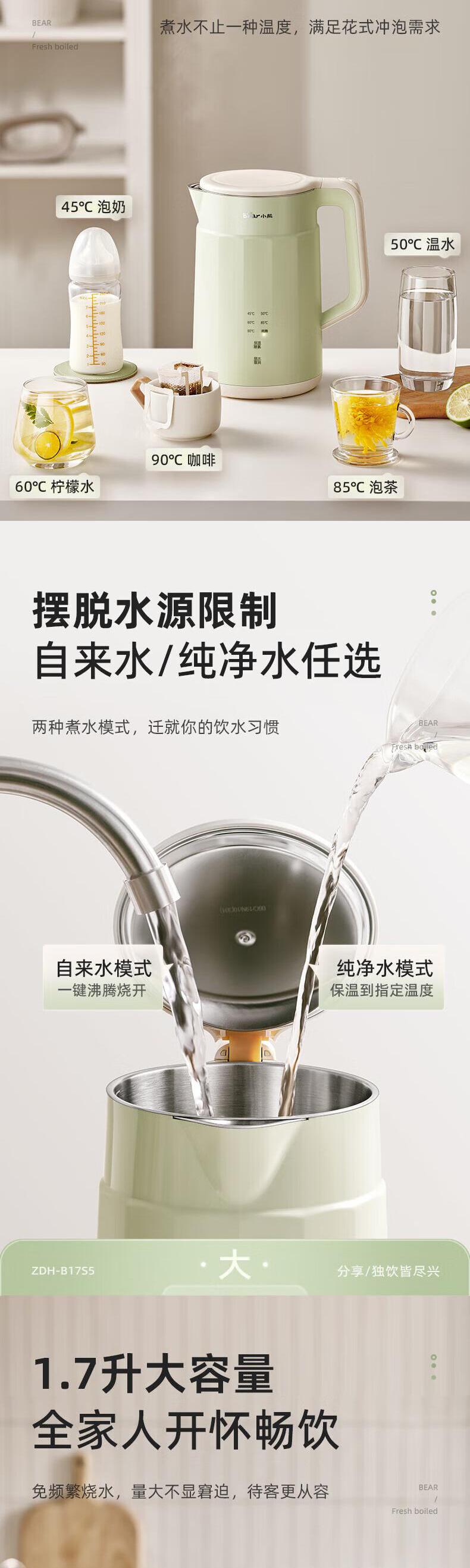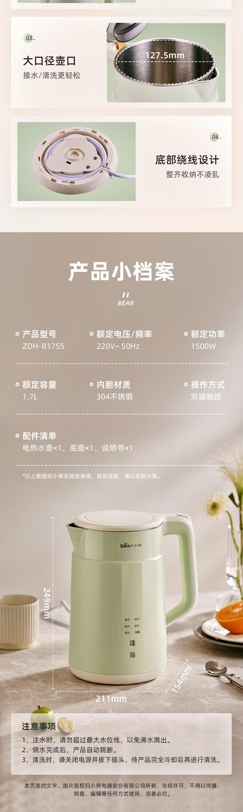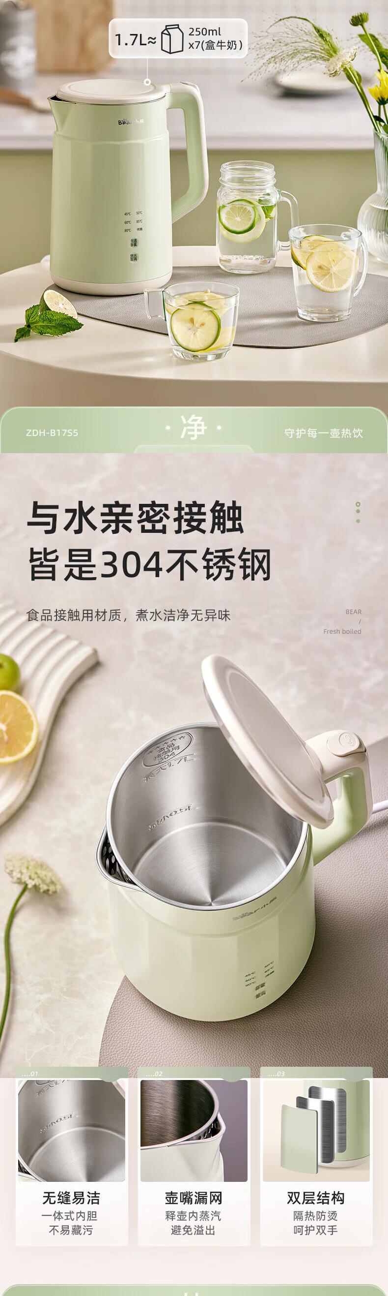 【自营】小熊(Bear)1.7L电热水壶 ZDH-B17S5双层防烫全钢无缝快速烧水自动断电耐用