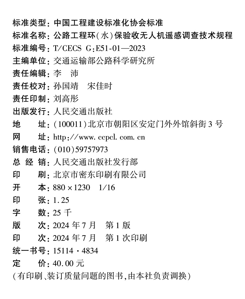 书名:公路工程环(水)保验收无人机遥感调查技术规程(T/CECS G:E51-01—2023)