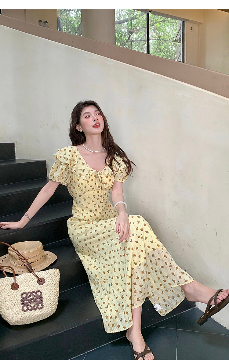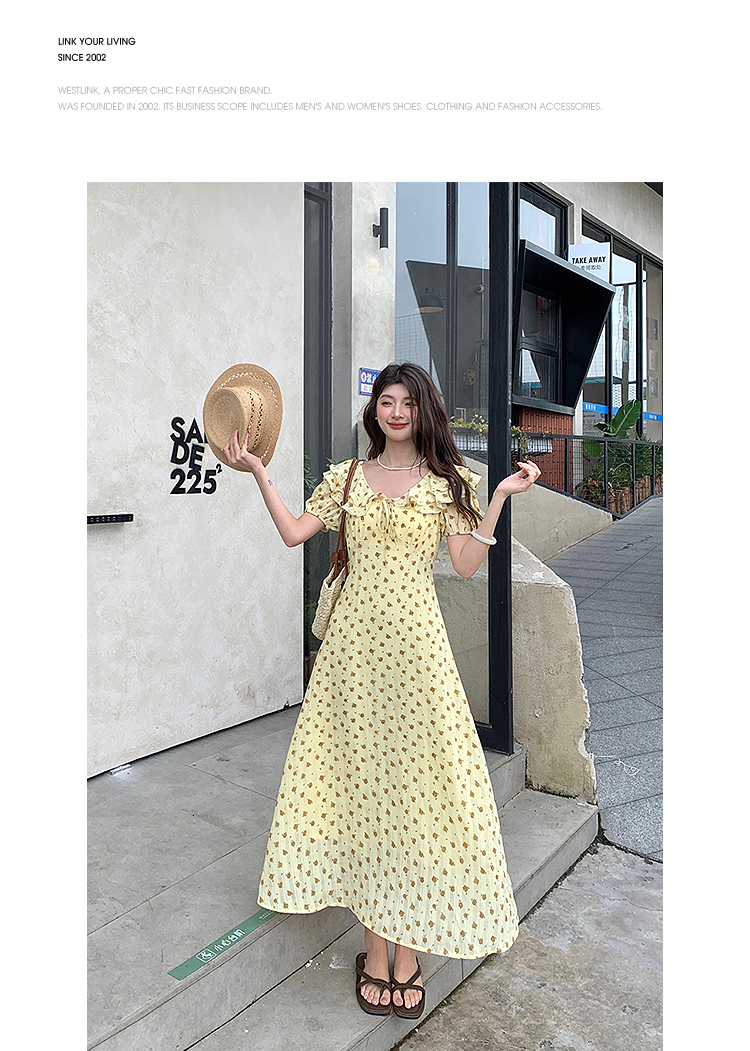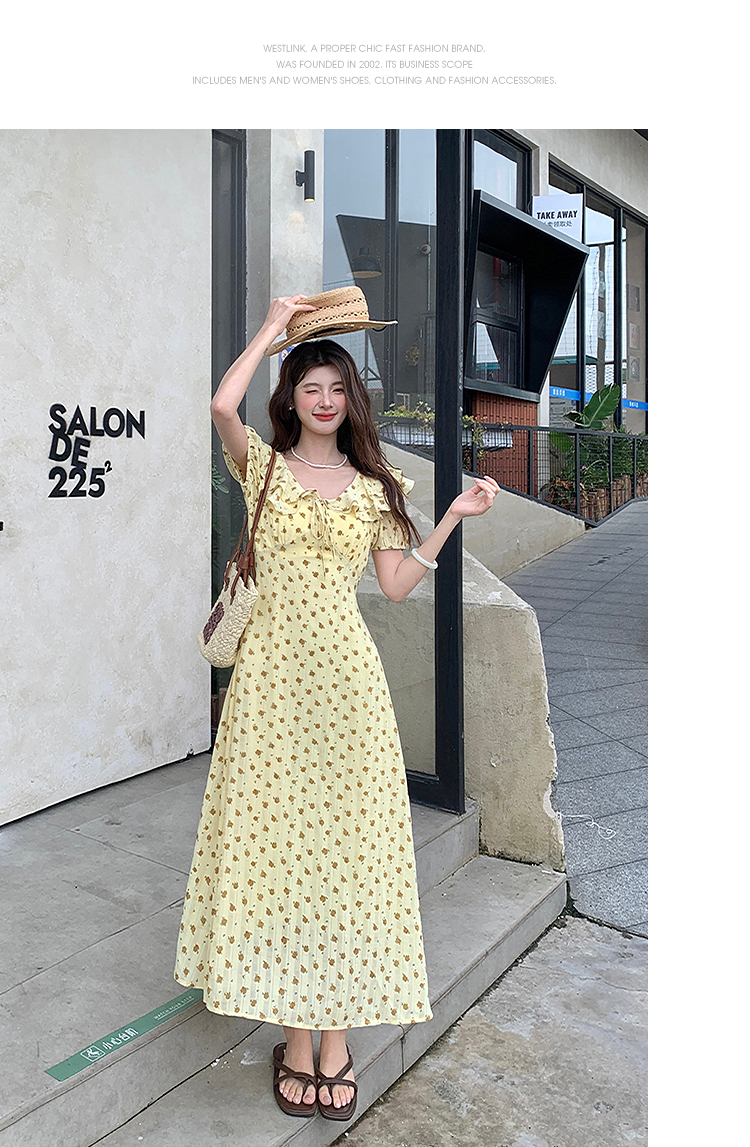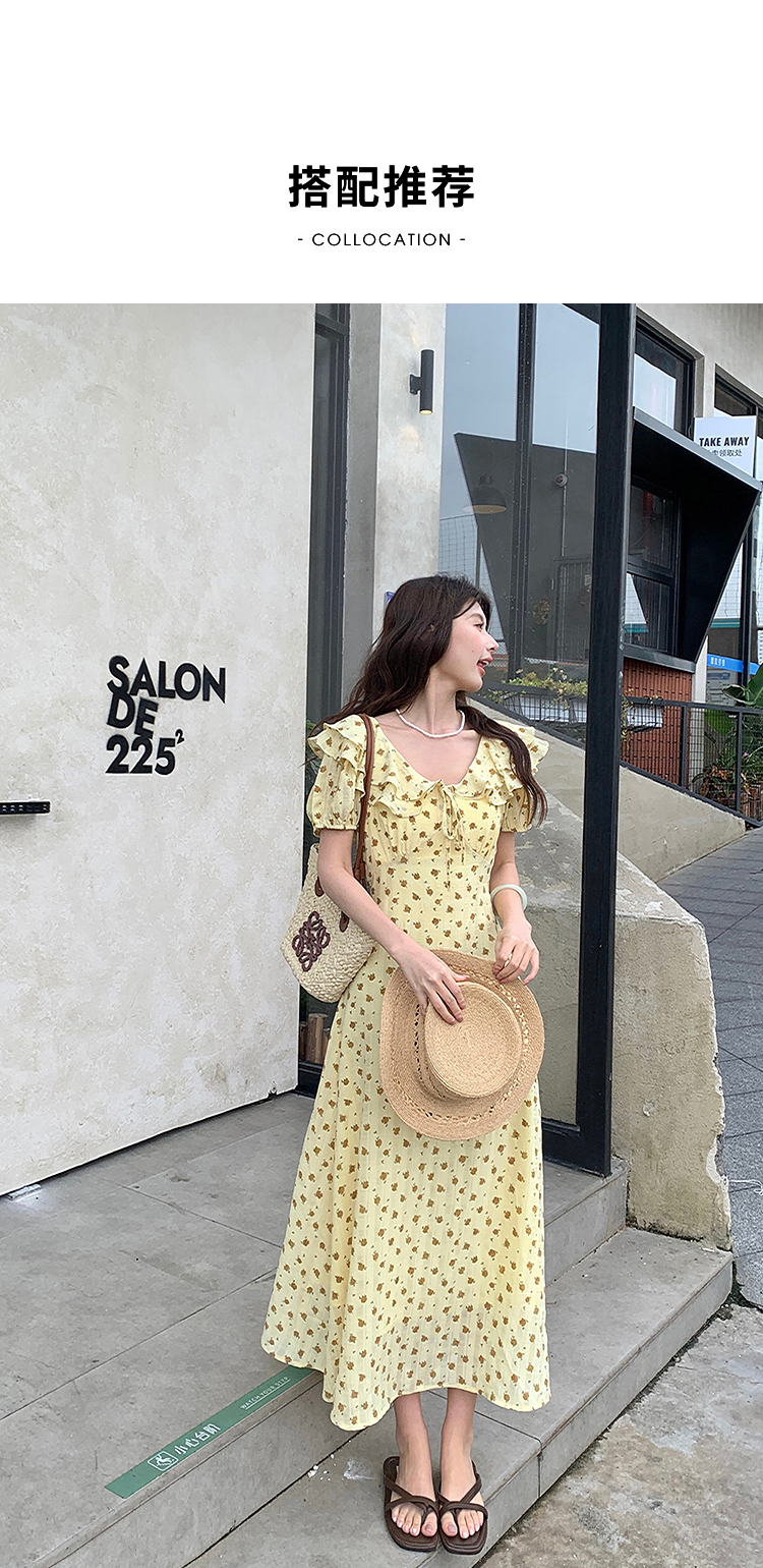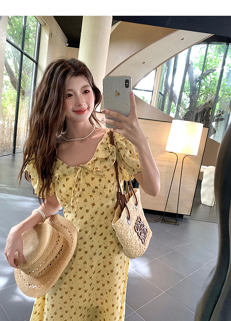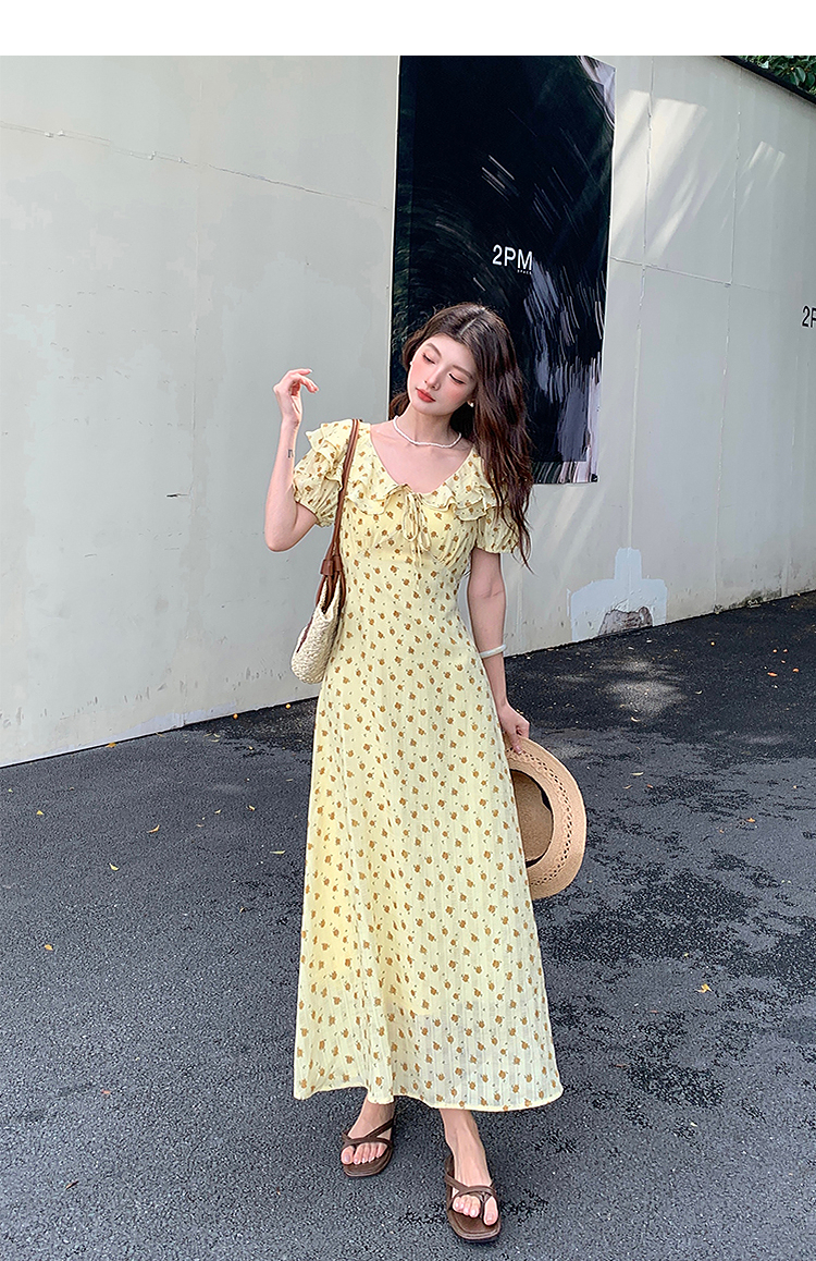 西遇碎花泡泡袖连衣裙女夏季新款娃娃领收腰显瘦a字长裙SS051112