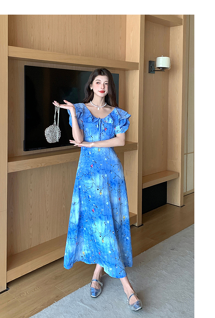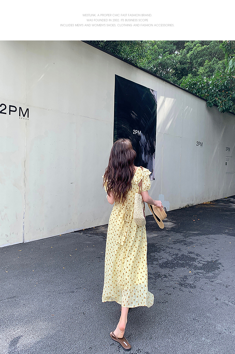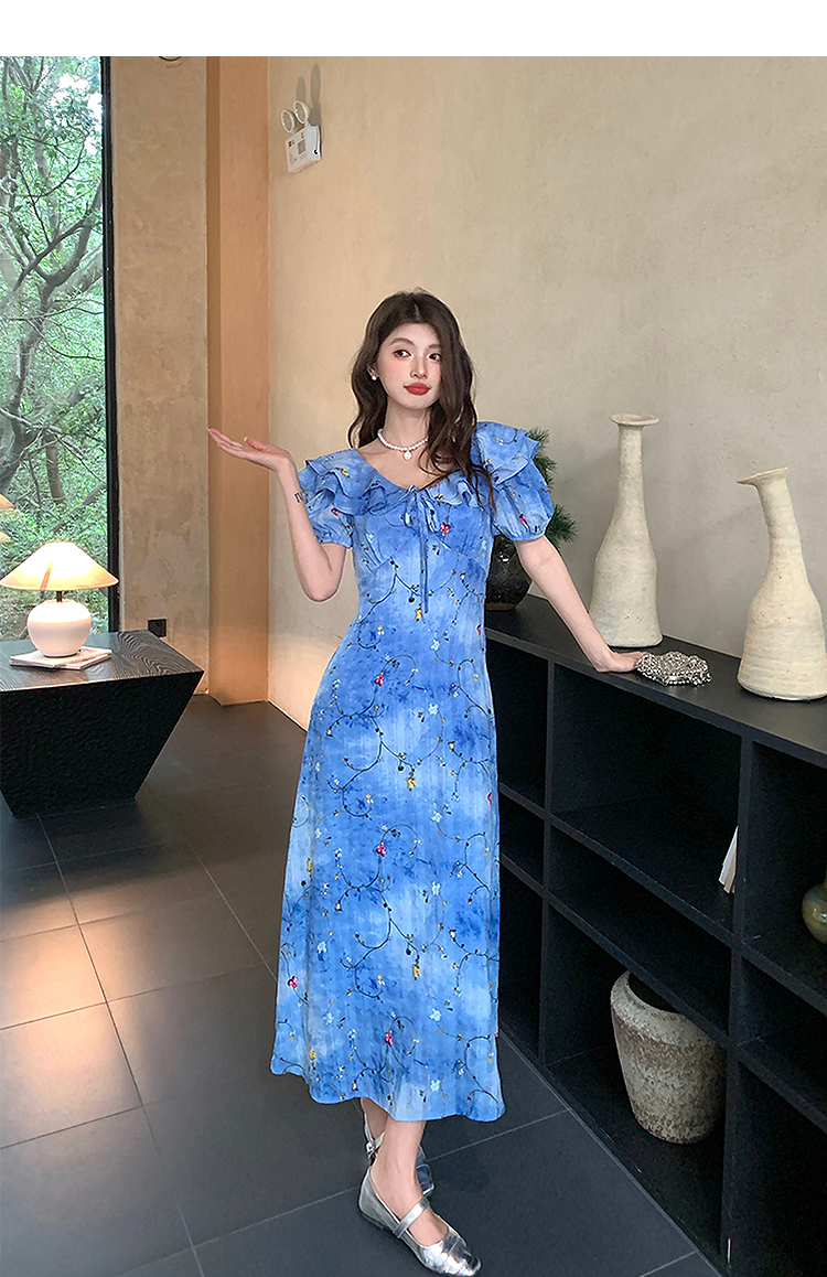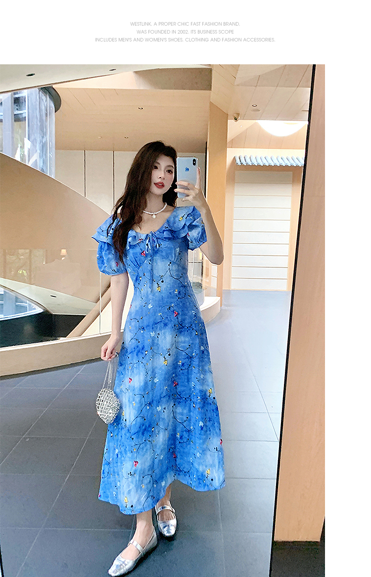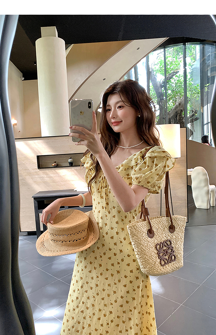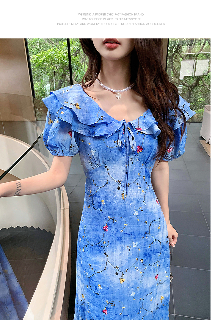 西遇碎花泡泡袖连衣裙女夏季新款娃娃领收腰显瘦a字长裙SS051112