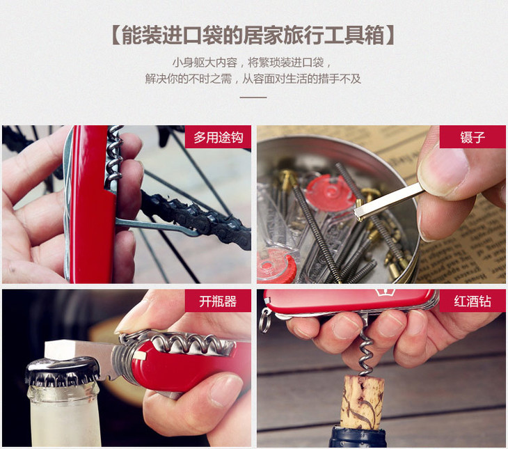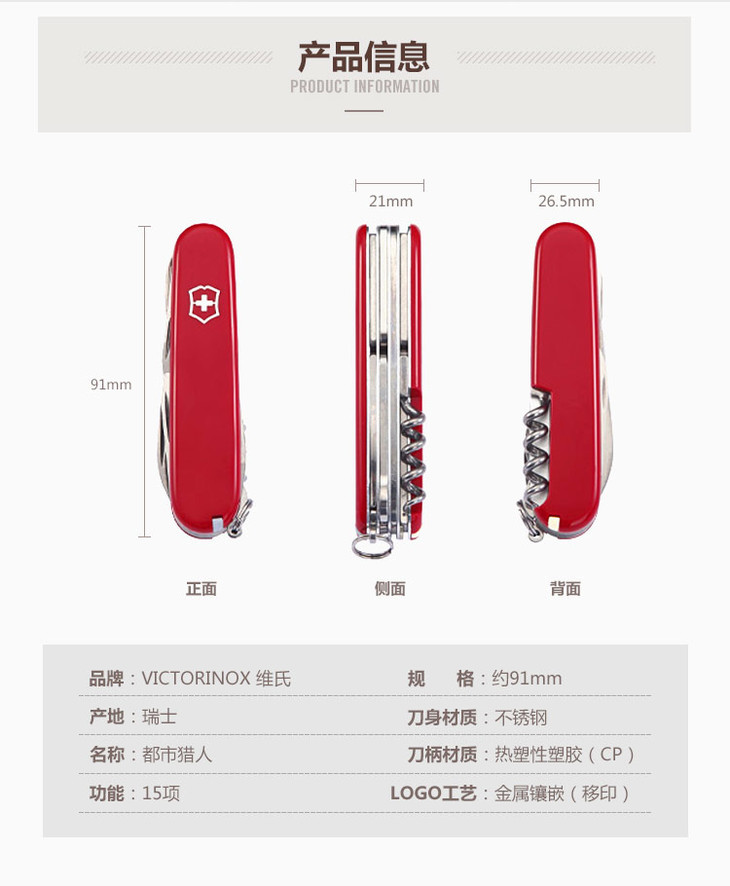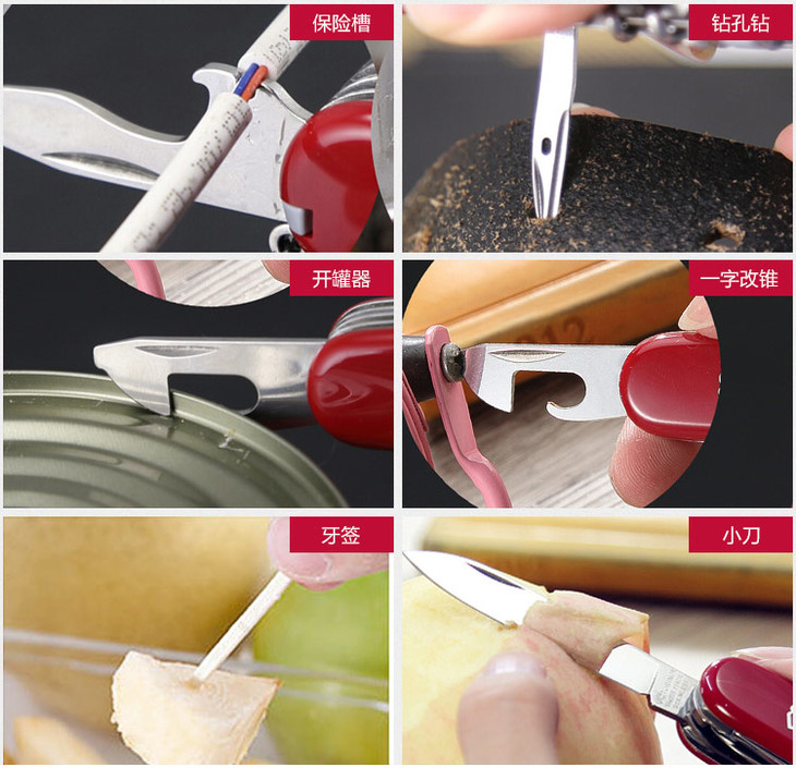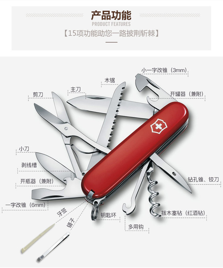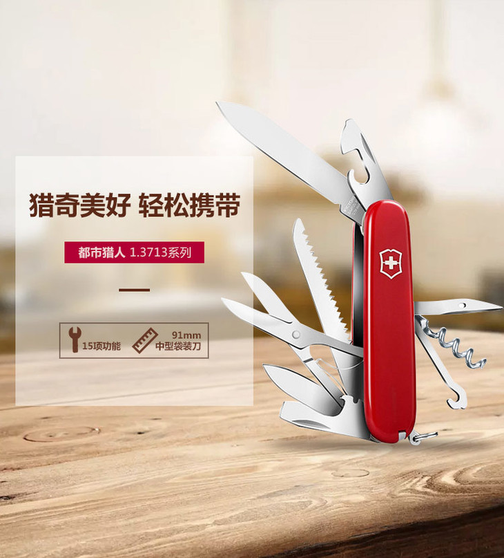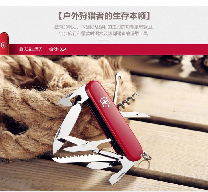 维氏军刀VI-狩猎者红15<1.3713>军士刀多功能刀水果刀折叠指甲锉小剪