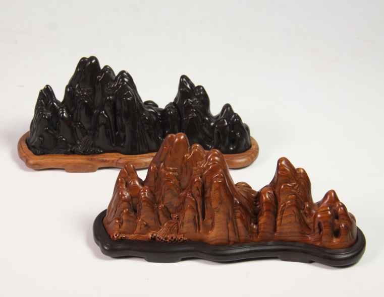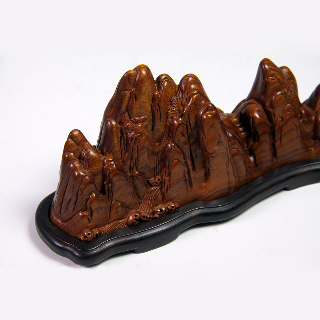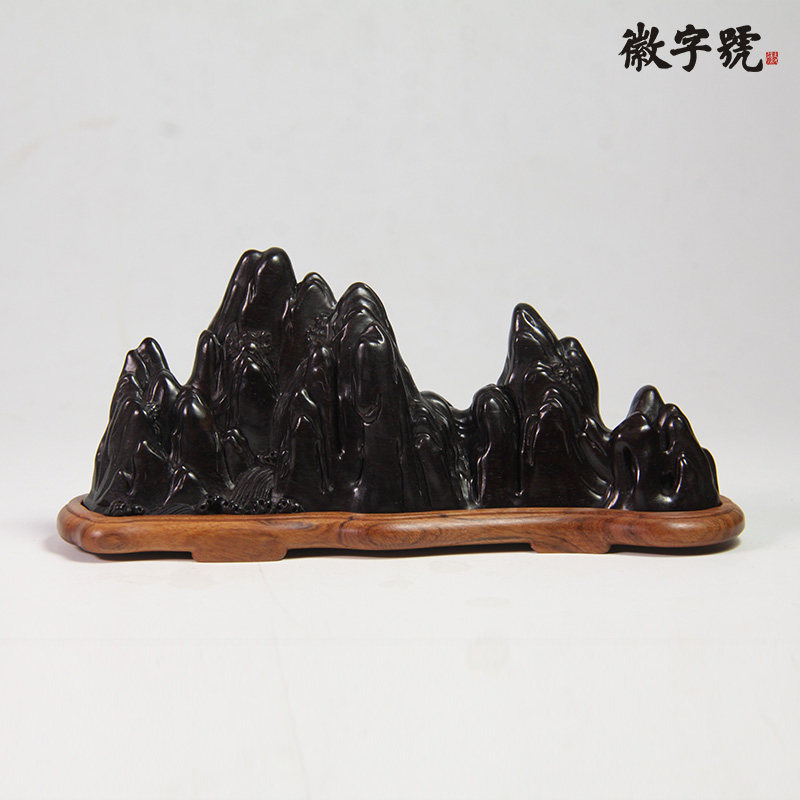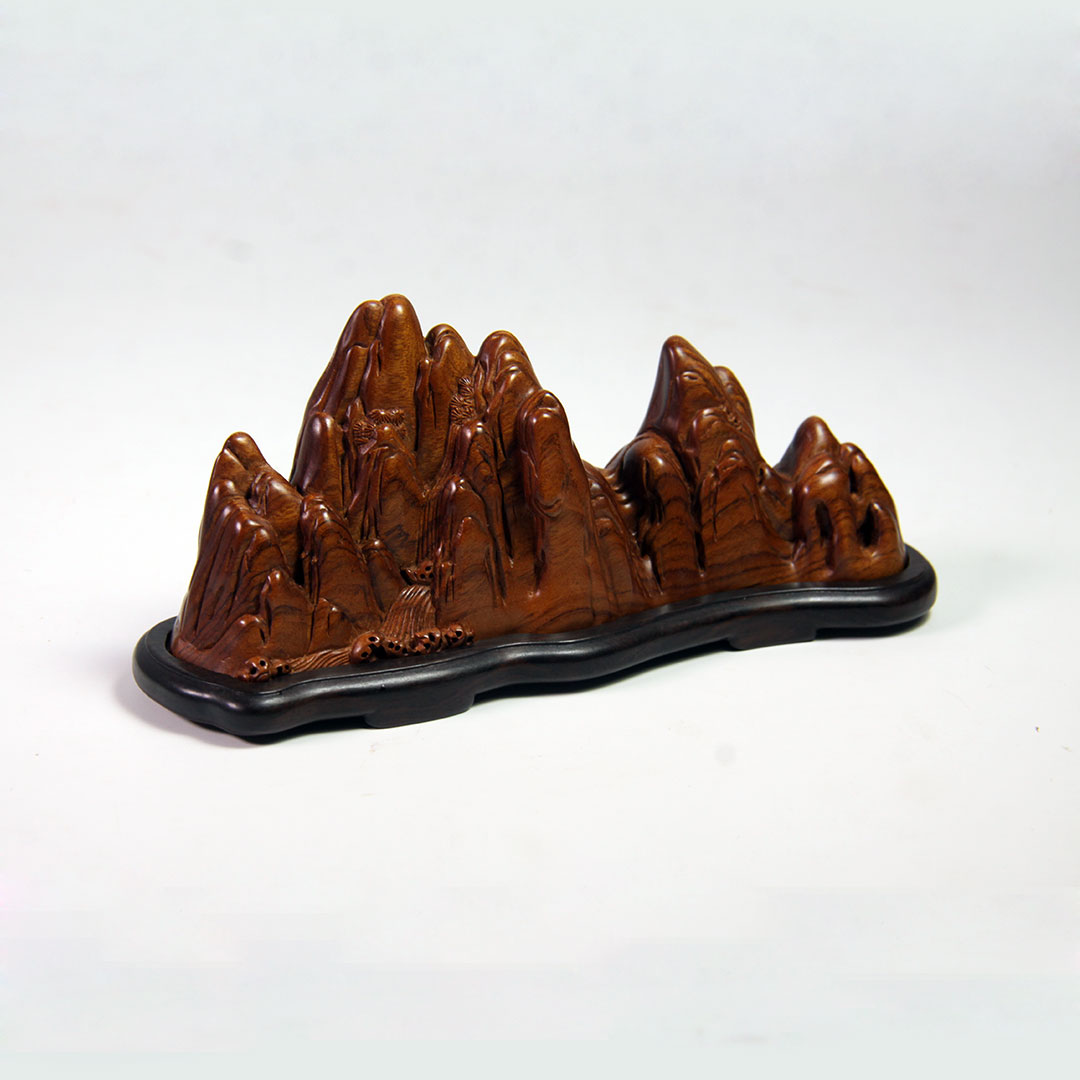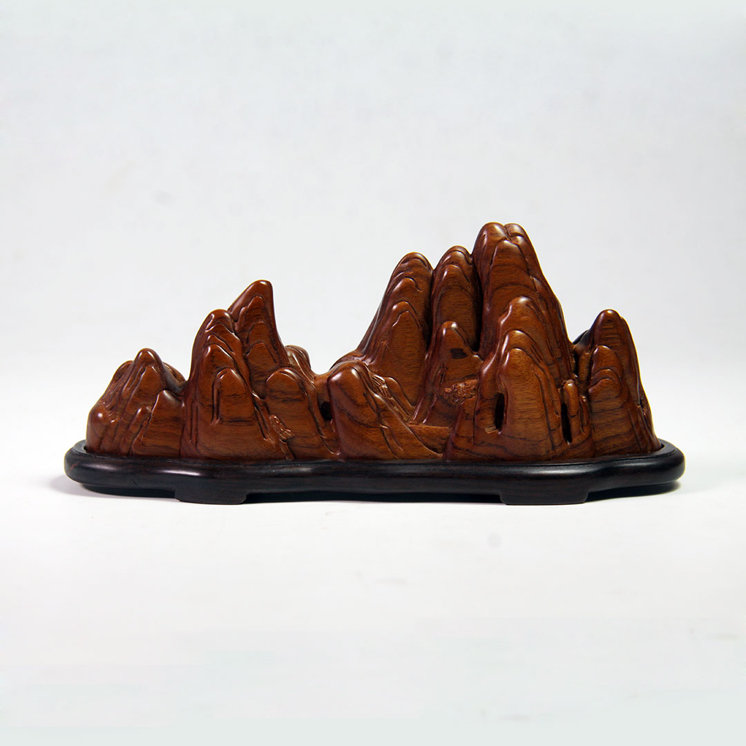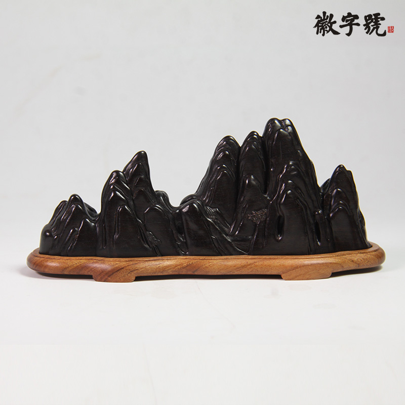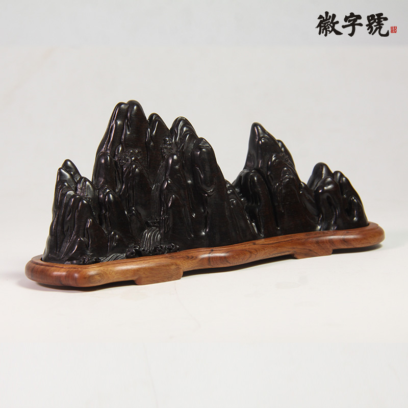 赏析:此笔山笔架为紫光檀木雕刻而成,浓缩大自然之美景于文房案上。整器雕山峰数座,峰峦叠嶂,参差错落,浑然天成。宜于文房陈设,更添雅致。配以红木底座。