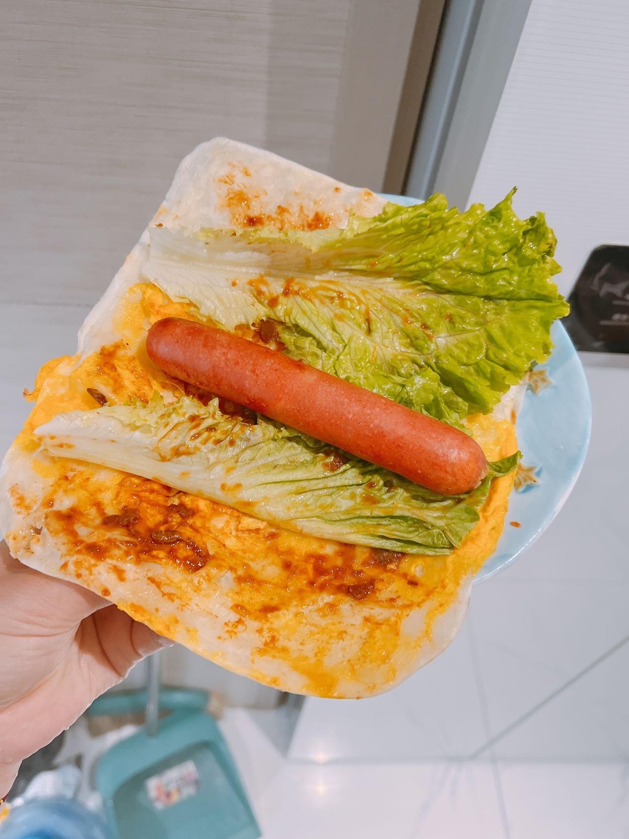 做出来的饼外酥里嫩,黄澄澄的颜色一看就很有食欲,嚼起来有弹性,里面生菜和火腿肠相辅相成,吃起来一点也不觉得油腻~