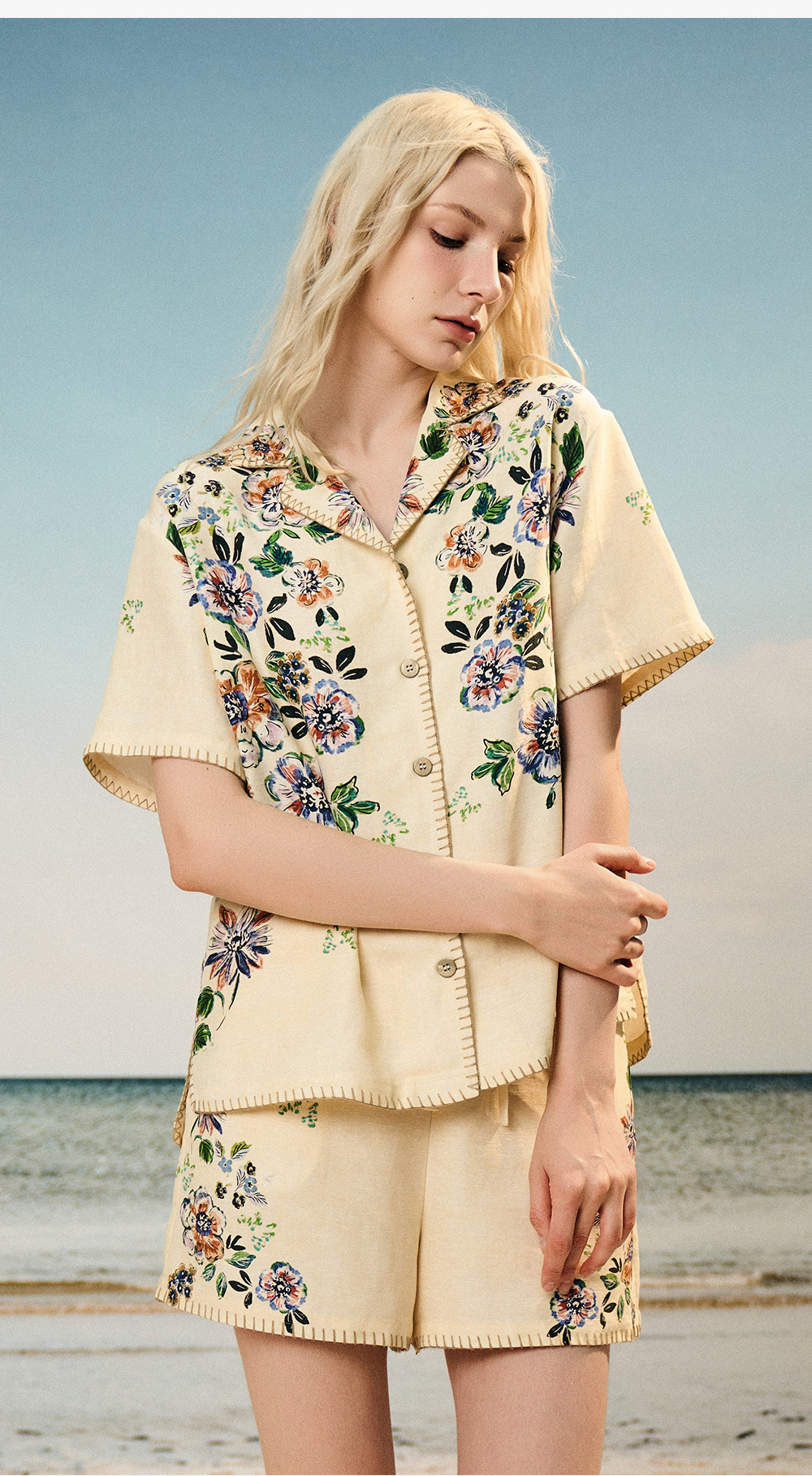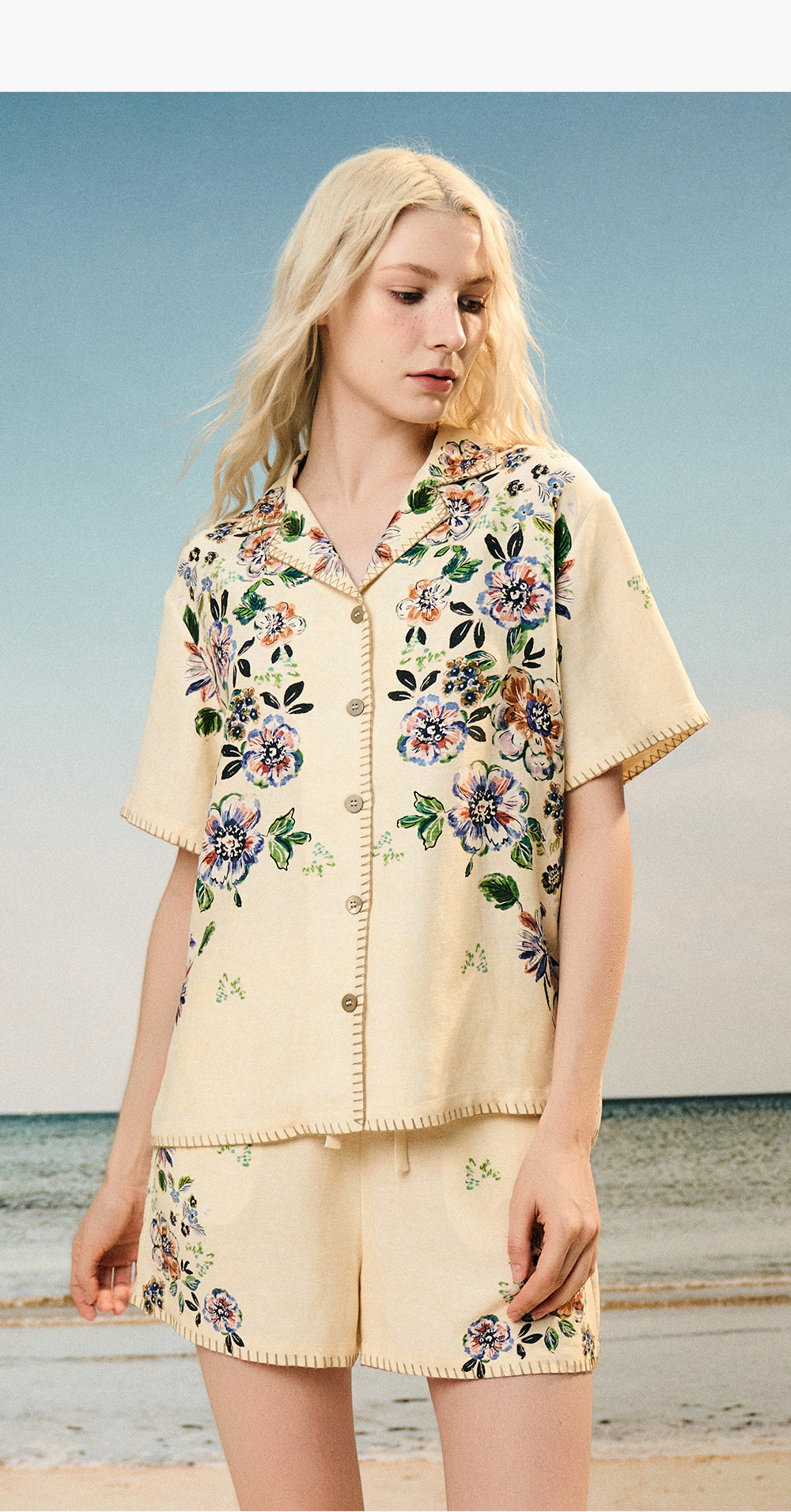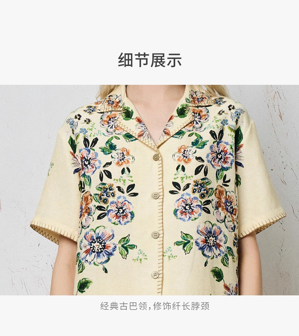 Soloseta女士海边度假风短袖短裤套装丝麻印花睡衣2025年秋