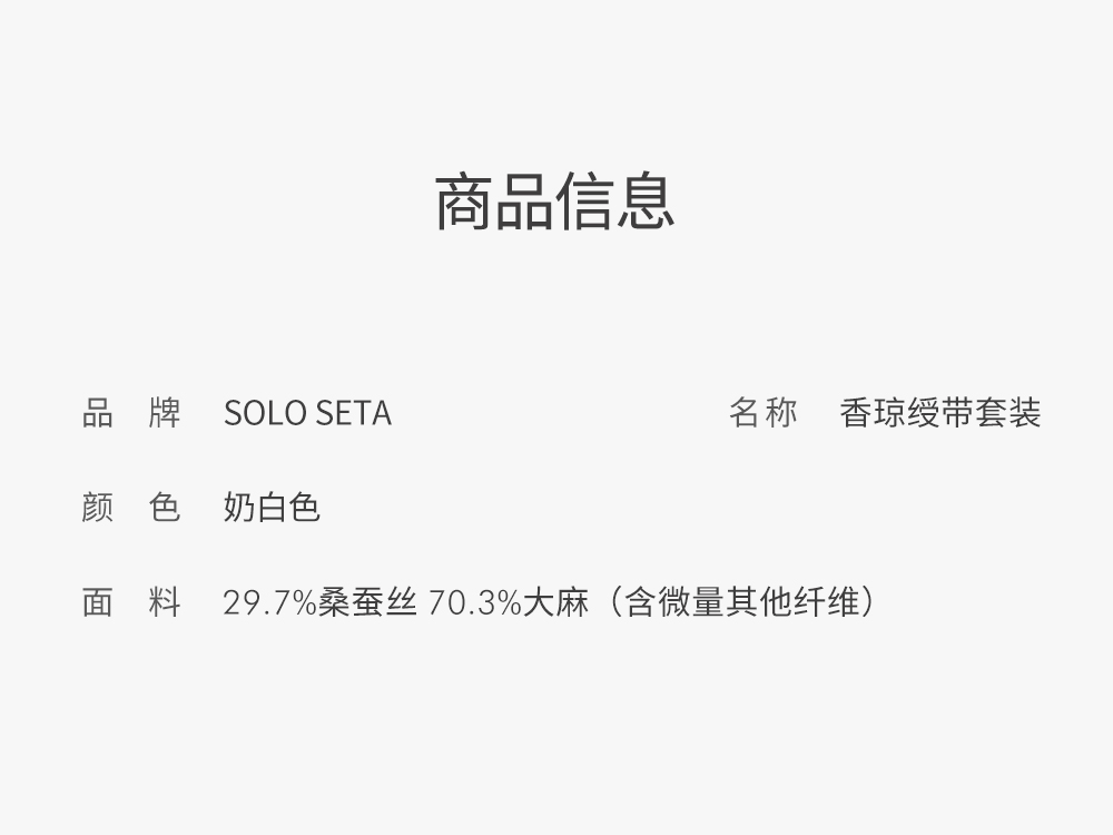 - soloseta专注于真丝织物,灵感源自意大利语,中文含义为“只做真丝”的意思。让睡衣变时尚,居家和外出瞬间切换,使其更具有出街,度假,参加宴会等功能。