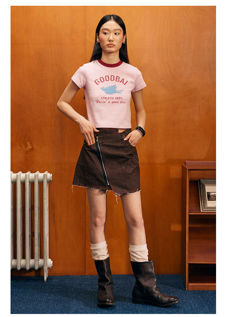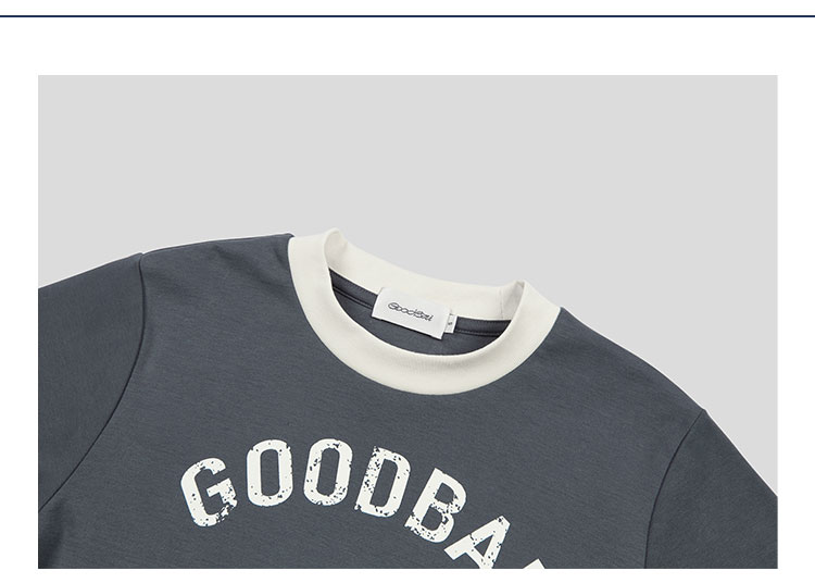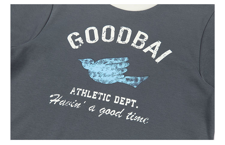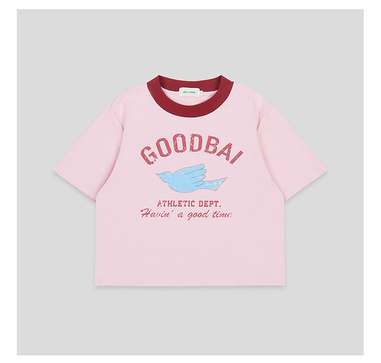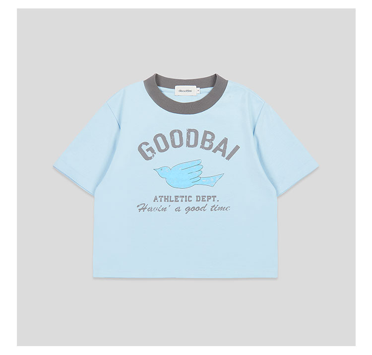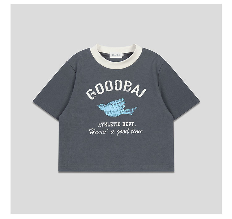 GOODBAI飞行白鸽logo做旧印花撞色正肩短款T恤
