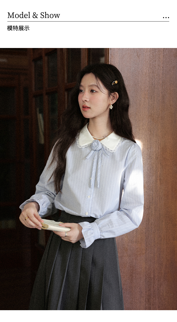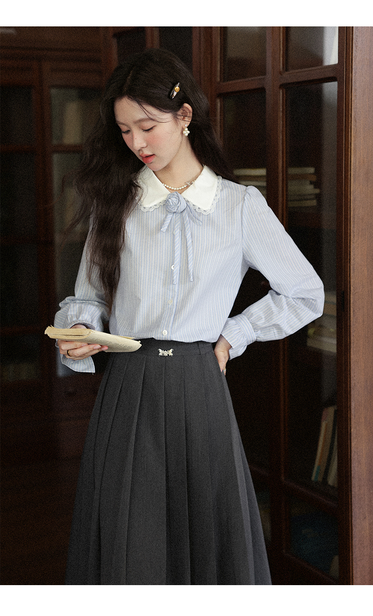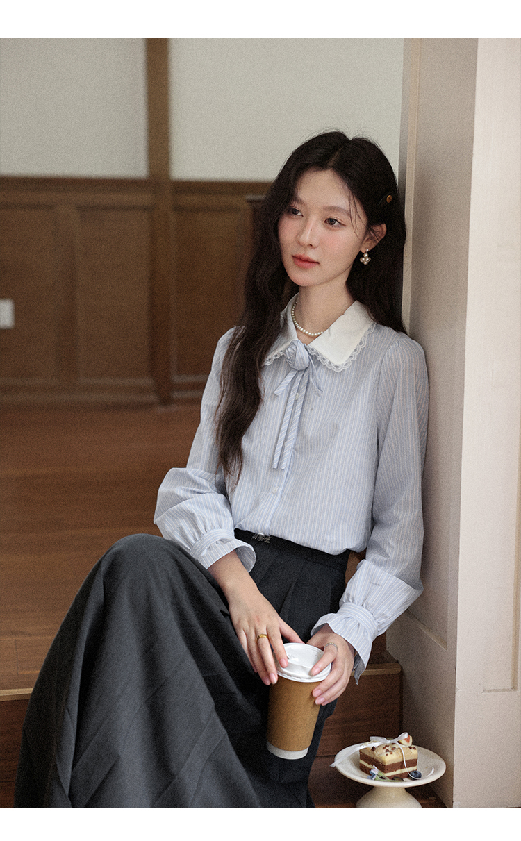 鹿向南「蓝缕溪纹」蓝色条纹长袖衬衫女早秋新款通勤气质法式上衣