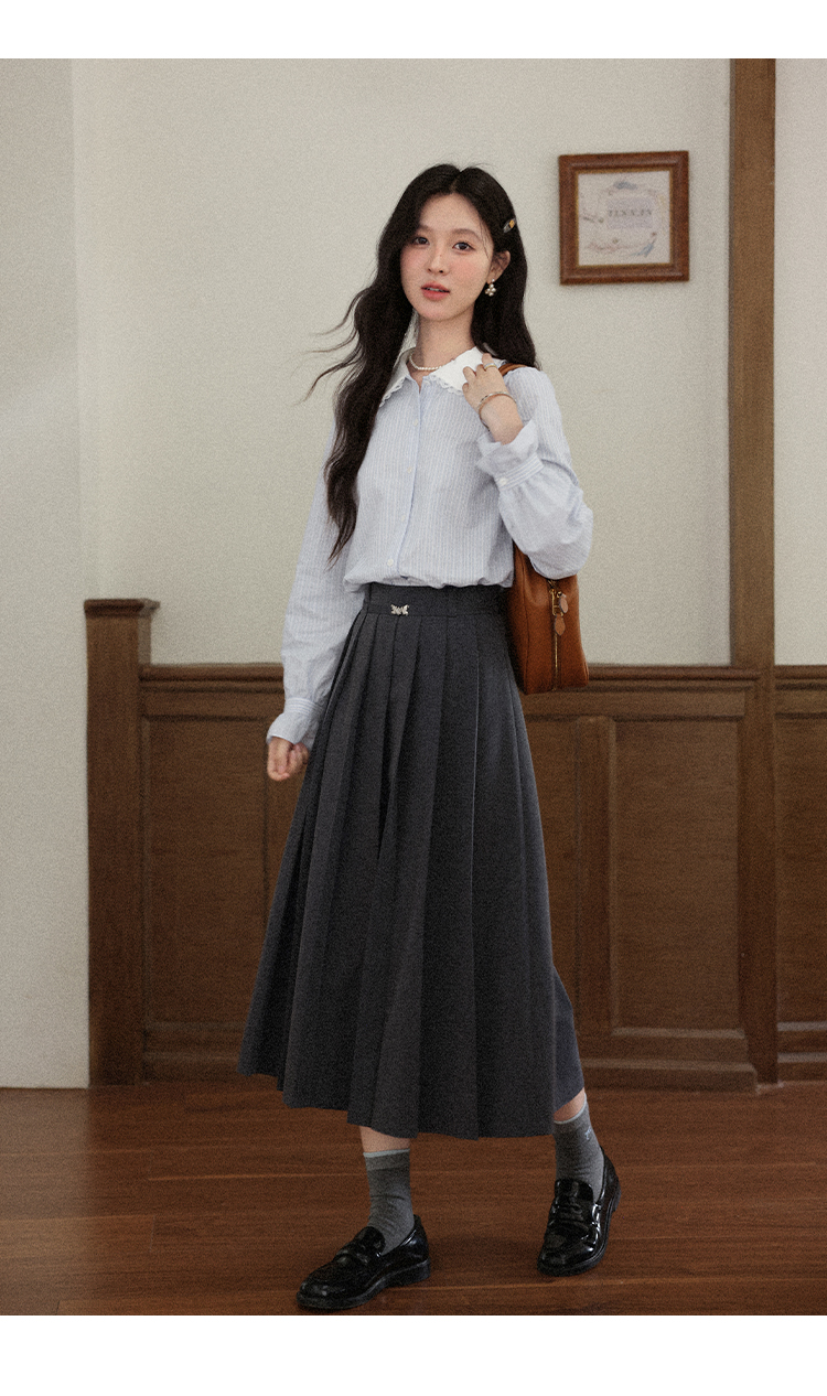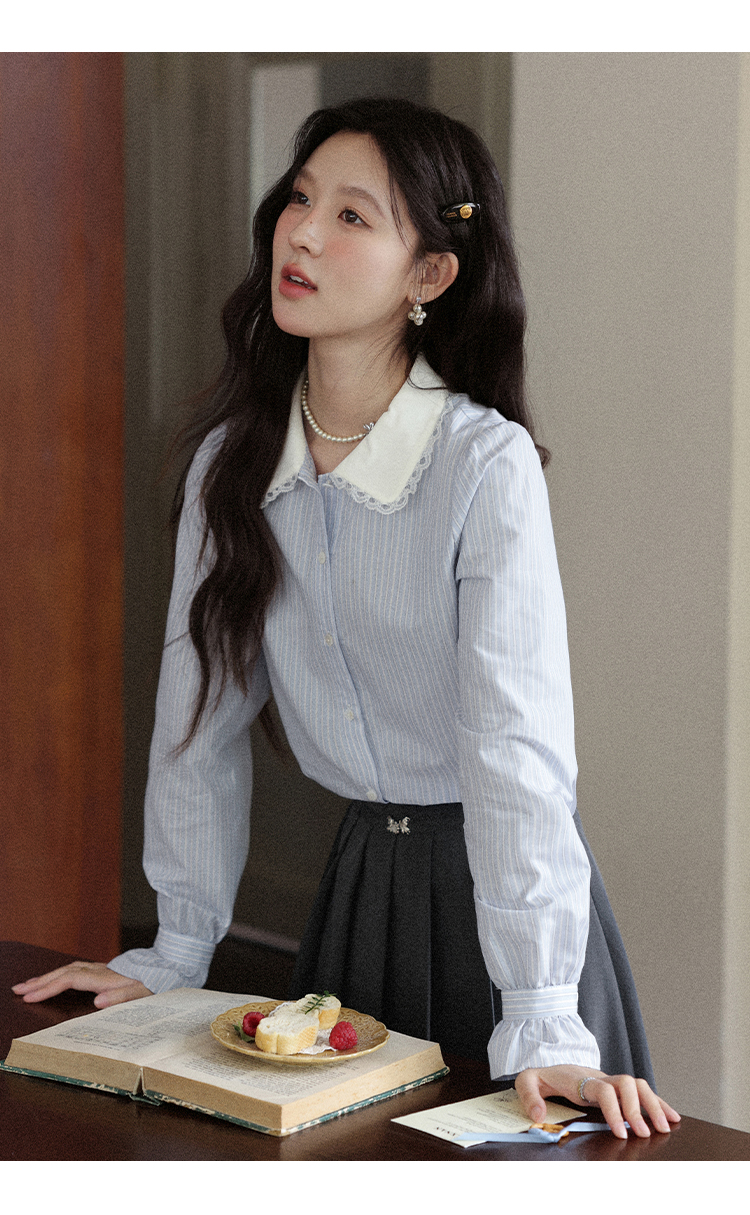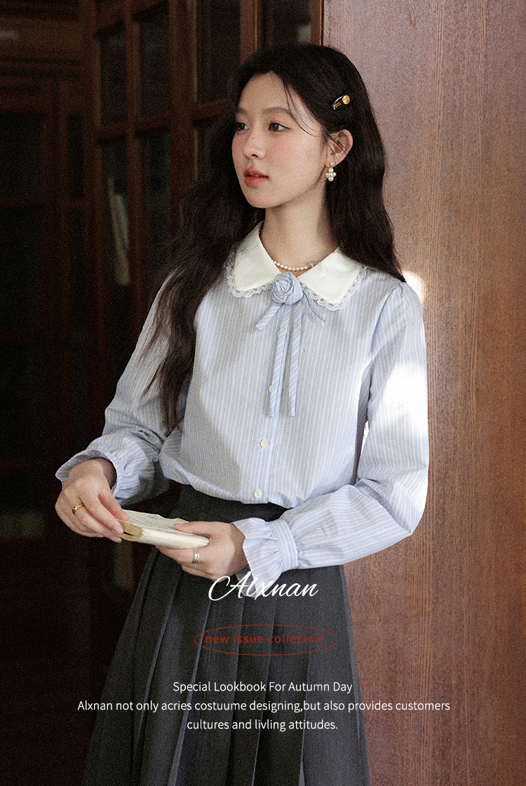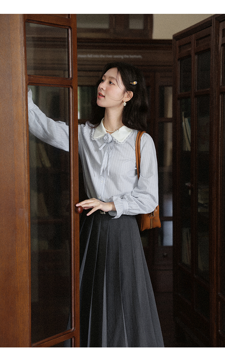 鹿向南「蓝缕溪纹」蓝色条纹长袖衬衫女早秋新款通勤气质法式上衣