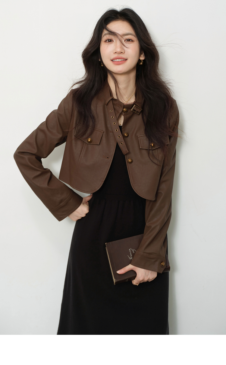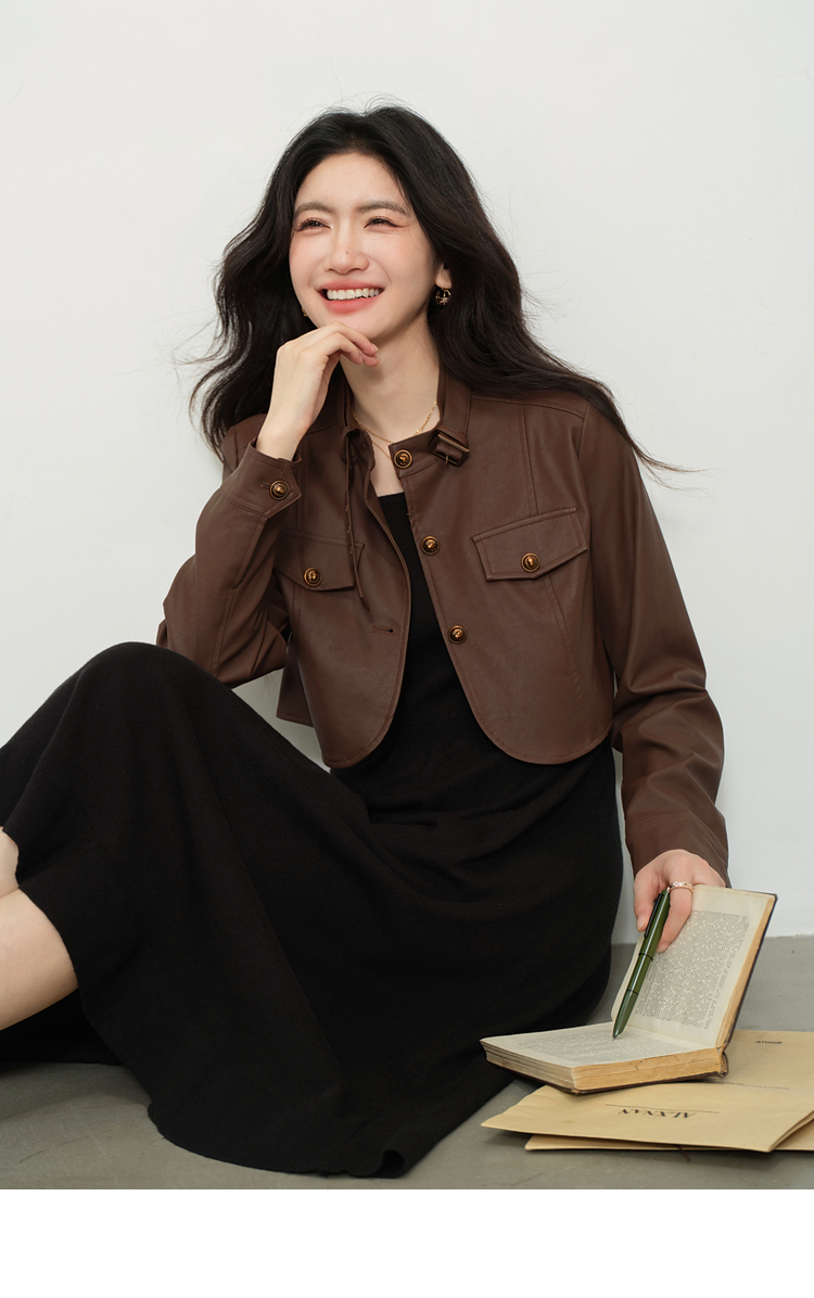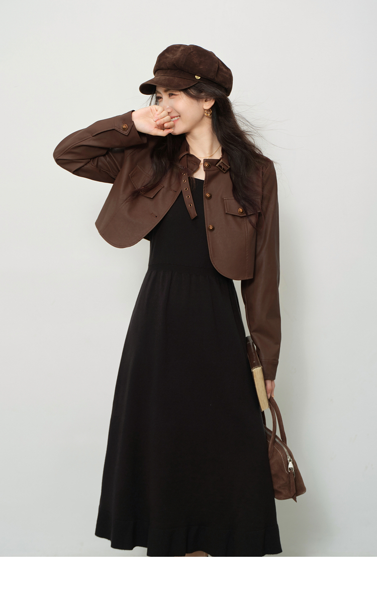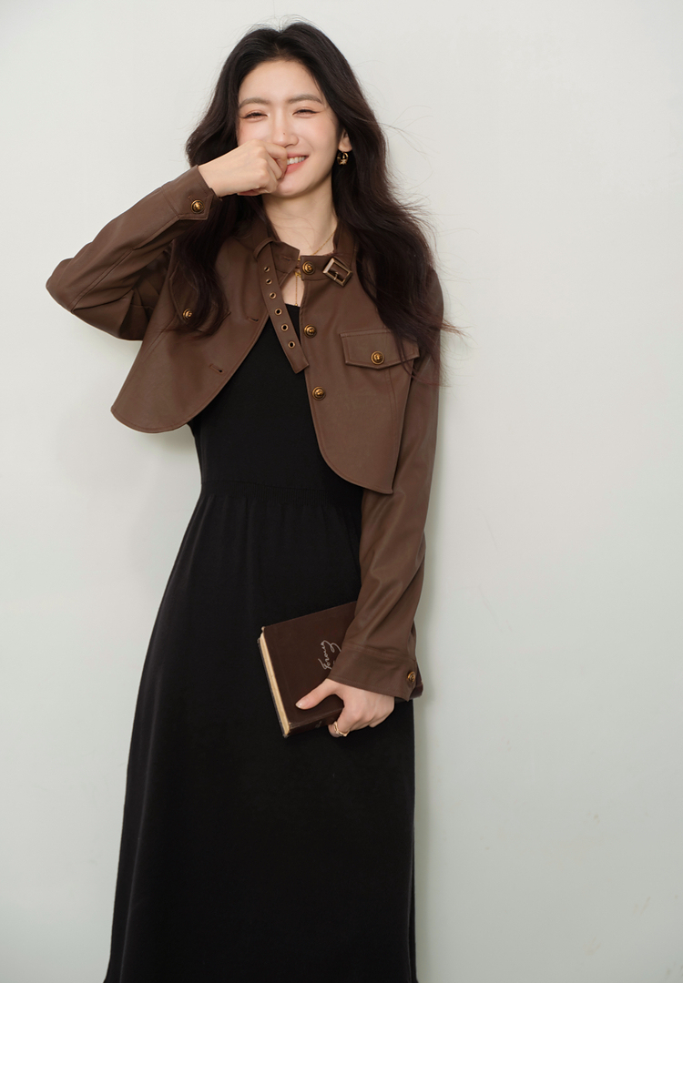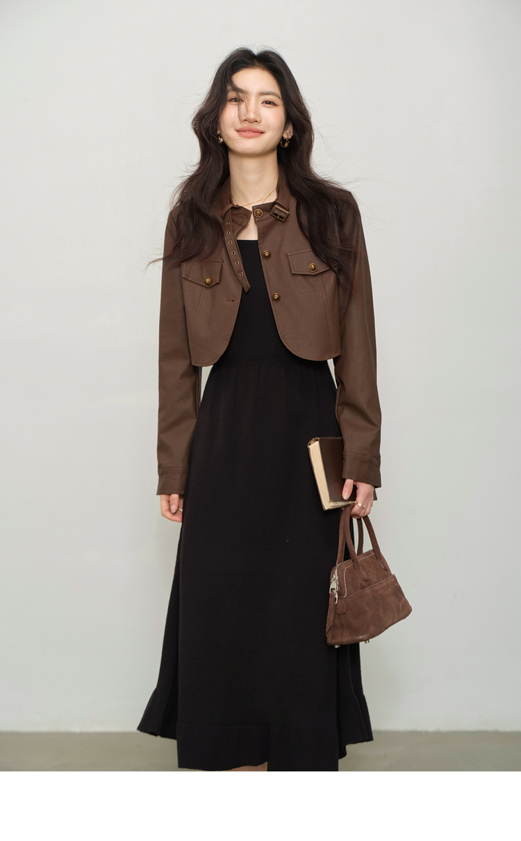 鹿向南「雅筑凝情」咖色短款皮夹克黑色连衣裙秋季新款休闲套装女
