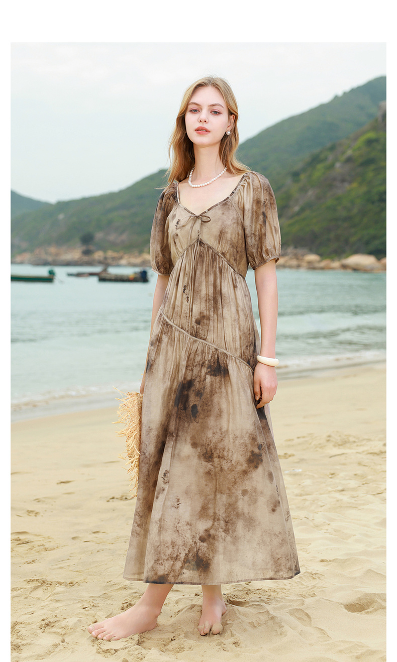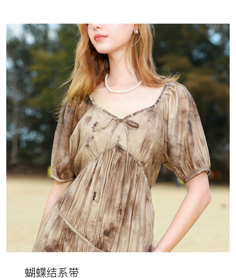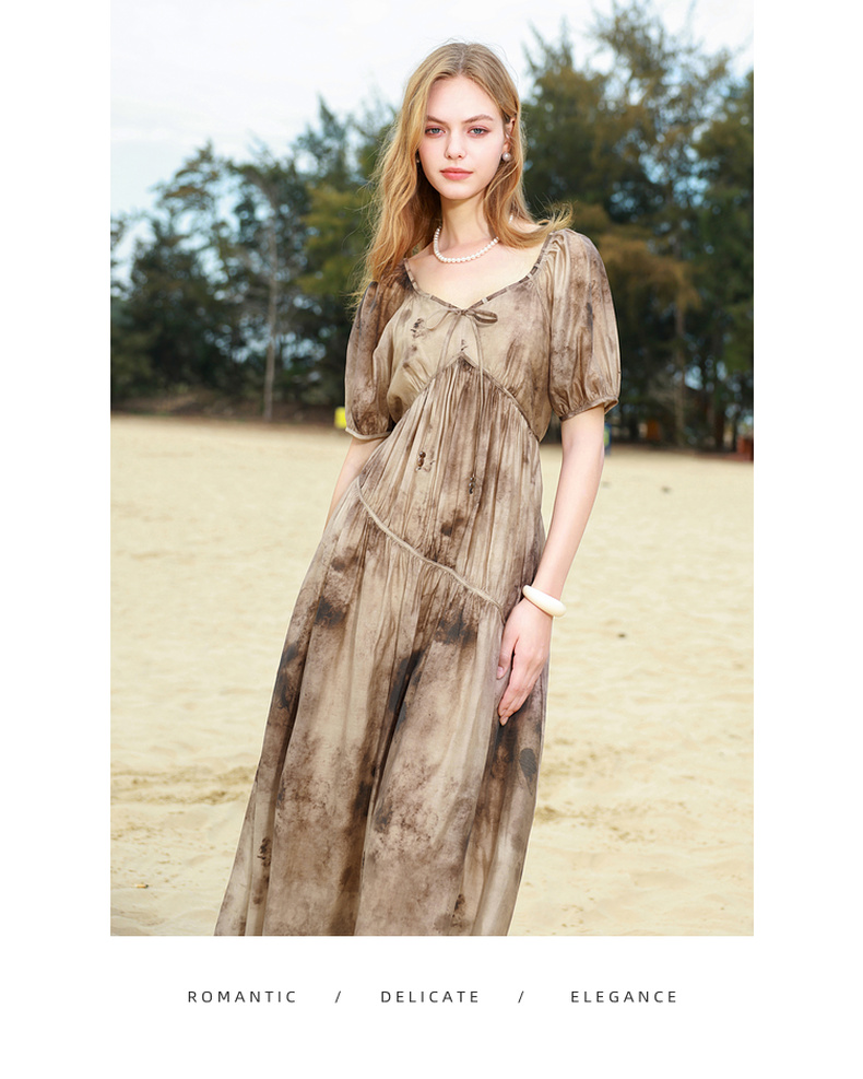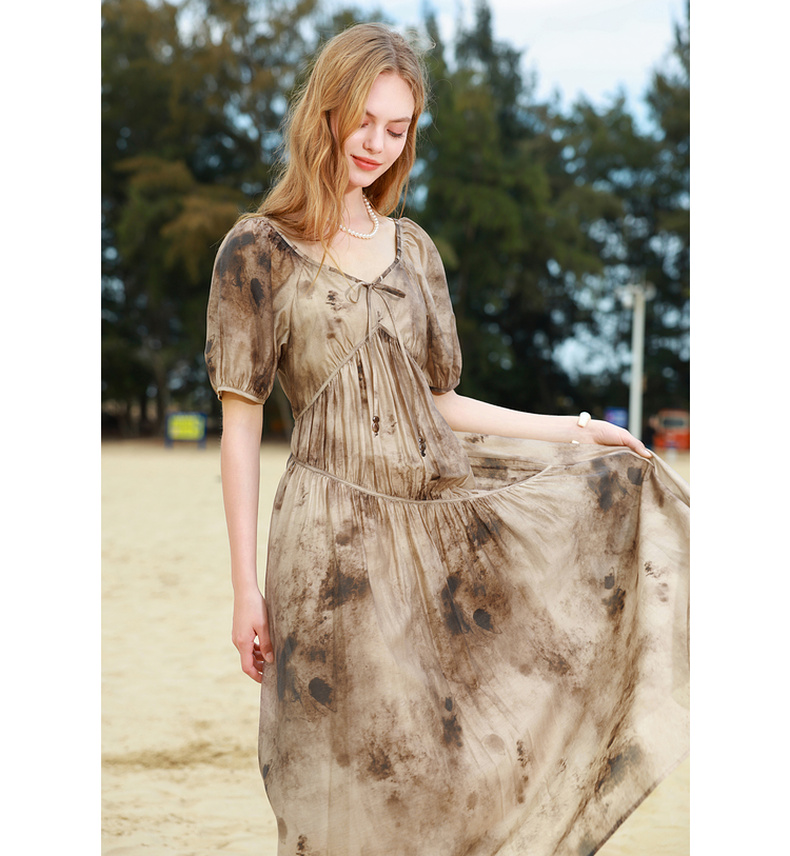 三彩2025夏季新款莱赛尔连衣裙灯笼袖晕染印花A字裙长裙优雅M