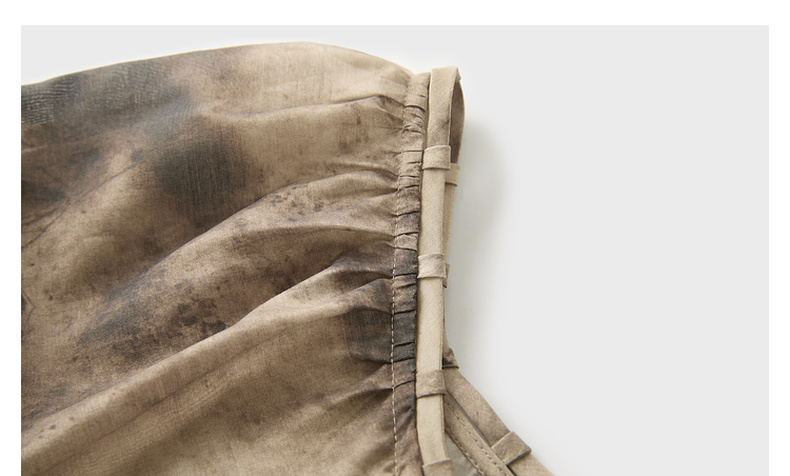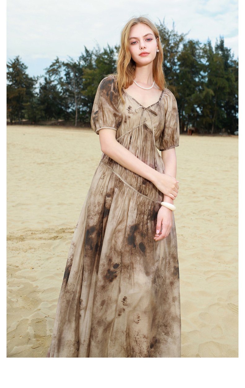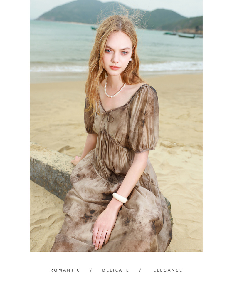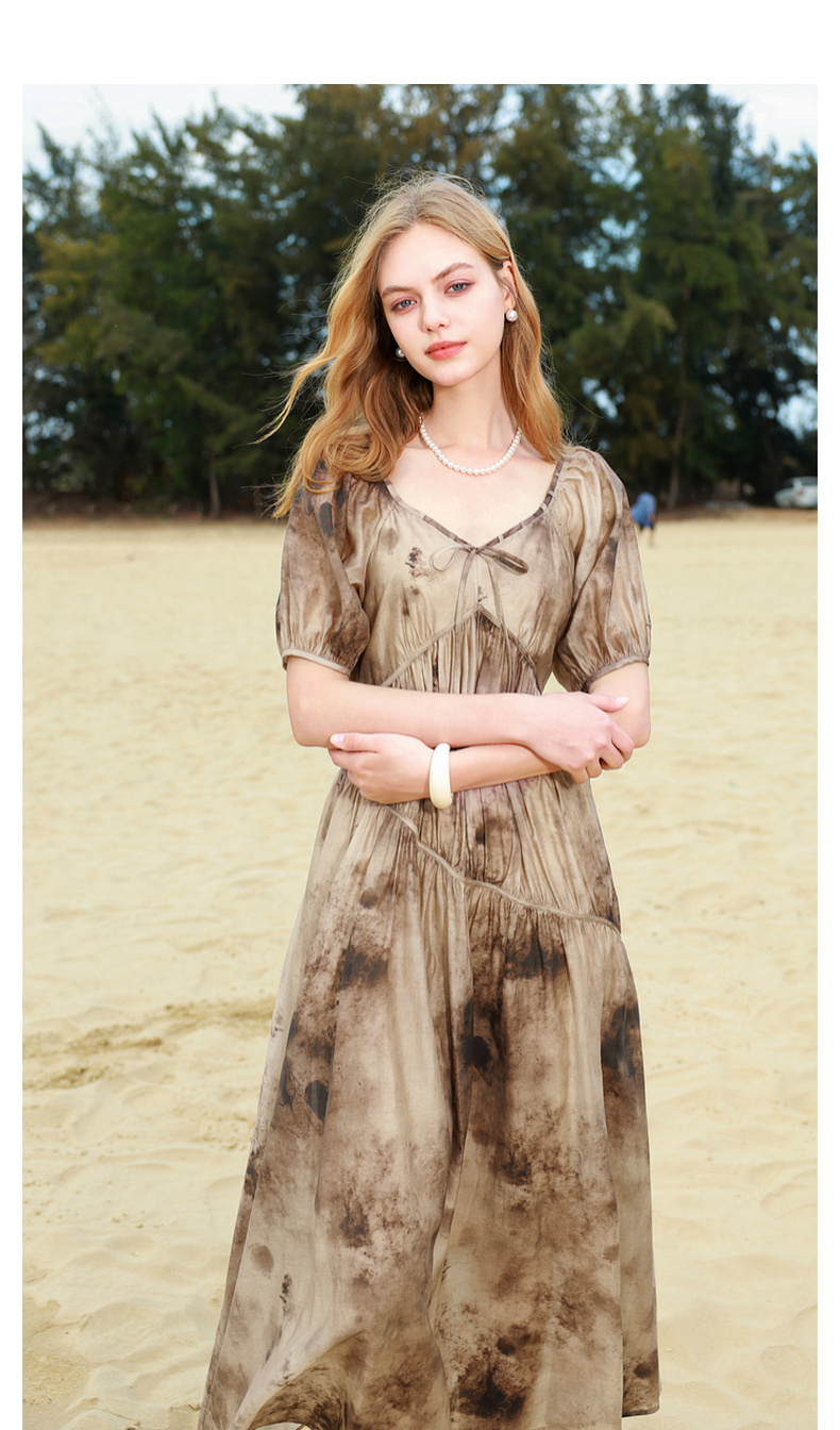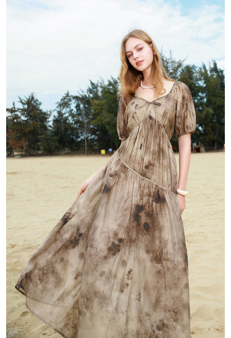 三彩2025夏季新款莱赛尔连衣裙灯笼袖晕染印花A字裙长裙优雅M