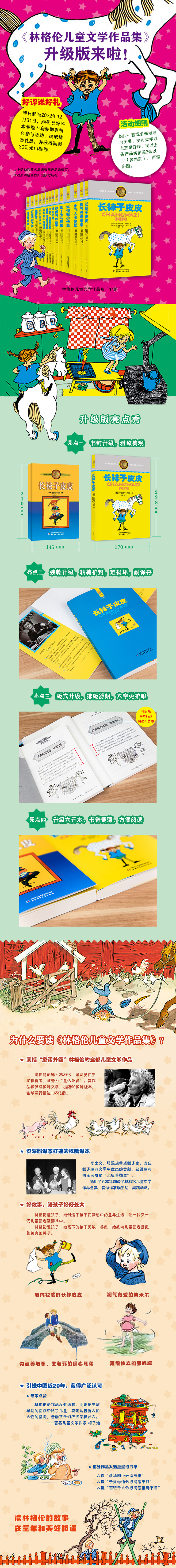 林格伦儿童文学作品集(14册) 国际安徒生奖获得者林格伦经典作品集!作品被翻译成90多种语言,在全球出版发行,图书总印数超1.65亿册。