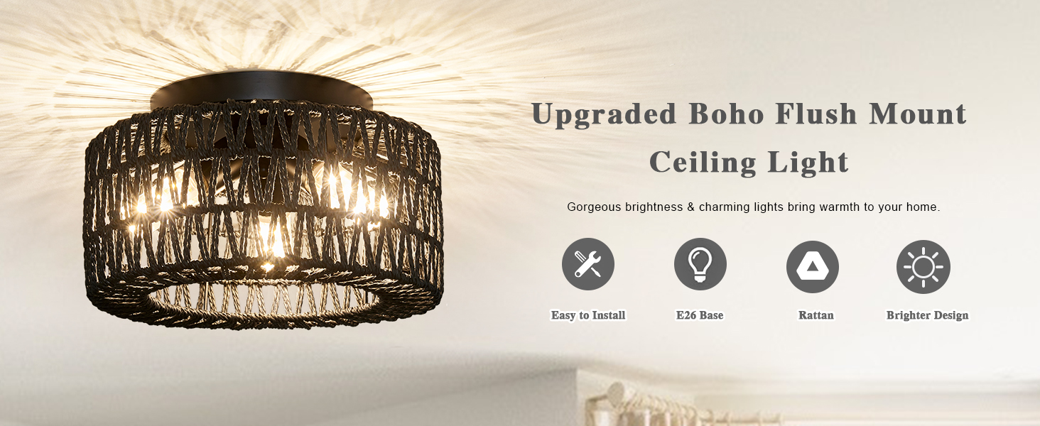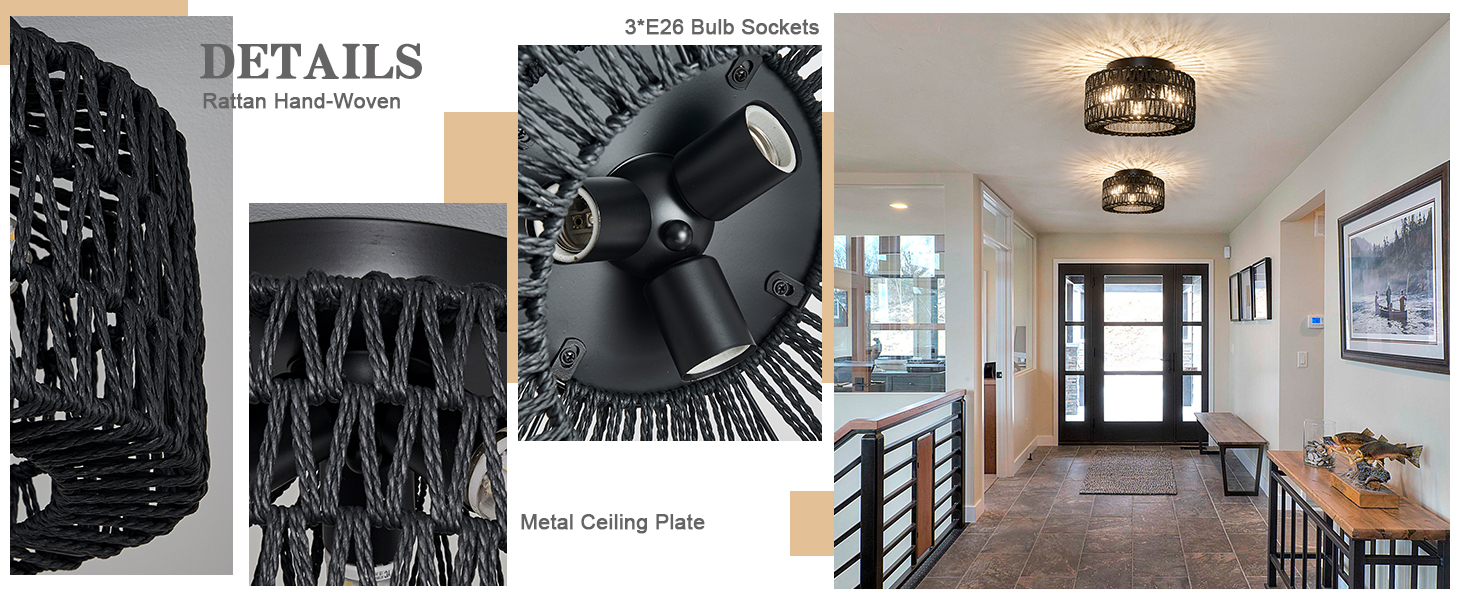 这款藤编嵌入式吸顶灯符合市场标准。配备坚固的金属顶板,您无需担忧老化或褪色问题。手工编织工艺使每盏波西米亚风格吸顶灯都独一无二。