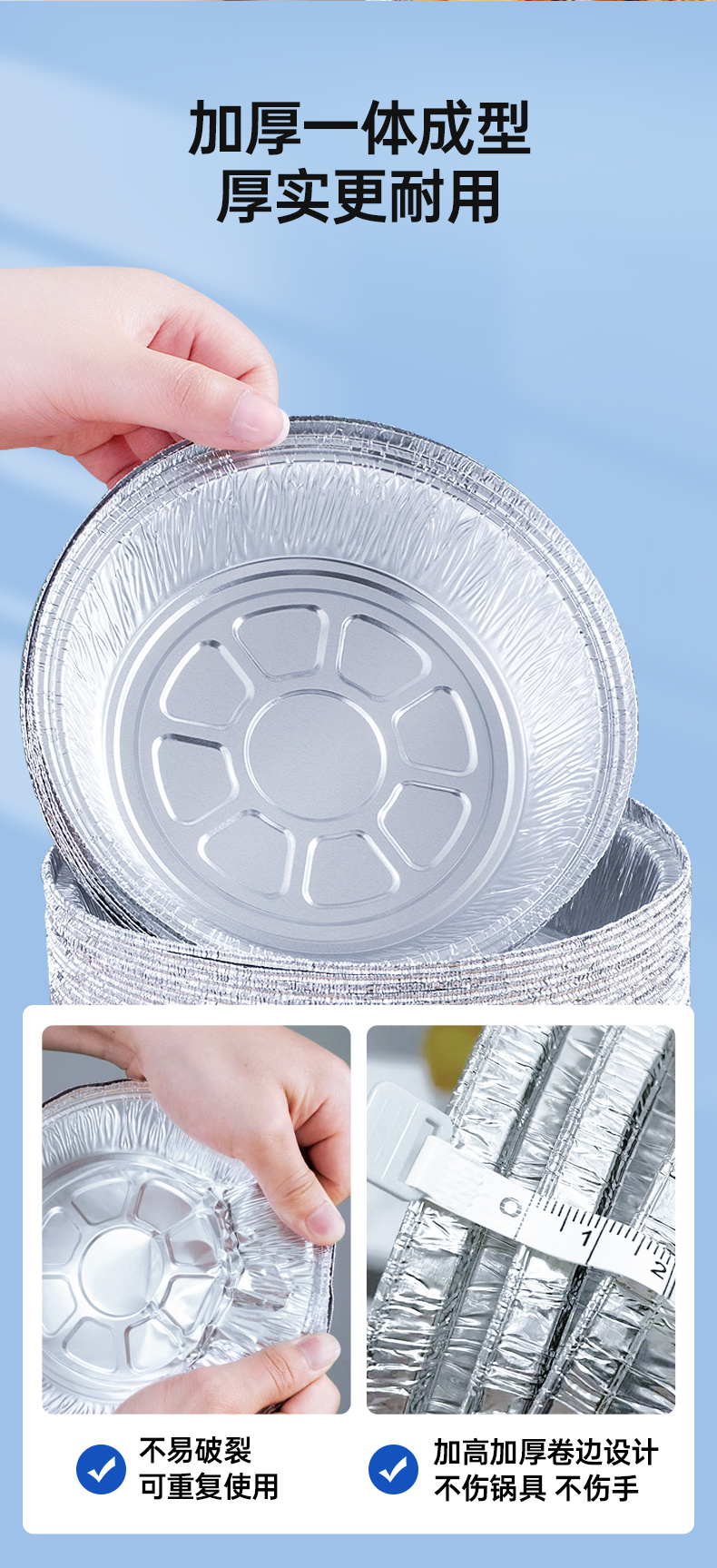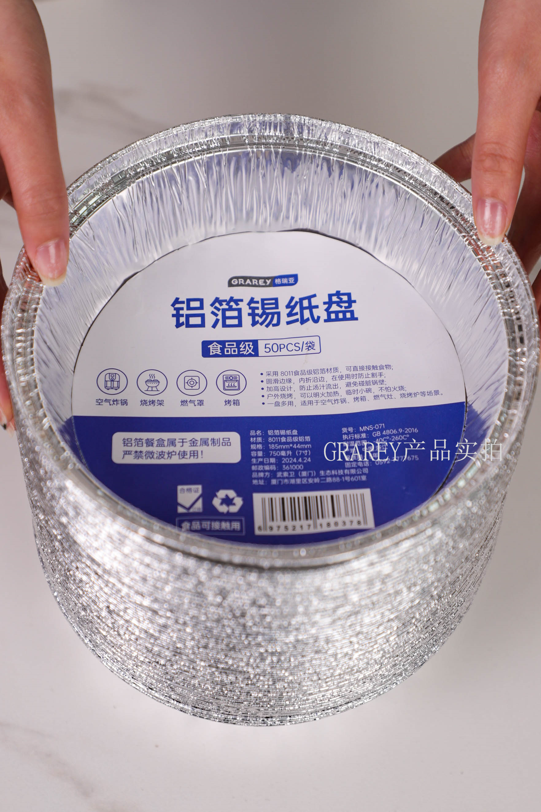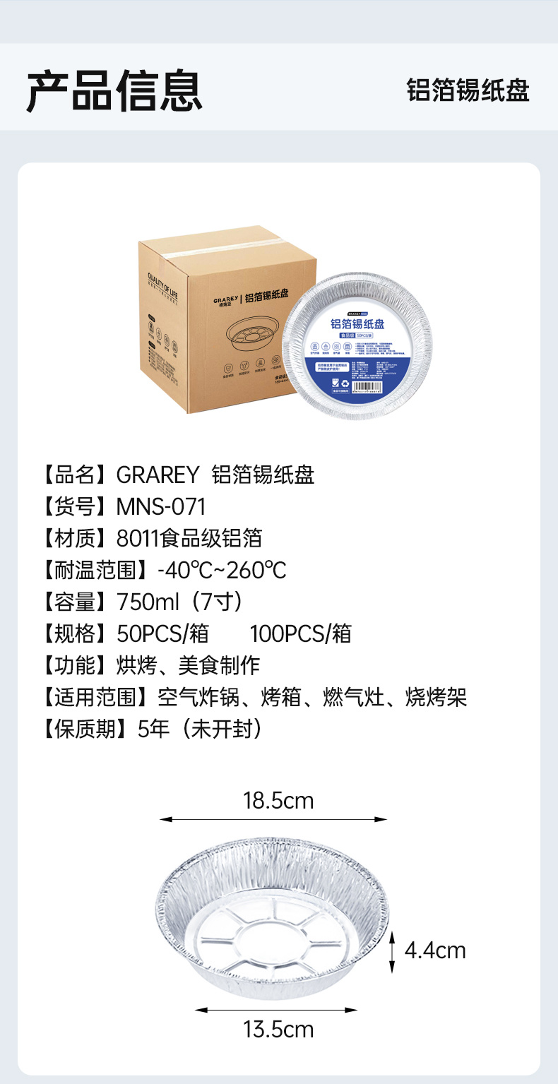 【品名】GRAREY铝箔锡纸盘 【材质】8011食品级铝箔 【规格】50PCS一箱/100PCS一箱 【尺寸】750ml(7寸) 【功能】烘焙、美食制作 【适用范围】空气炸锅、烤箱、燃气灶、烧烤架 【发货地】浙江 【发货快递】极兔、邮政 【发货时效】:48小时 【偏远加运费区域】:新疆、西藏+15元,内蒙古、宁夏、青海、甘肃+5元,其他包邮 【退换货标准】非质量问题退换邮费自理,拦截撤单扣5元运费 【售后标准】快递过程中造成轻微变形,不做售后,微小瑕疵不做质量问题处理,介意勿拍!
