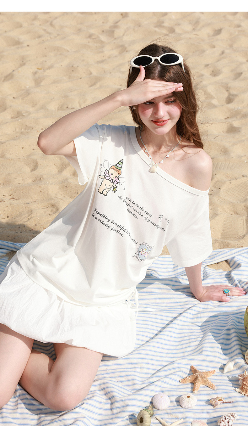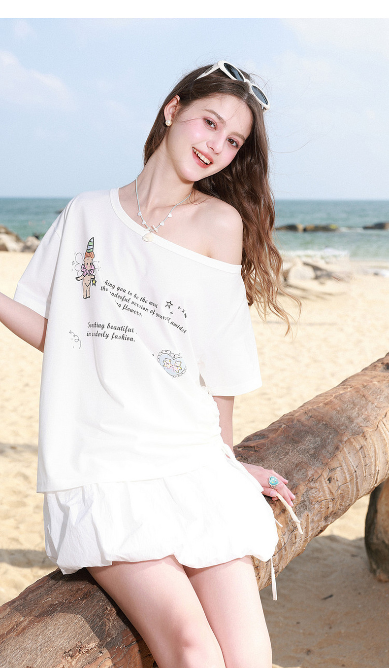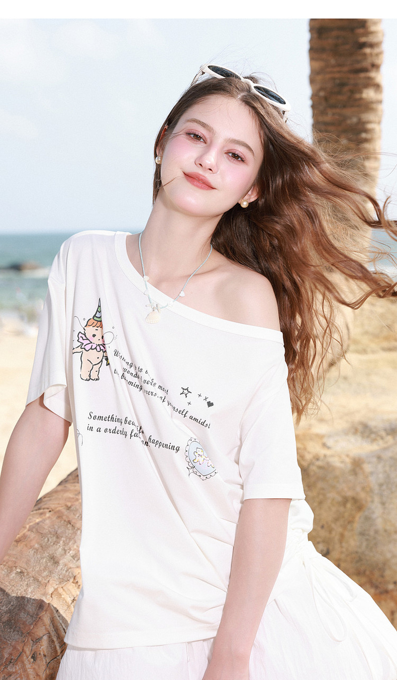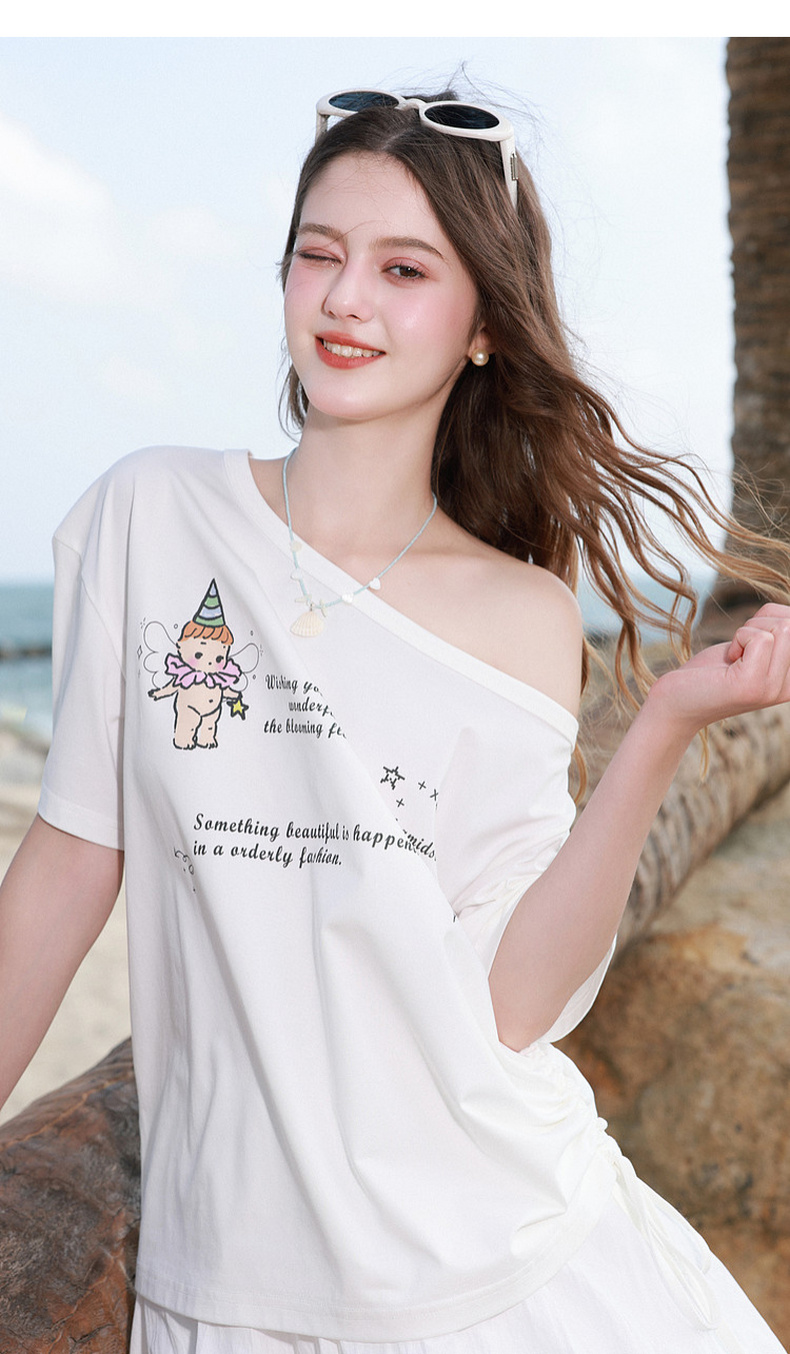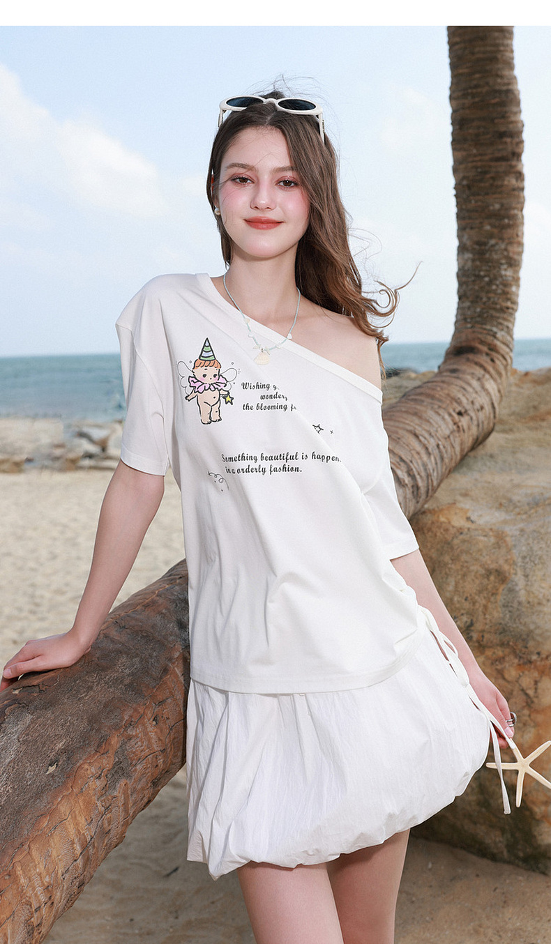 三彩独醒2026夏季新款字母印花露肩斜领T恤甜酷宽松短袖套头衫F