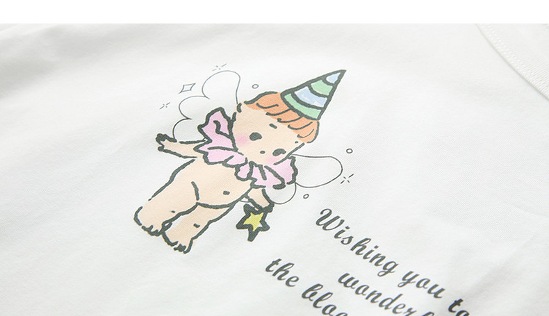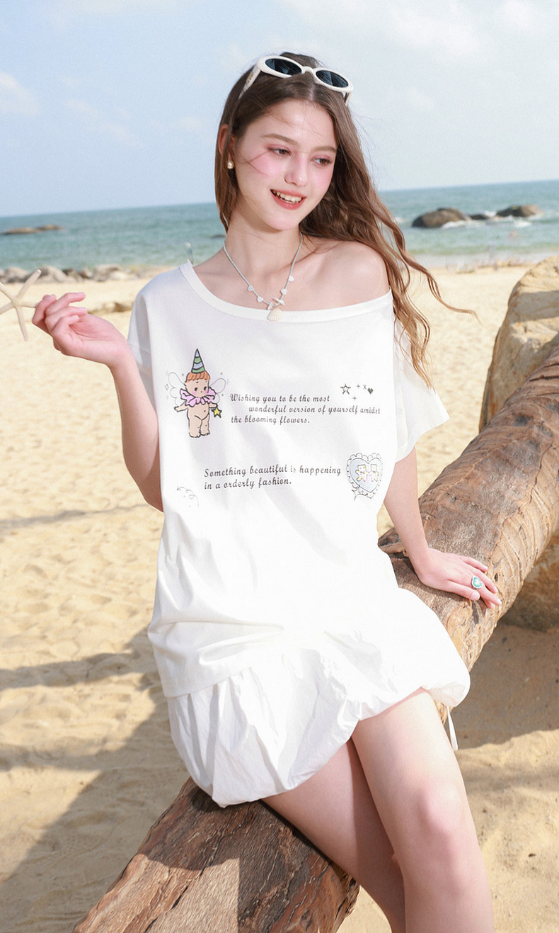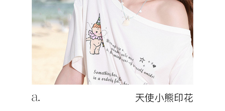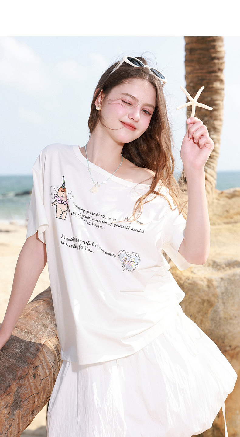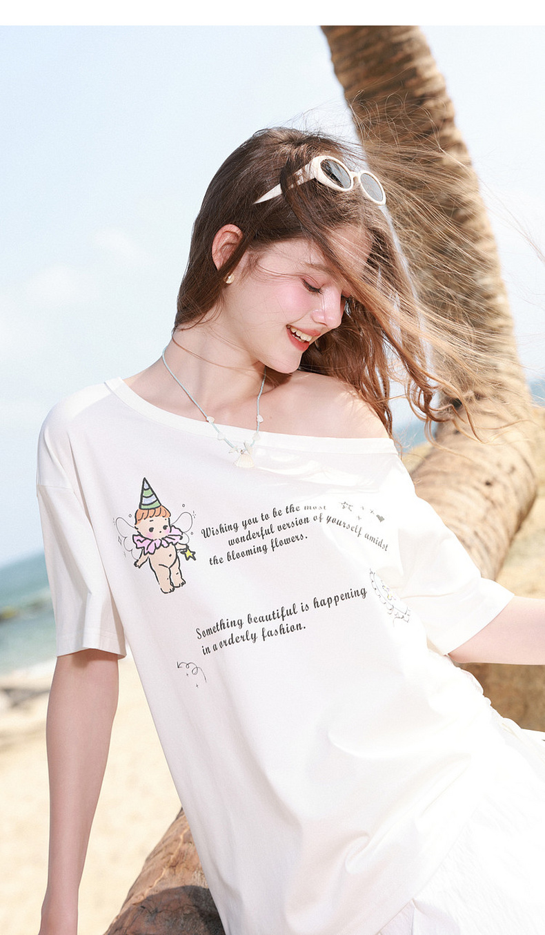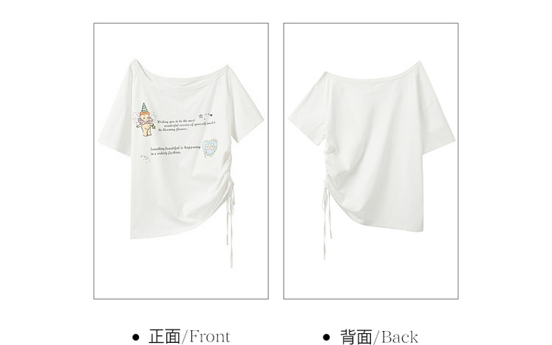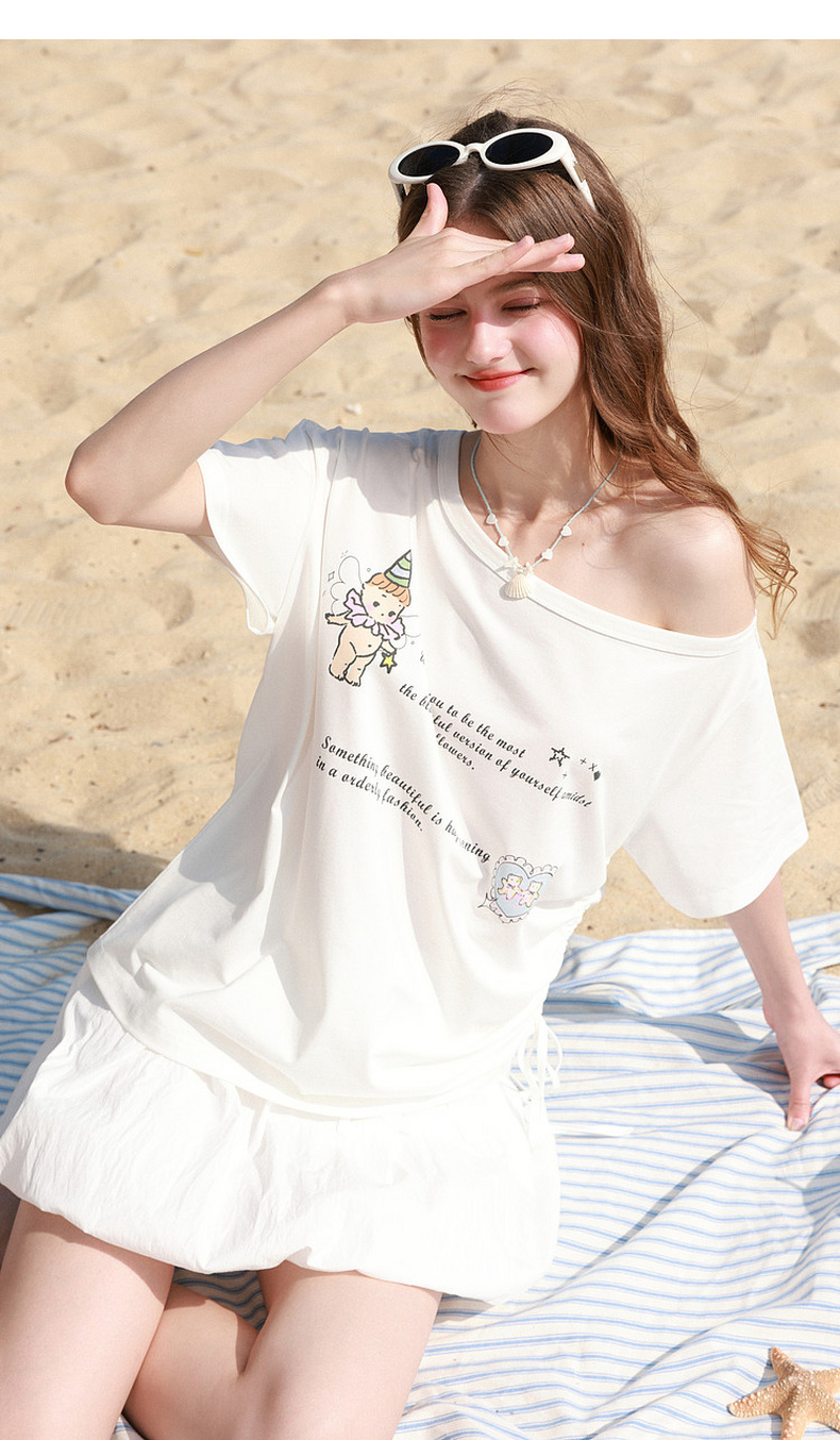三彩独醒2026夏季新款字母印花露肩斜领T恤甜酷宽松短袖套头衫F