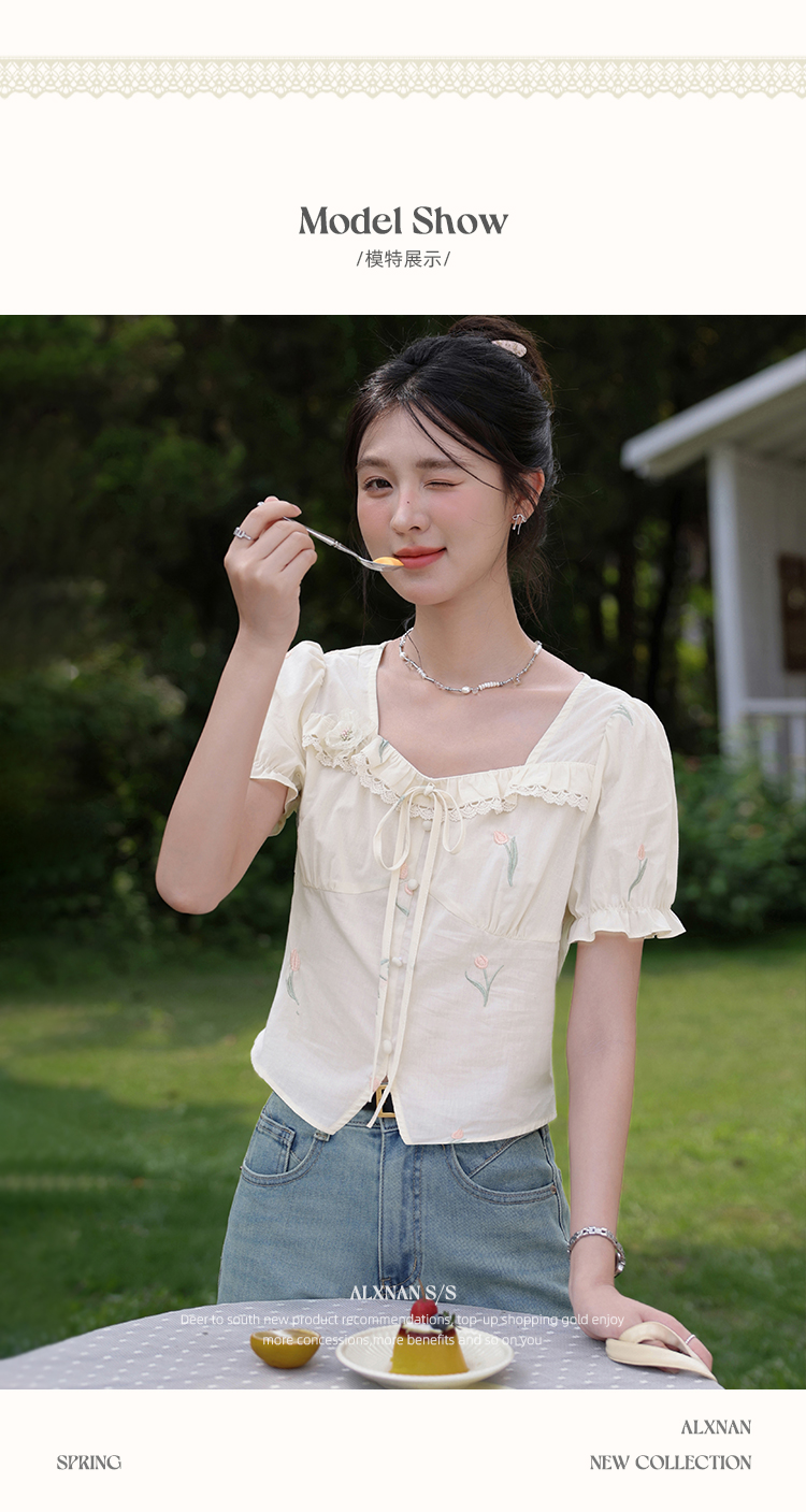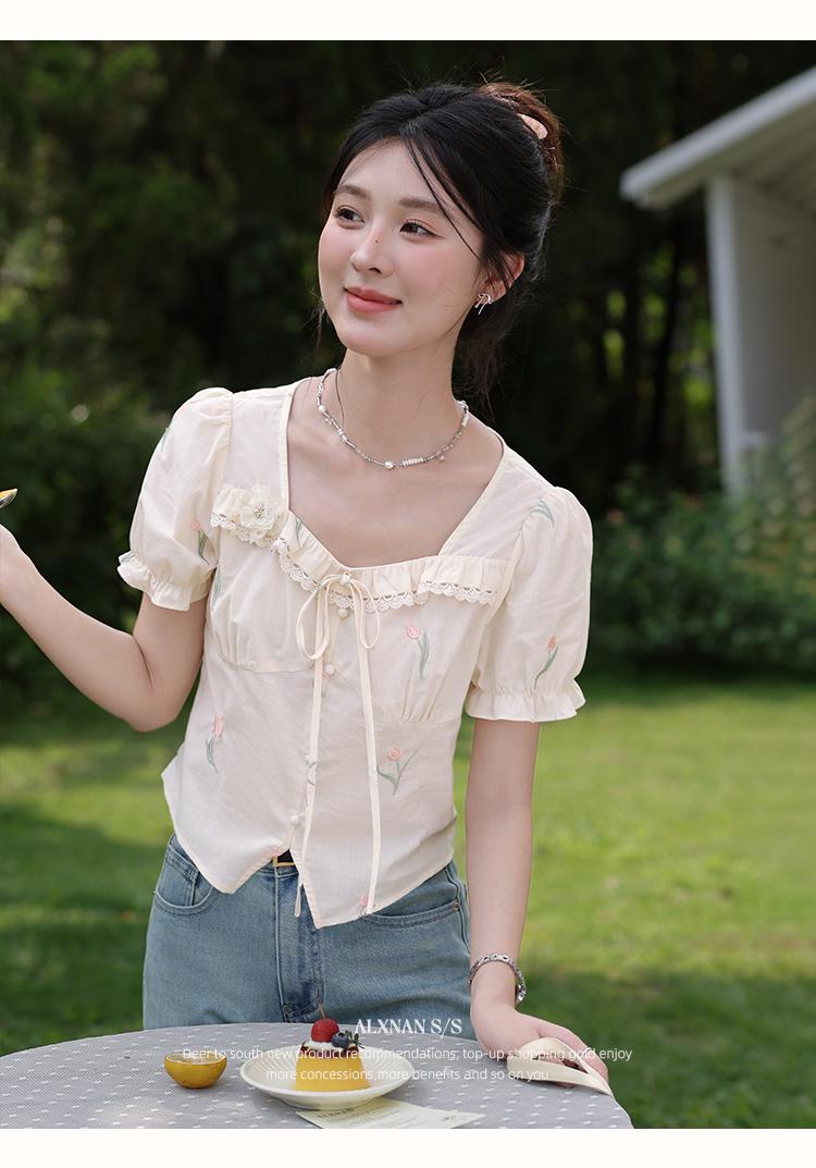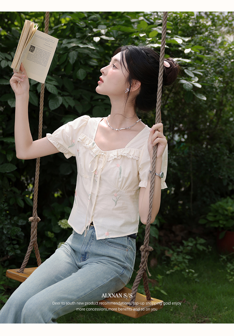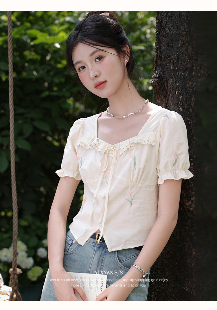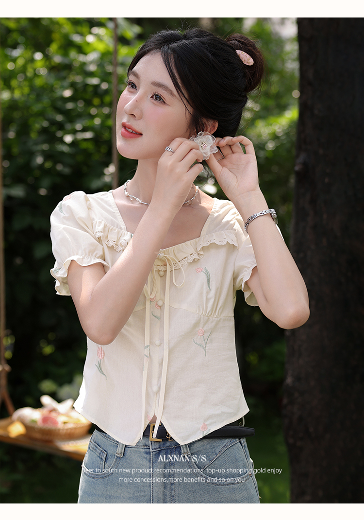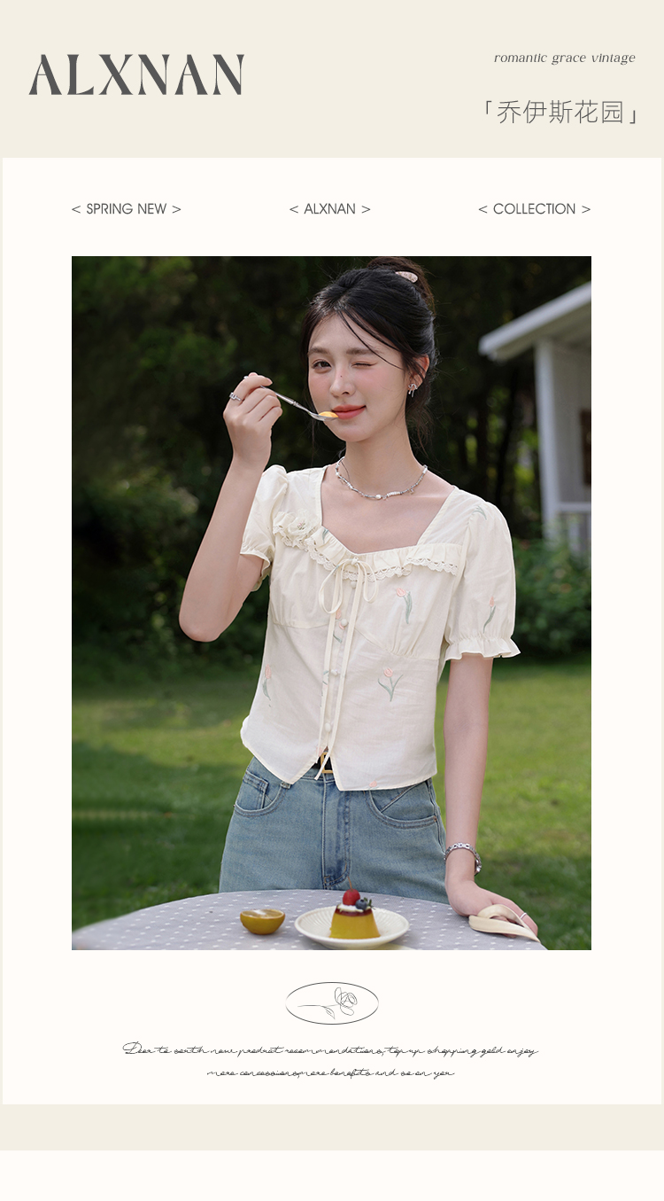 鹿向南「乔伊斯花园」杏色方领花边短袖T恤夏新款时尚通勤上衣女