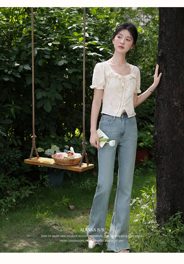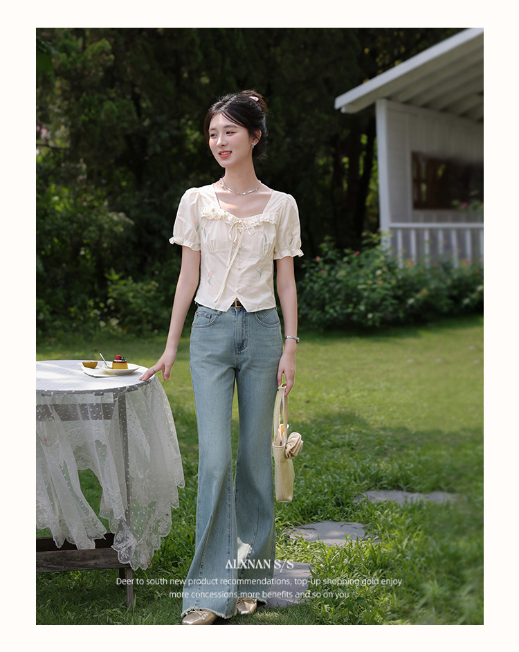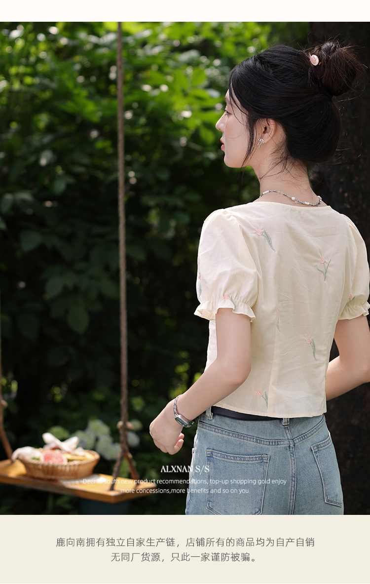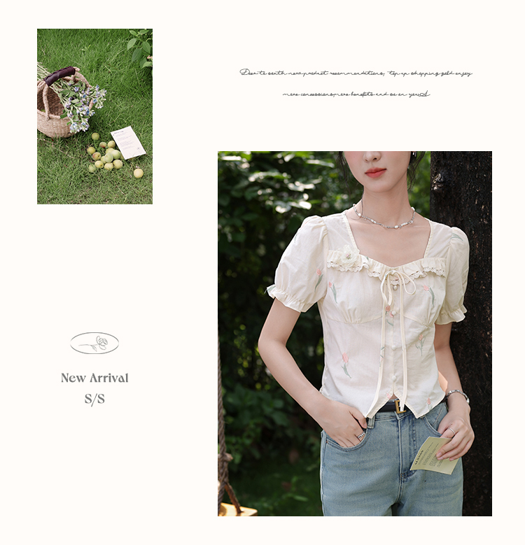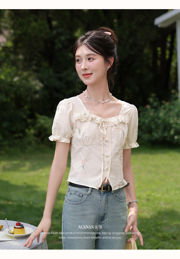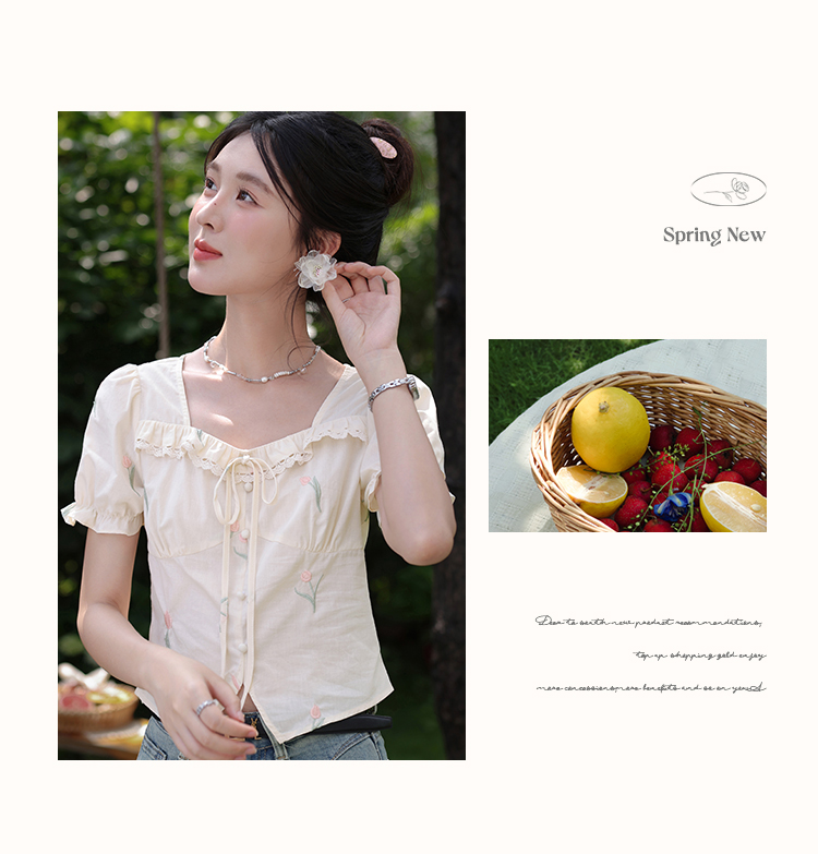 鹿向南「乔伊斯花园」杏色方领花边短袖T恤夏新款时尚通勤上衣女