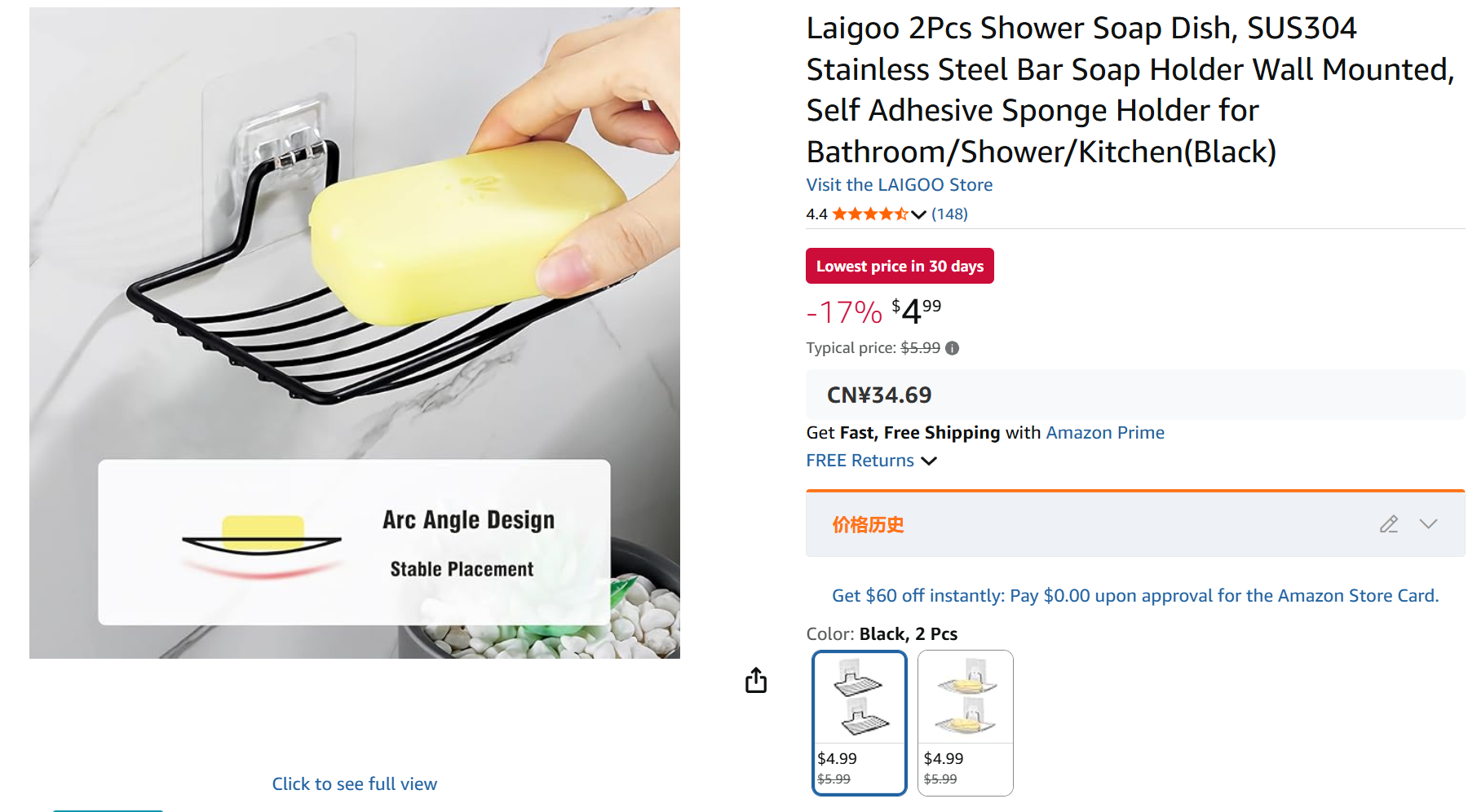 【2个装】美国 LAIGOO 304不锈钢肥皂架 自粘式置物架