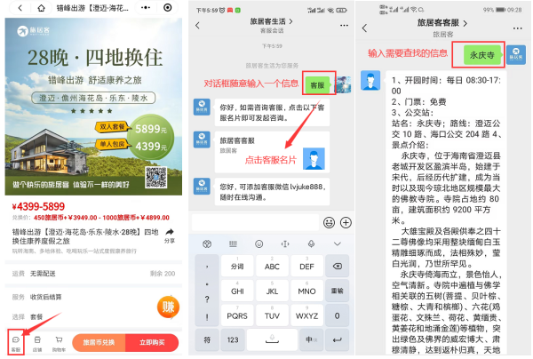 以上游玩攻略仅供参考,了解更多景点信息,详情咨询:产品左下角“客服”→在对话框随意输入一个信息→点击跳转出来的客服名片→输入想要咨询的信息即可。具体操作步骤如下图所示。