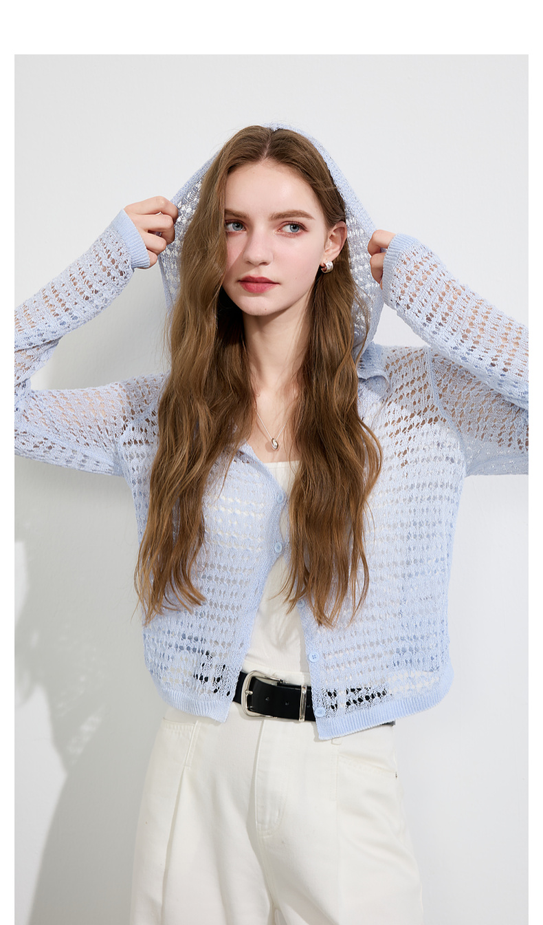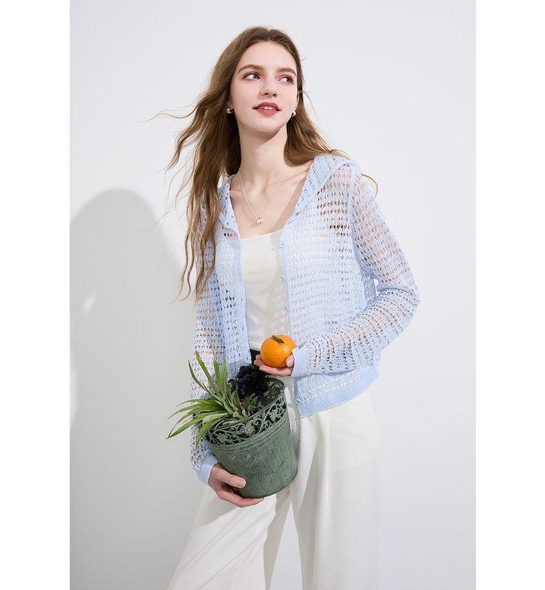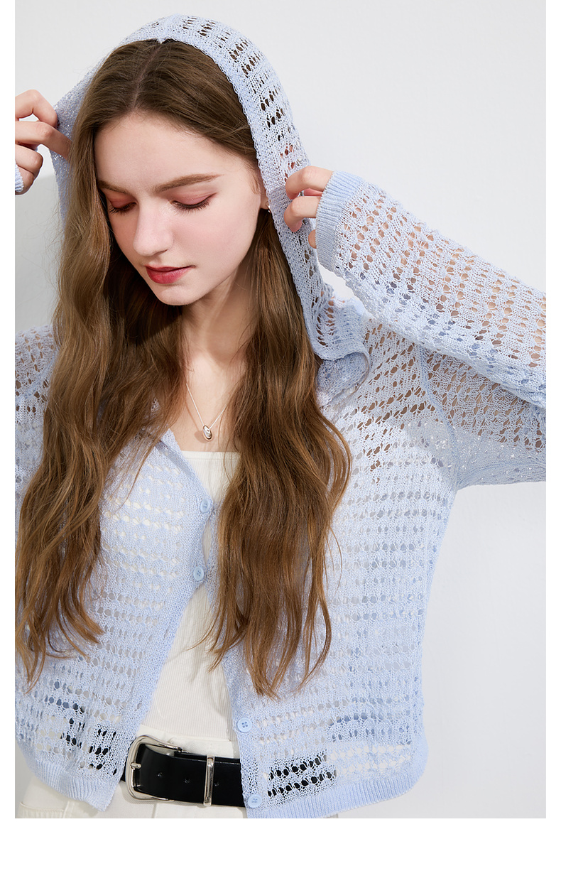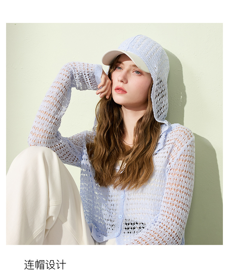 三彩2025夏季新款镂空针织衫连帽开衫外套轻薄罩衫长袖M