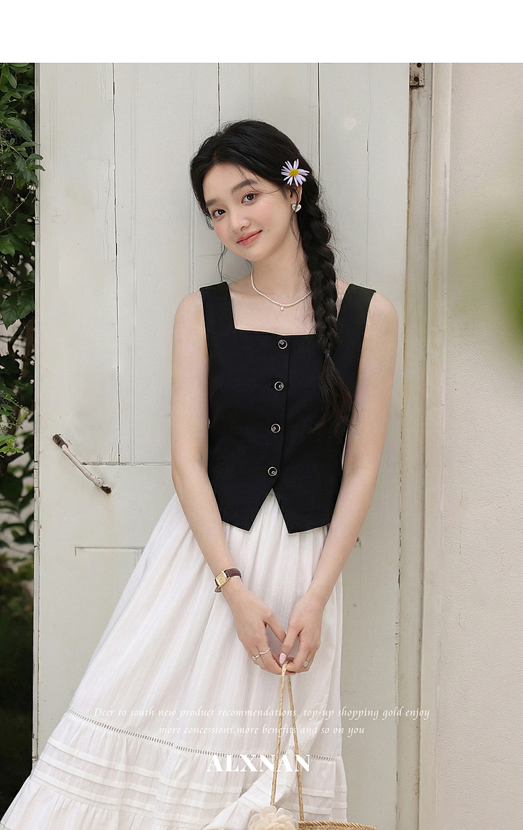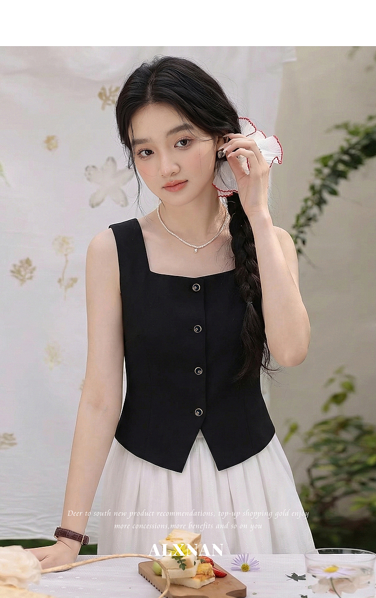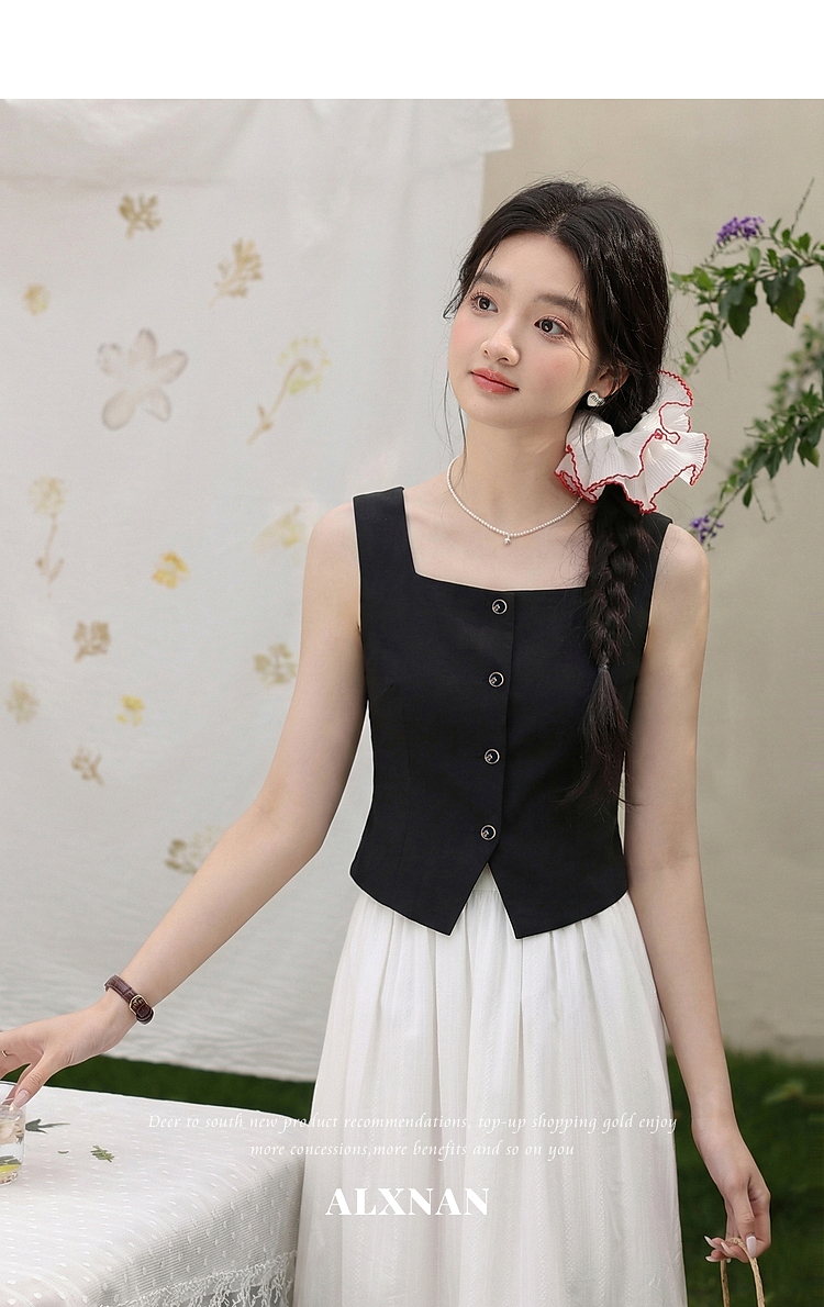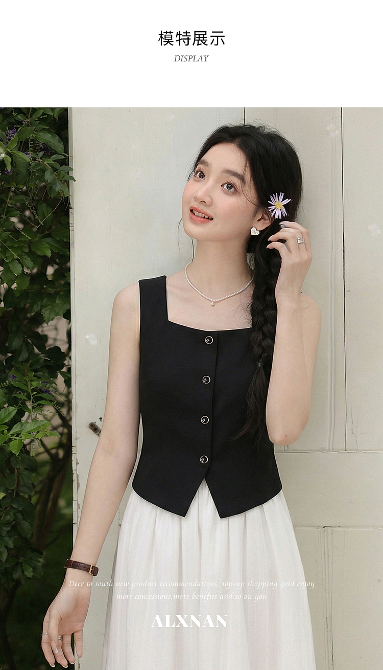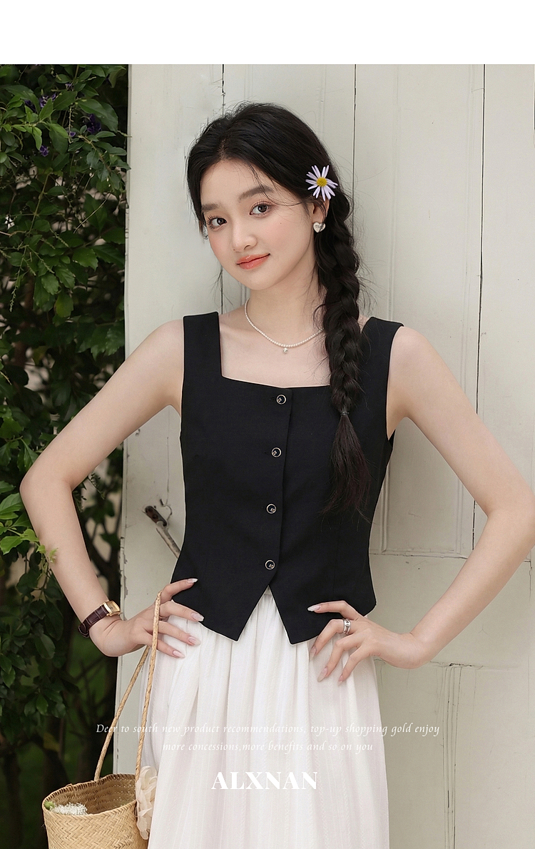 鹿向南「复古黑茶」黑色背心吊带女夏季新款开叉显瘦短款内搭上衣