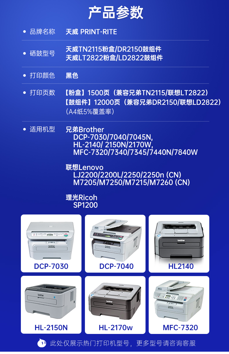 天威 TN2115粉盒 适用兄弟DCP7030 7040 7045N HL2140 2150 2170 打印硒鼓MFC7320 73407345 7440 7840墨盒