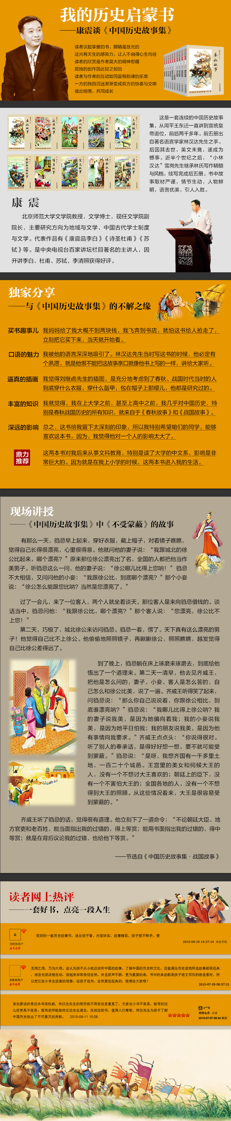 中国的历史悠久、深厚,那么多人物和事件,要给少儿读者讲起来的确不容易;要让他们有兴趣看,能够明白、记住更是个难事。林汉达先生在书里,没有就事论事地照搬正史去讲历史,而是从春秋到清朝这两千多年的历史里,精心选择出数百个故事,讲给小读者听。这些故事里既有人物又有事件;既有金戈铁马、波澜壮阔的战争大场面,也有绵里藏针、斗智斗勇的小细节,方方面面,把这段历史中,少年儿童应该了解知道的人物和事件,都囊括在里面。读者通过这些故事,就能了解这段历史的基本概貌,激起他们想进一步了解和学习中国历史的愿望。正像一位网友说的那样,许多人就是通过读《中国历史故事集》这套书,才喜欢上历史,甚至选择学习历史专业的。《中国历史故事集》是他“见到的*棒的历史普及读物”。