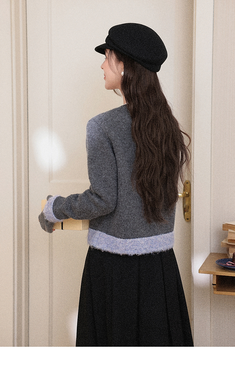 鹿向南「巴黎慢调」复古花灰色长袖毛衣女秋冬撞色设计感针织开衫