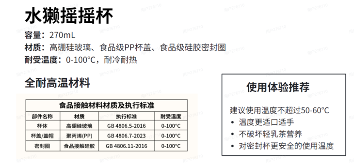 整套一体耐高温 ✔️杯身高硼硅玻璃杯 可以装0-100℃,冷热皆宜,符合大多数暖饮温度 ✔️杯盖PP材质 加热水不易变形,可以用很久