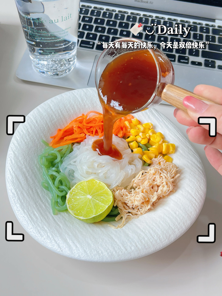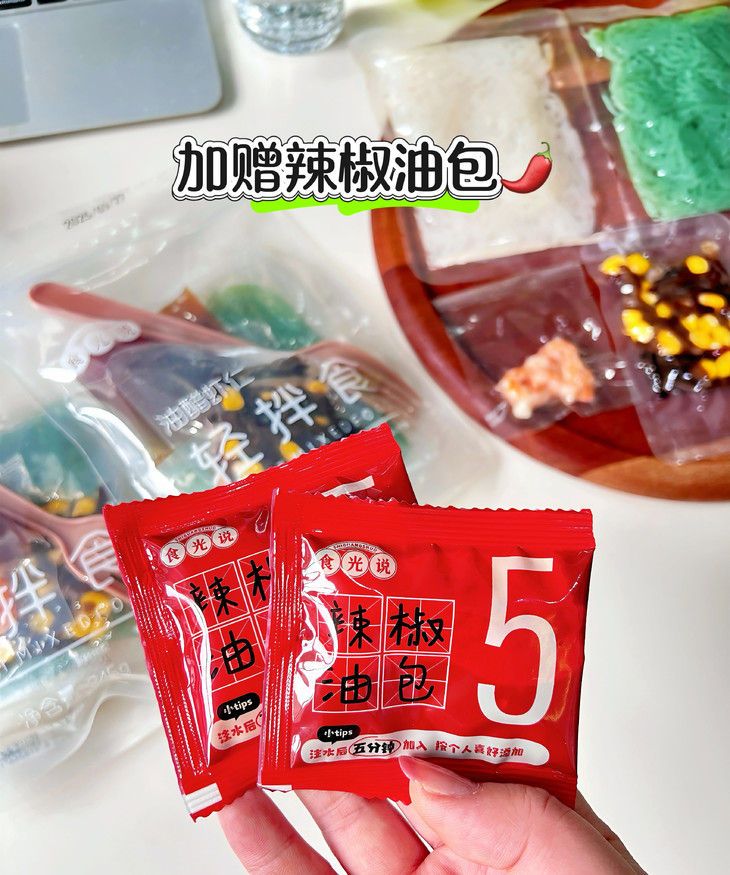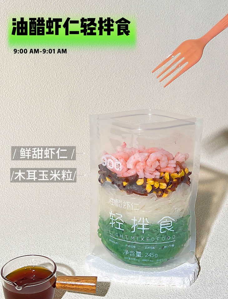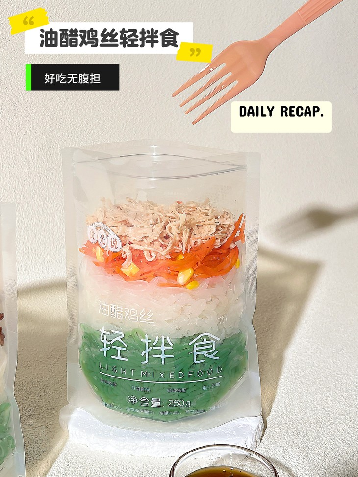 0脂酱汁自由炫,告别油腻感 这款轻拌食搭配的0脂油醋汁堪称灵魂! 打开包装,醋香、果香瞬间扑鼻而来。 淋在面上,搅拌均匀, 每一口都酸爽开胃。 有了它, 吃轻食不再寡淡, 减脂期也能畅享美味, 告别油腻感。