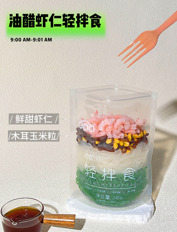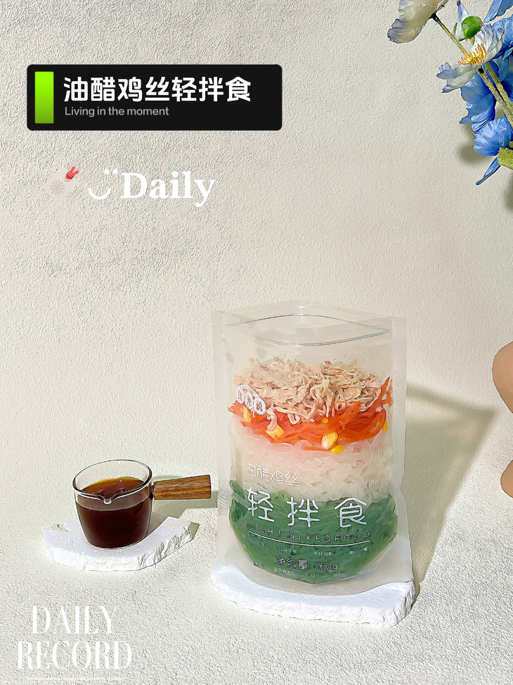 3分钟极速开餐,懒人必备 最让我心动的是它的便捷性。 采用免煮即食设计, 运用独立分装锁鲜技术, 最大程度保留食材新鲜度。 加班到深夜、 出差赶行程, 或是宅家不想做饭, 只要撕开包装, 简单搅拌, 3分钟就能吃上健康美味的轻拌食, 冷热都好吃, 轻松拿捏健康饮食。