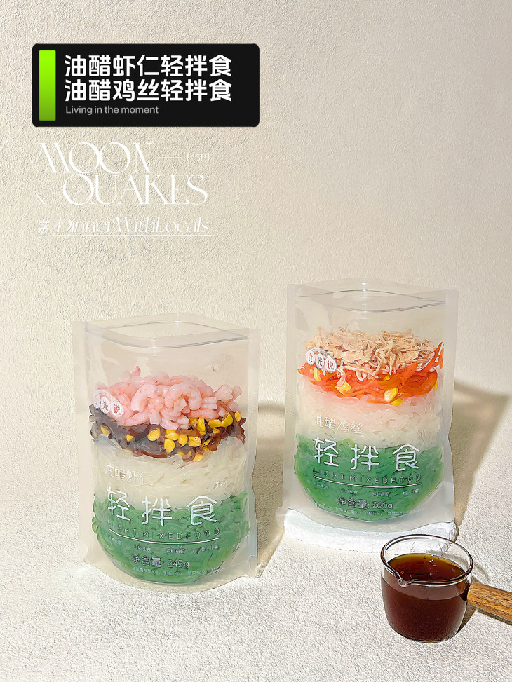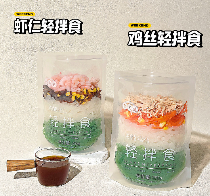 产品名称:皇饿吗&食光说轻拌食 产品口味:油醋虾仁245g/袋 油醋鸡丝260g/袋 保质期:6个月 生产地:浙江省温州市
