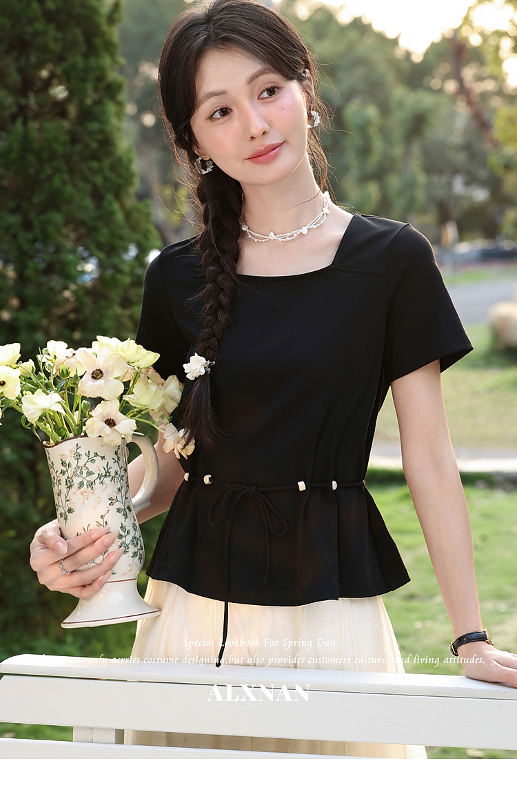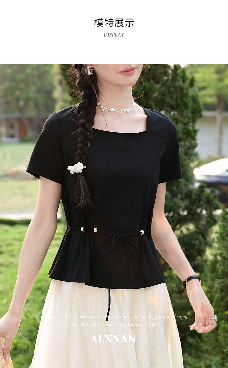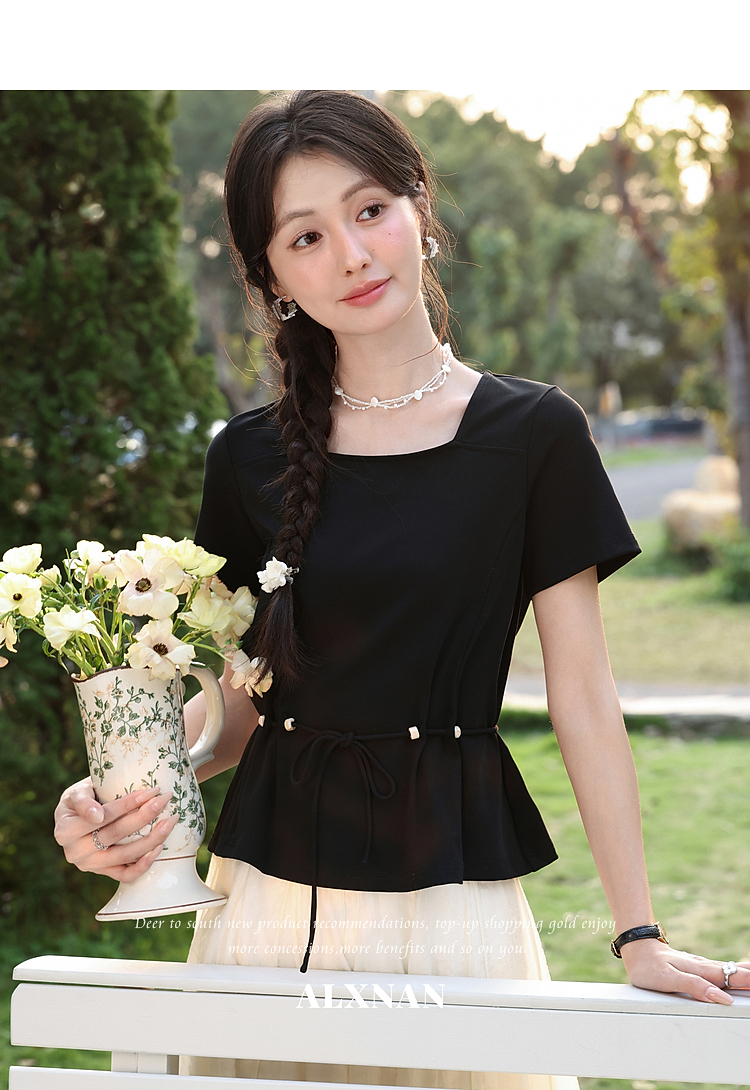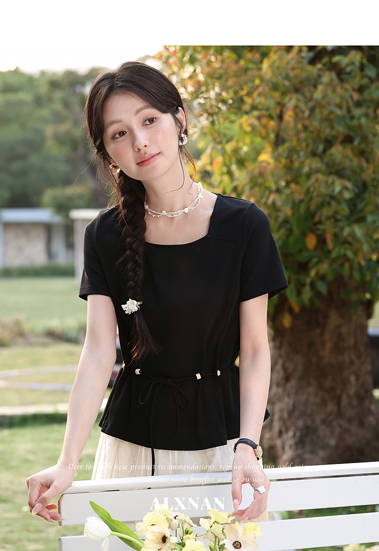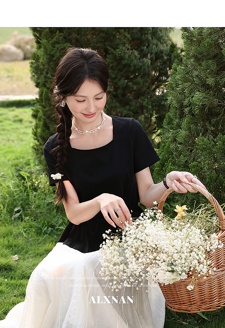 鹿向南【0417/20:00新品前1小时7折限量100件】气质方领黑色T恤女