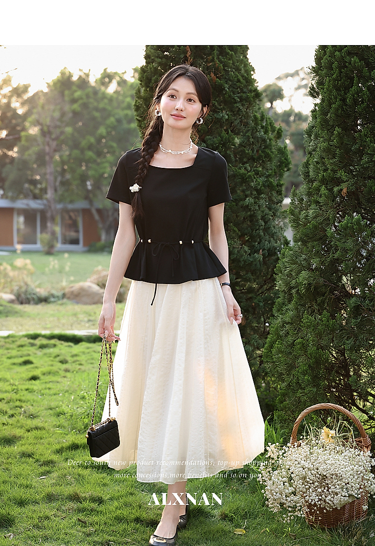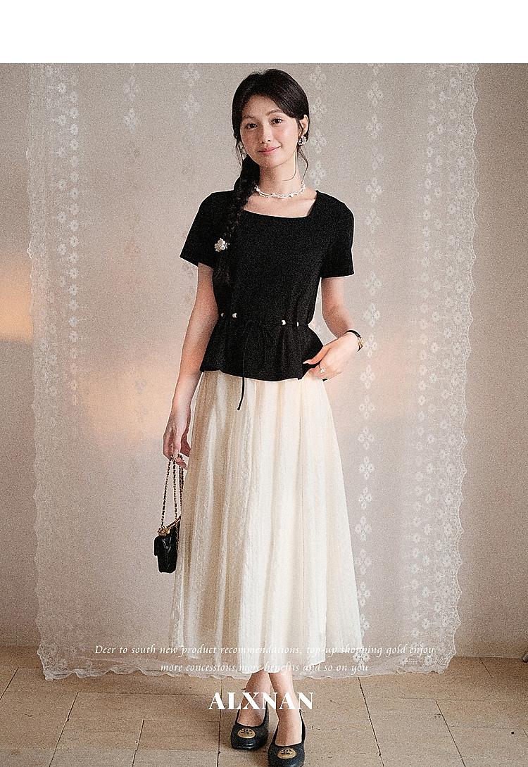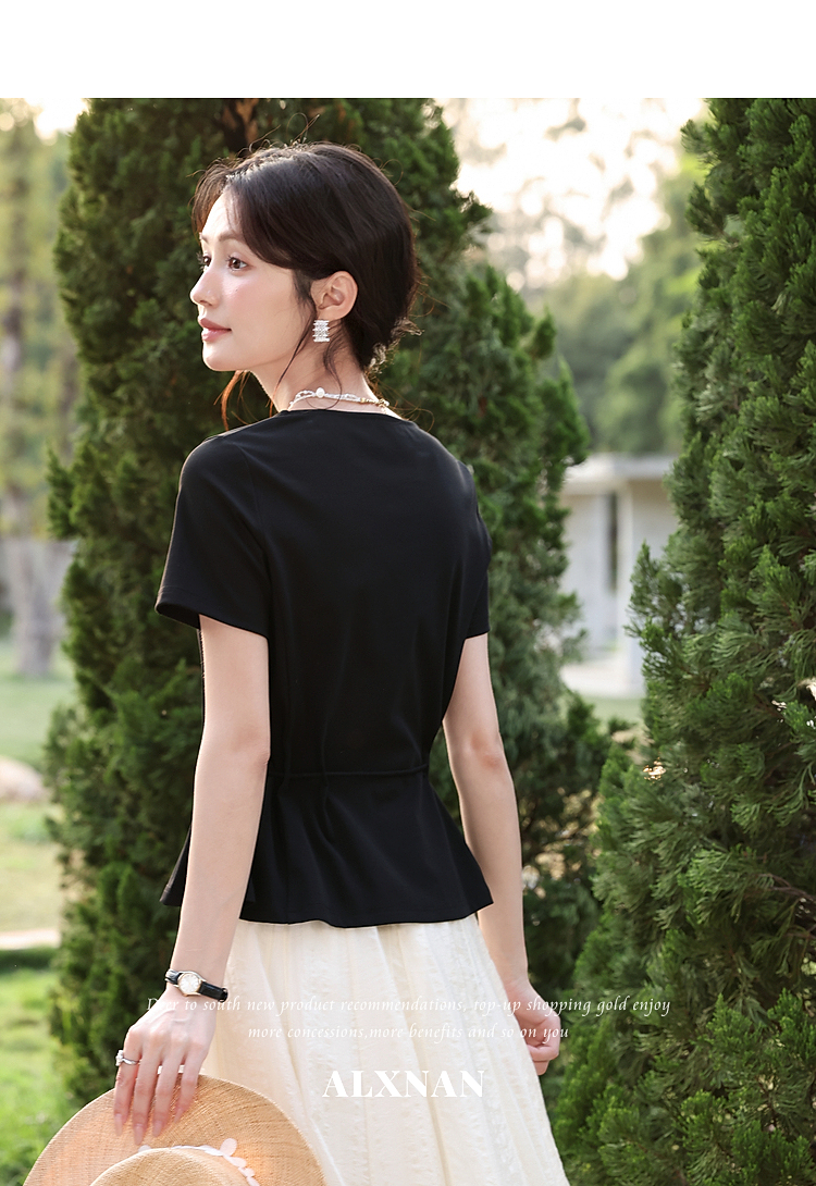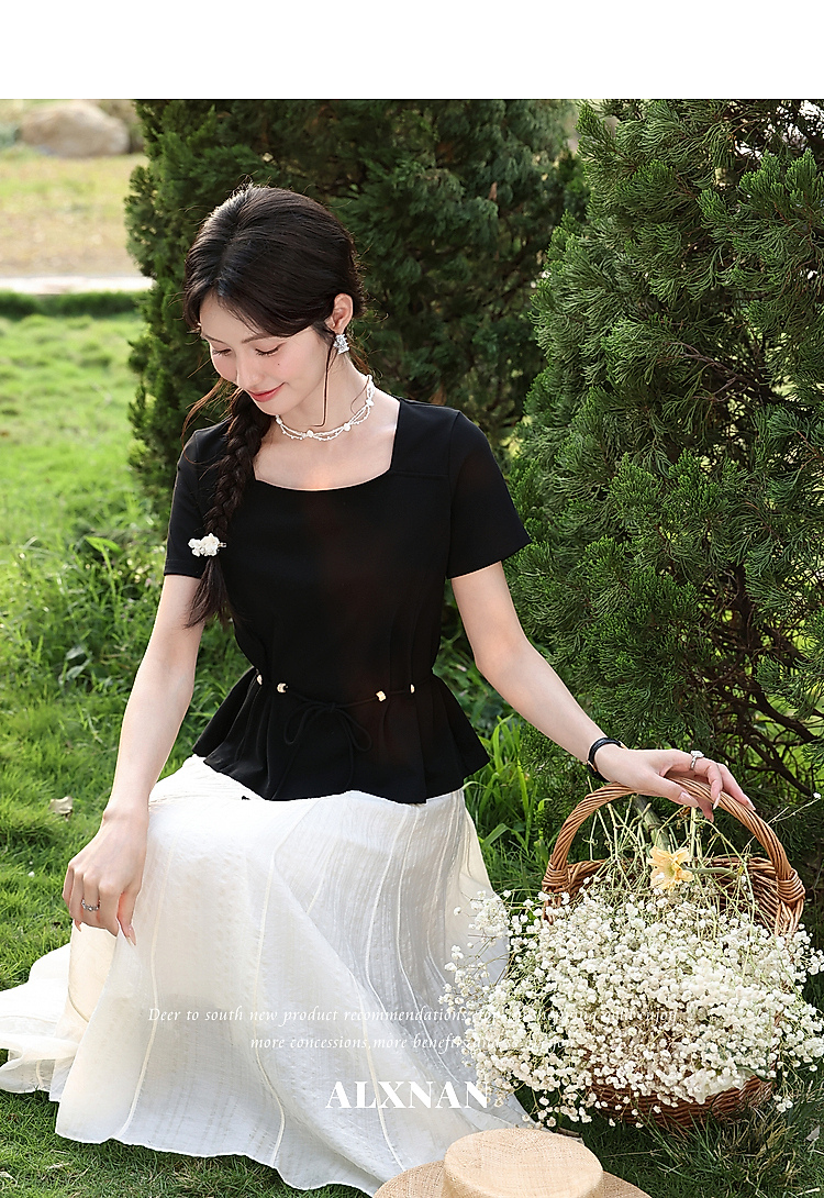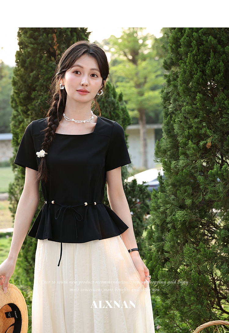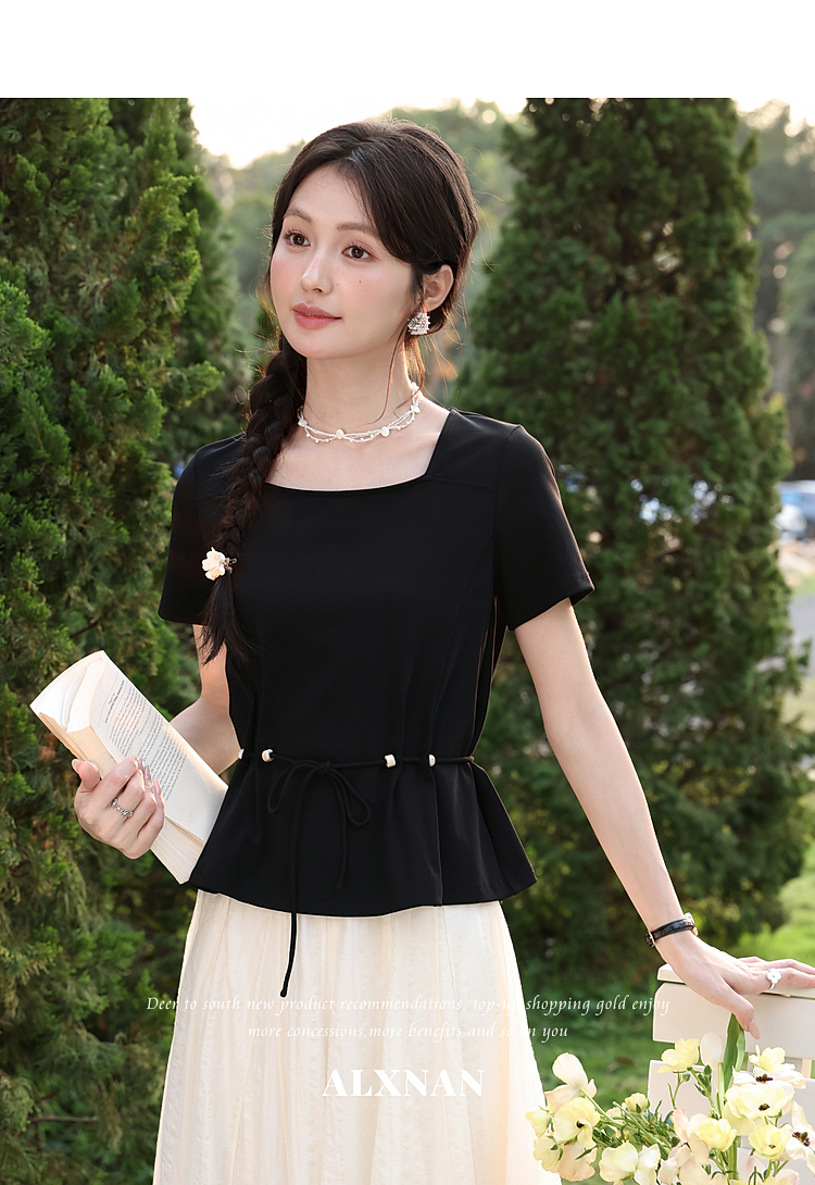 鹿向南【0417/20:00新品前1小时7折限量100件】气质方领黑色T恤女